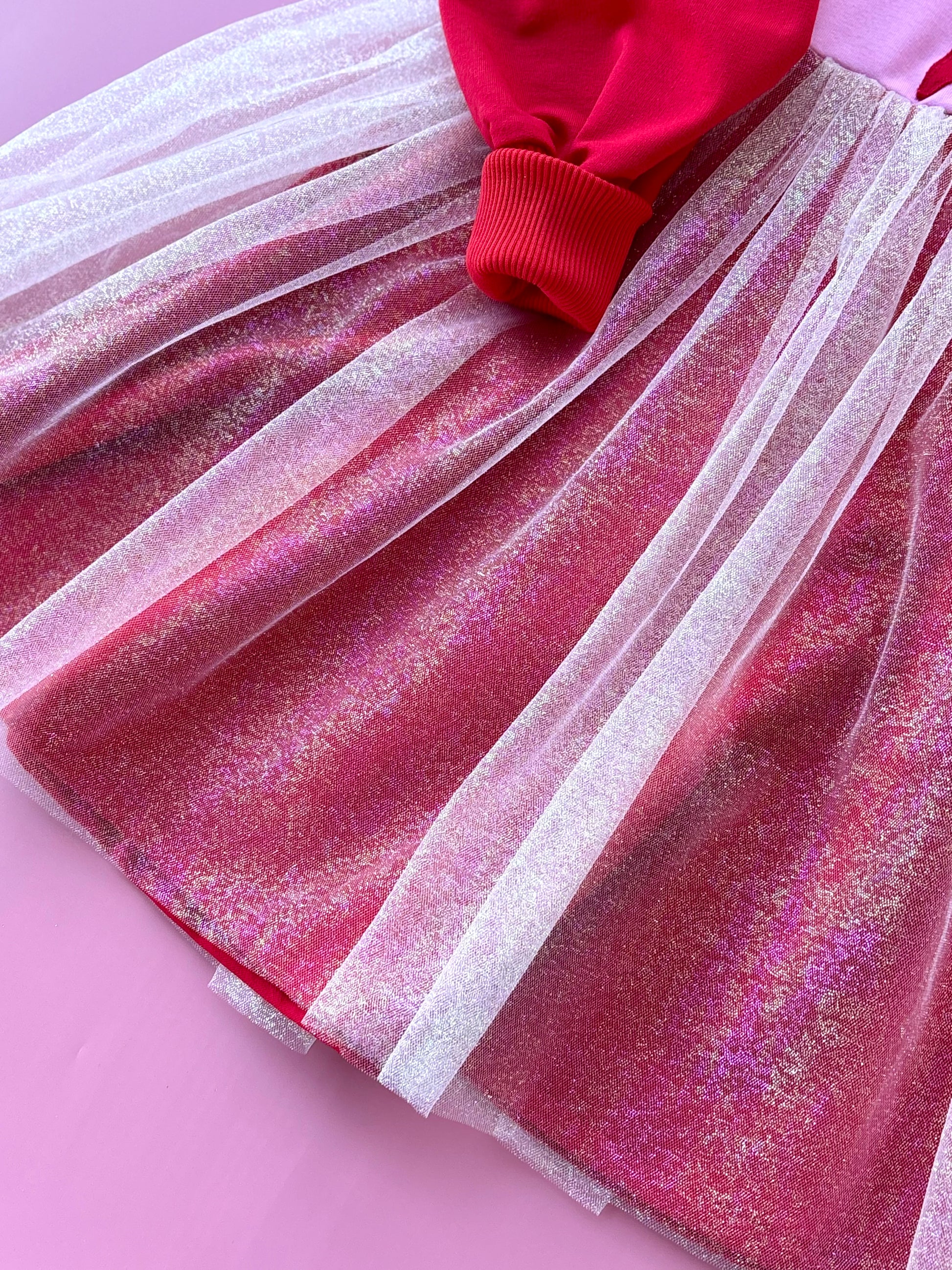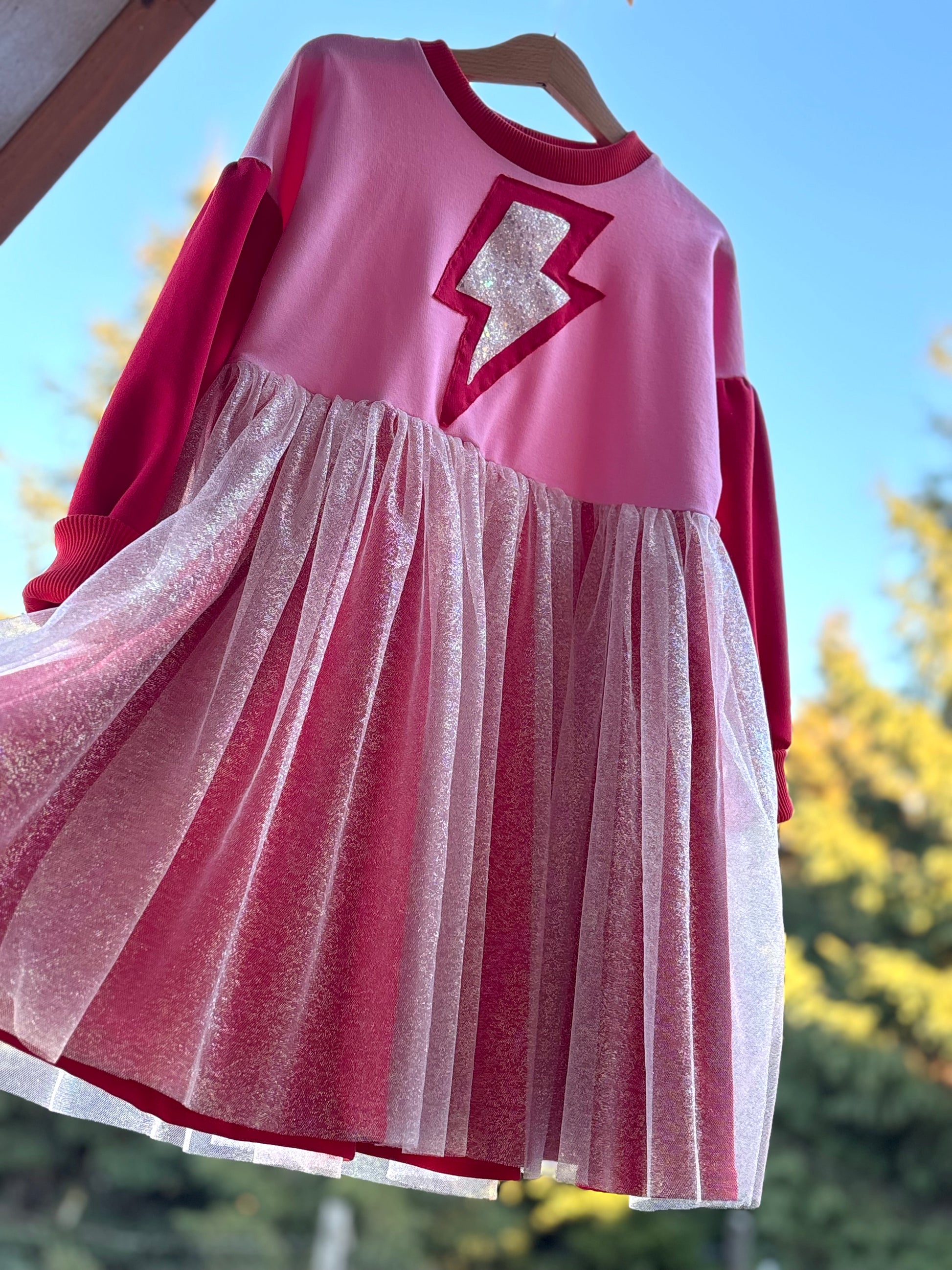 This superhero girl's dress is a real favorite with its vibrant red-pink color scheme and retro vibe. The shimmering tulle skirt gives the dress fabulous movement while providing a playful and spectacular look.