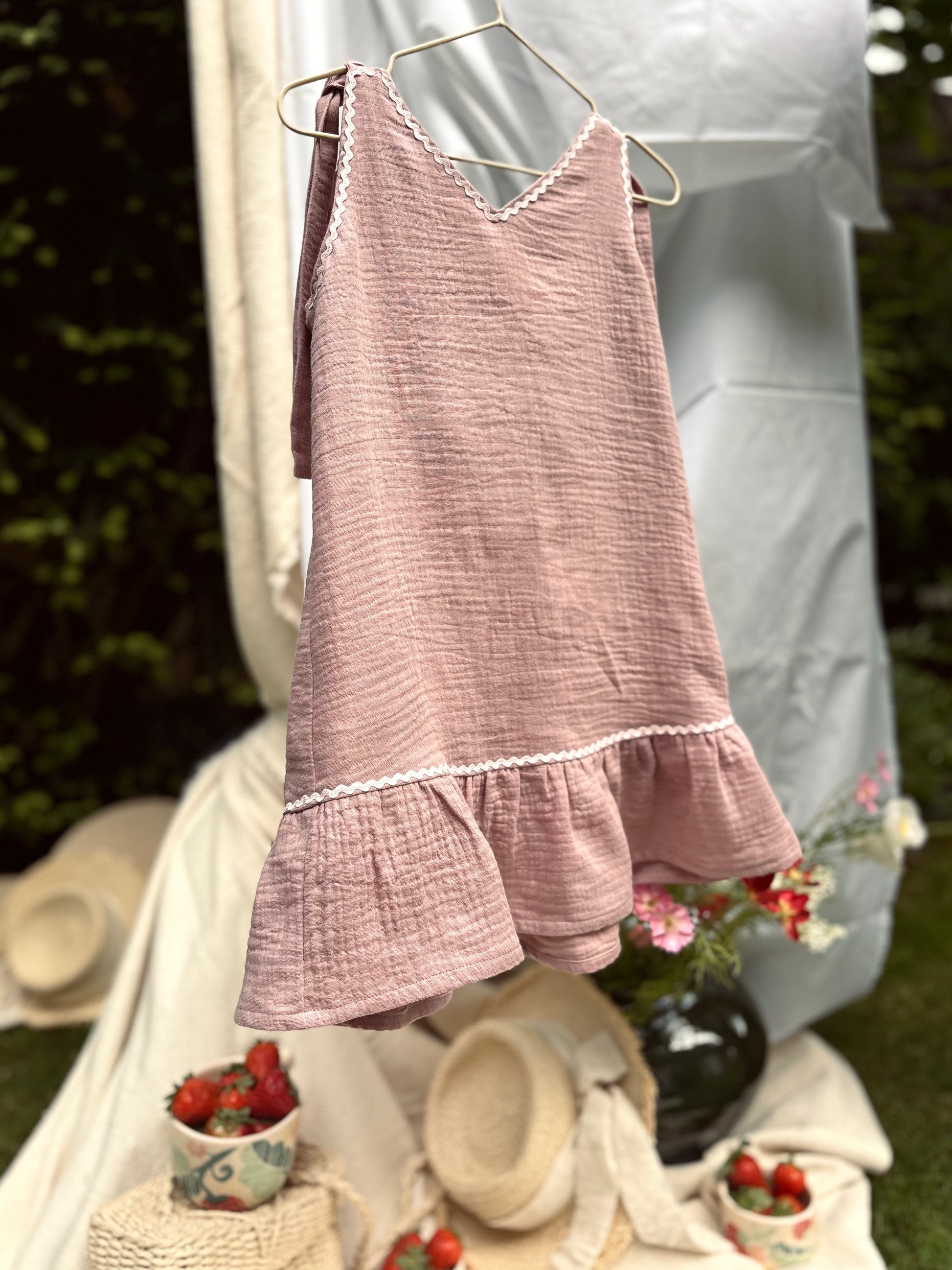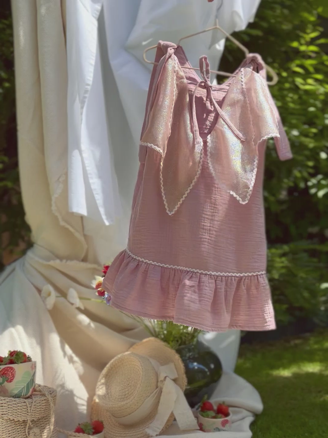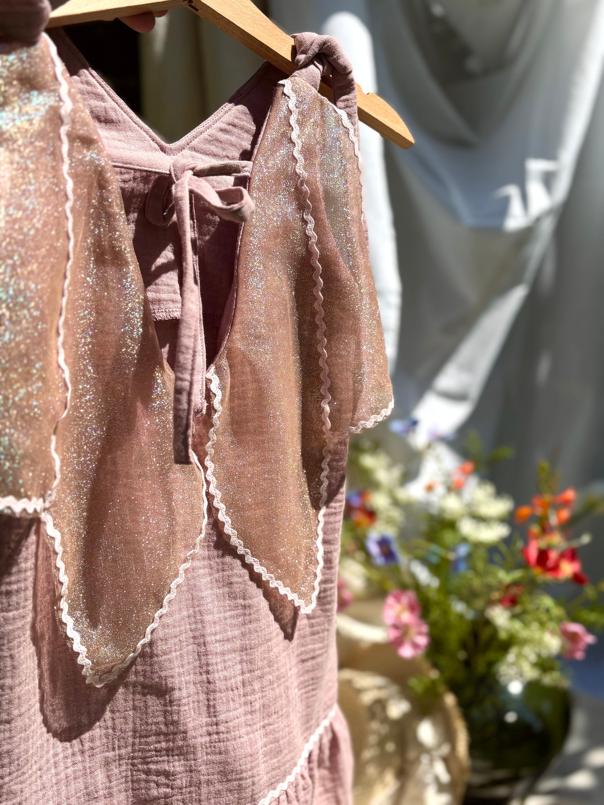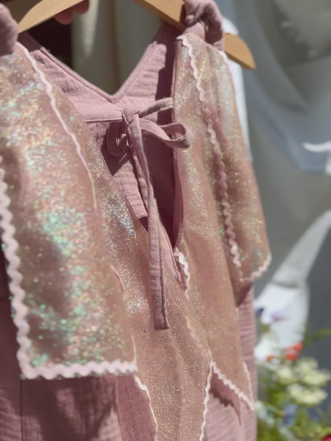 Ujjatlan, könnyű dupla géz pamutból készült, enyhén csillogó felülettel – hogy minden kislány úgy érezze magát, mintha egy mesebeli erdő tündére lenne. A ruha hátán csillogó tüllből és csipkéből készült szárny lebeg, amely mozgás közben életre kel – és ha a szél is megérinti, szinte repülni kezd.