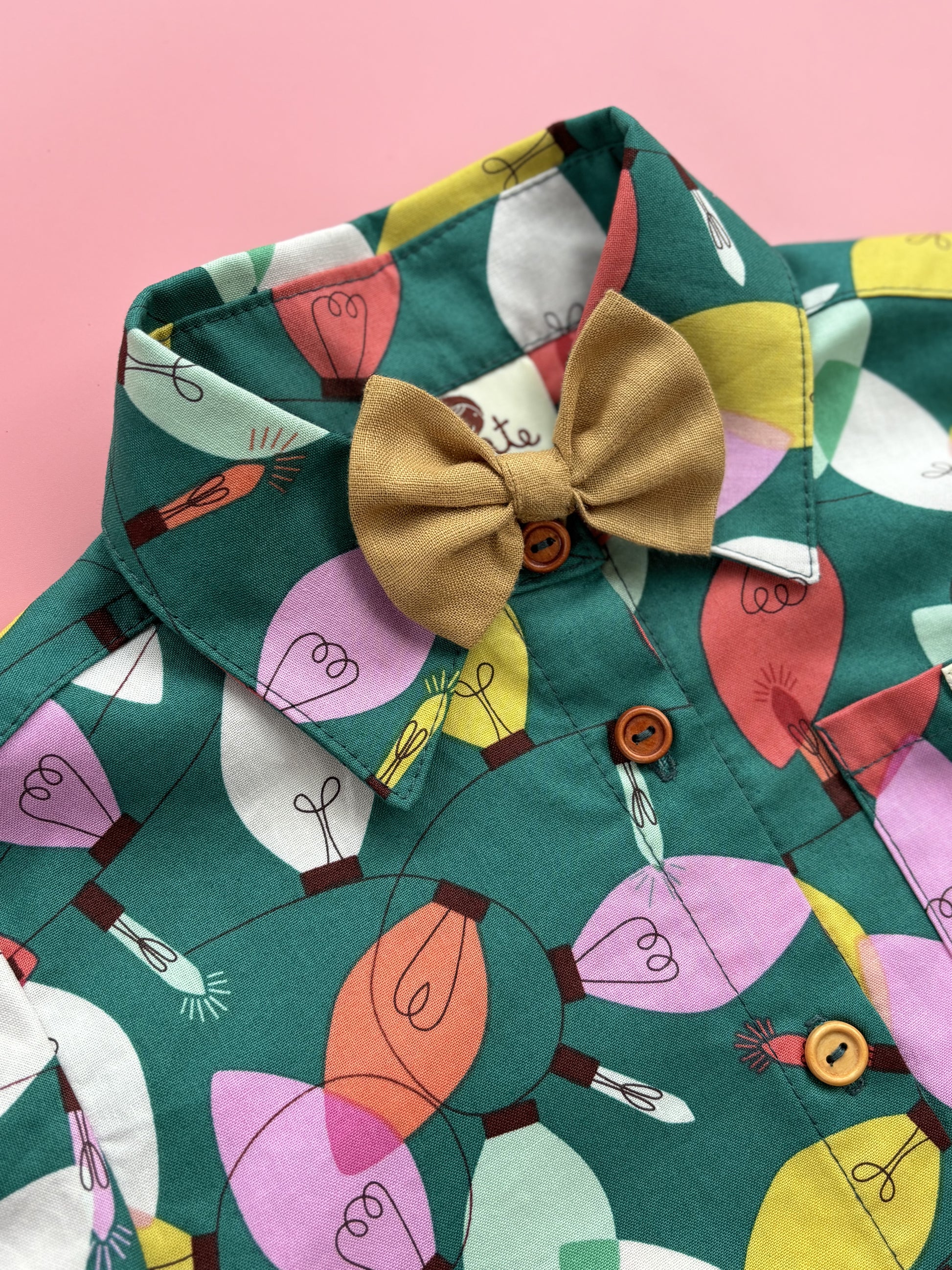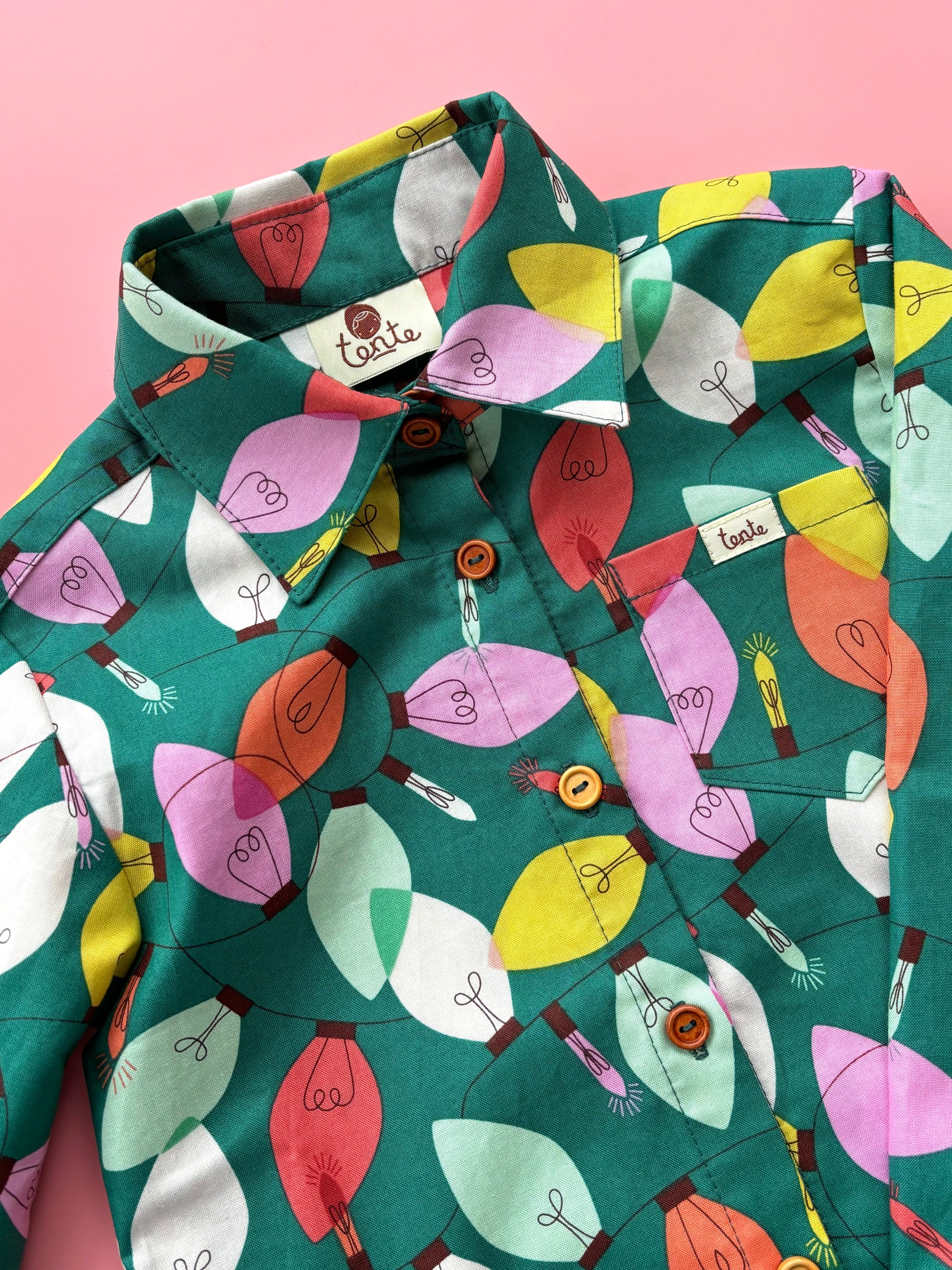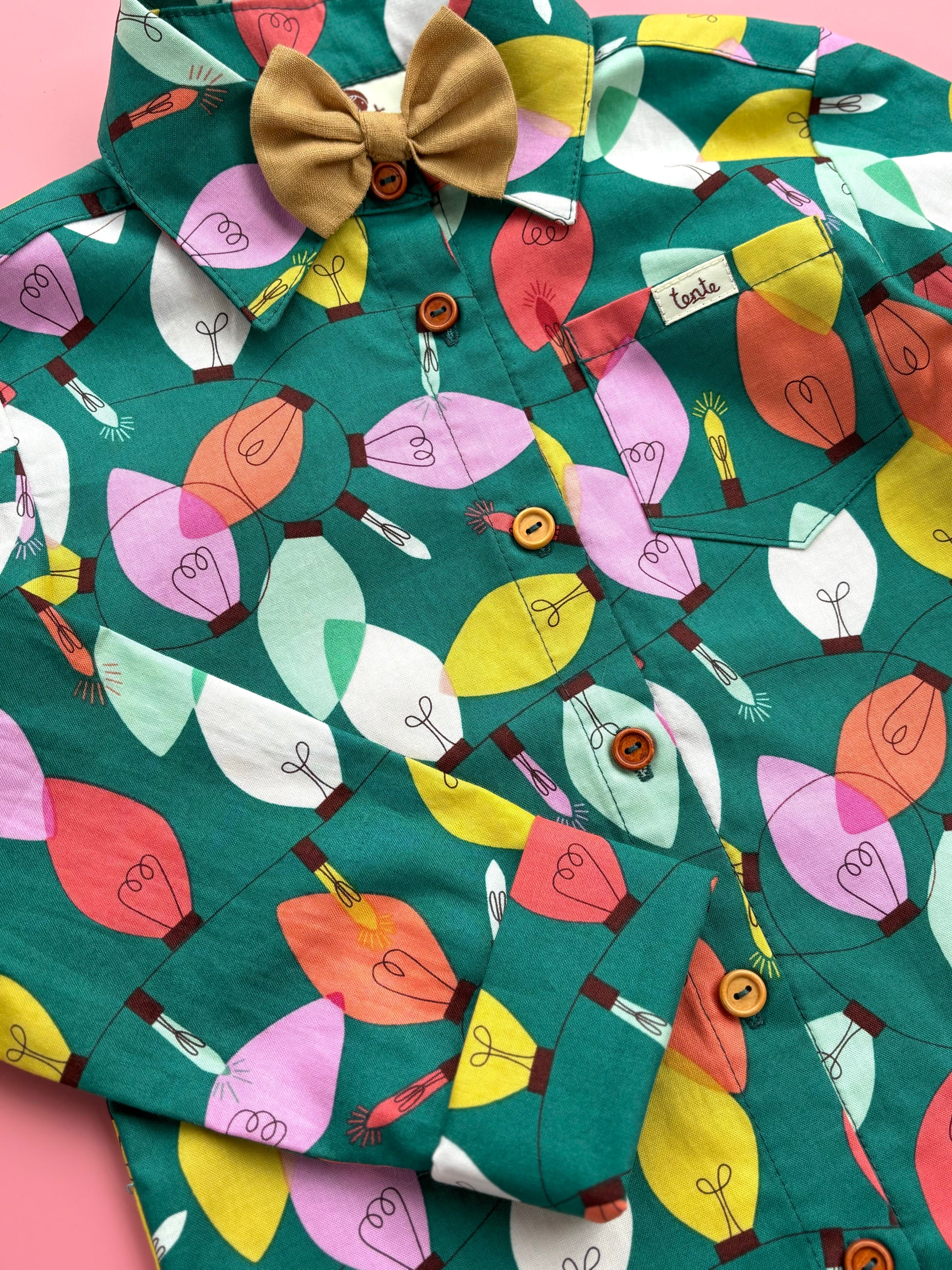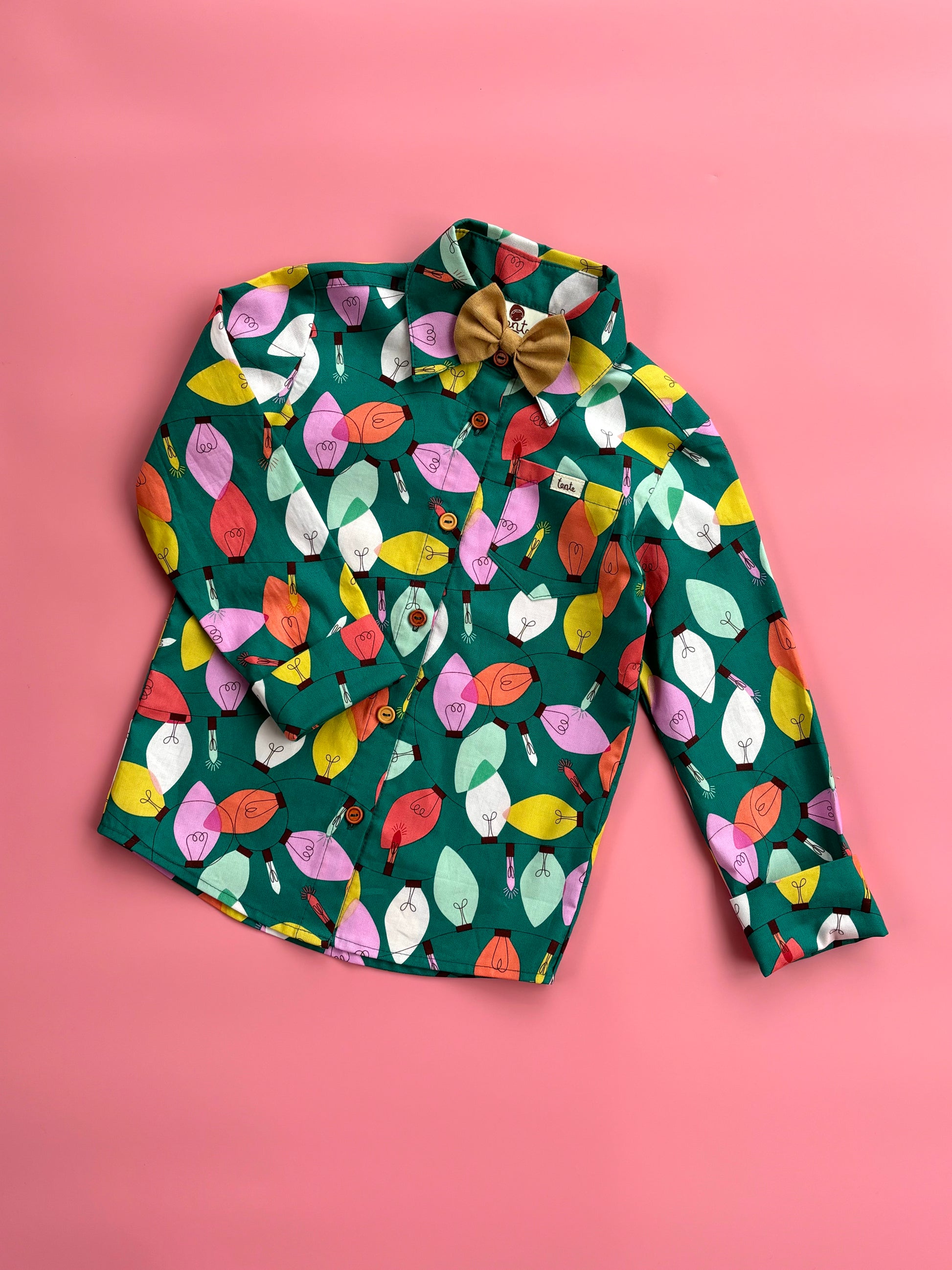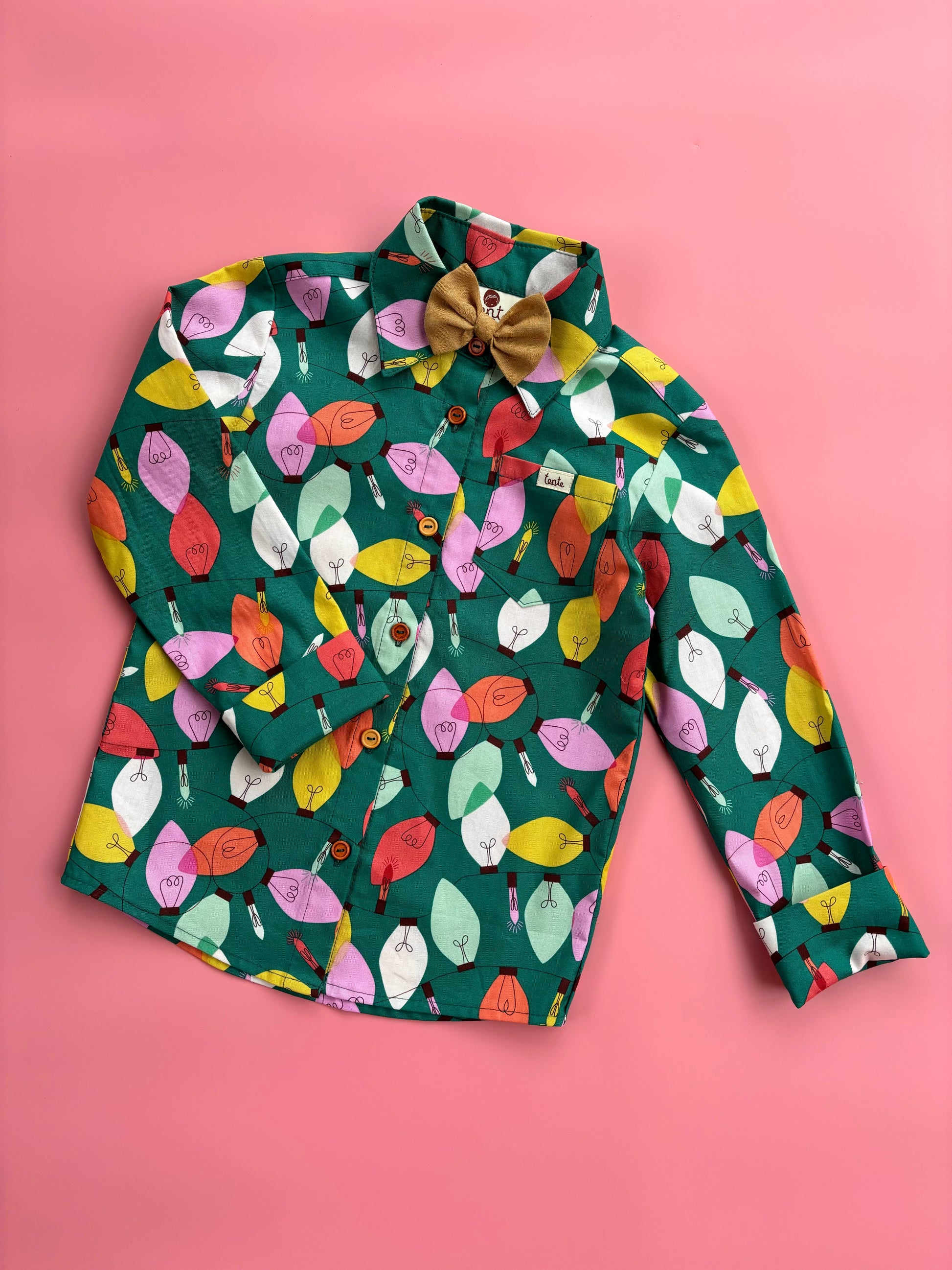 Ez a különleges, zöld alapon színes égősorral díszített ing az ünnepi kollekció vidám darabja. A játékos minta megragadja a karácsonyi hangulatot, miközben a természet ihlette zöld szín elegáns alapot ad. Az ing organikus pamutból készült, így kényelmes és bőrbarát viselet gyerekeknek. Egy igazán egyedi és kedves darab, amely minden gyermek arcára mosolyt csal az ünnepi időszakban.