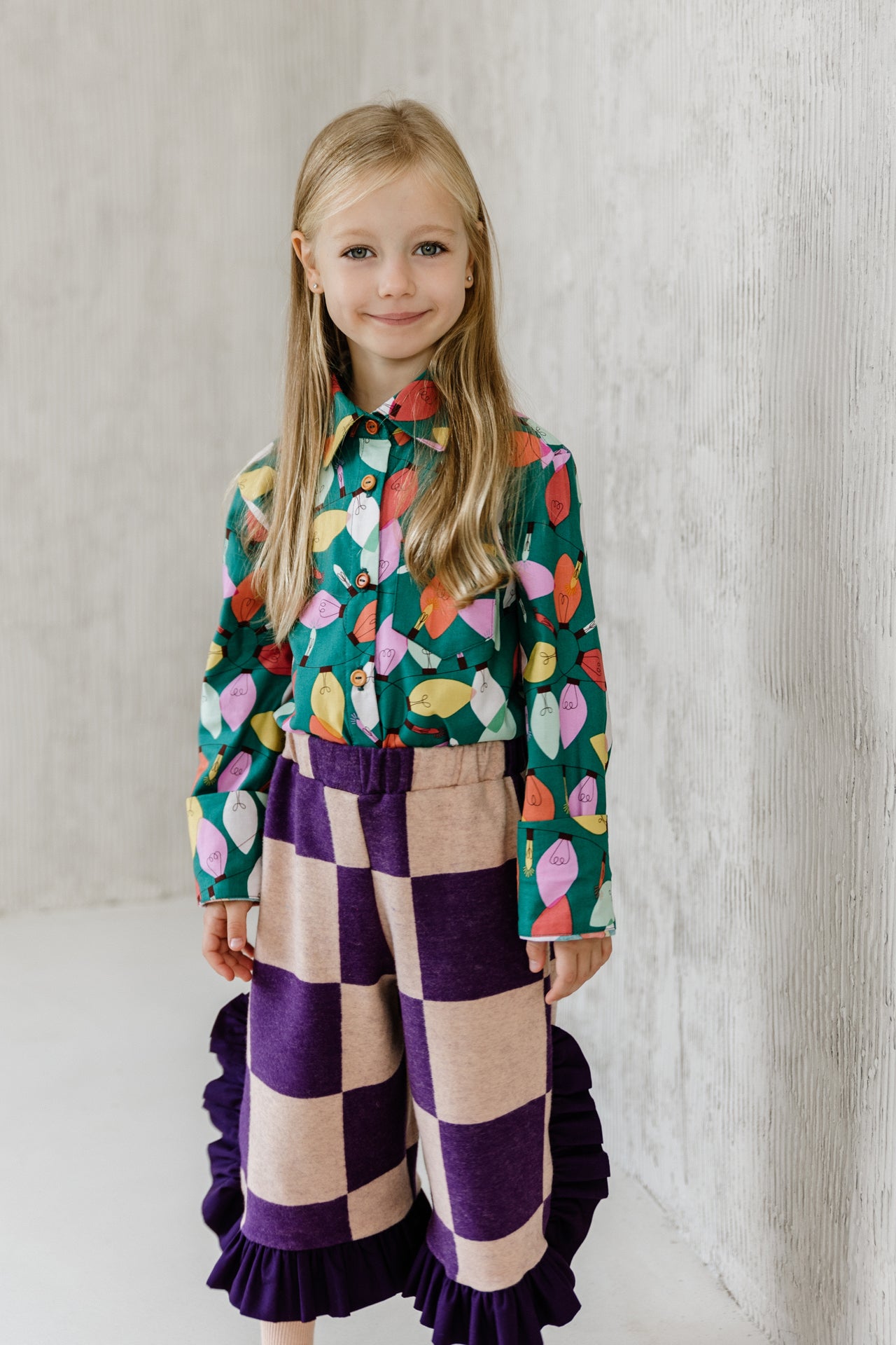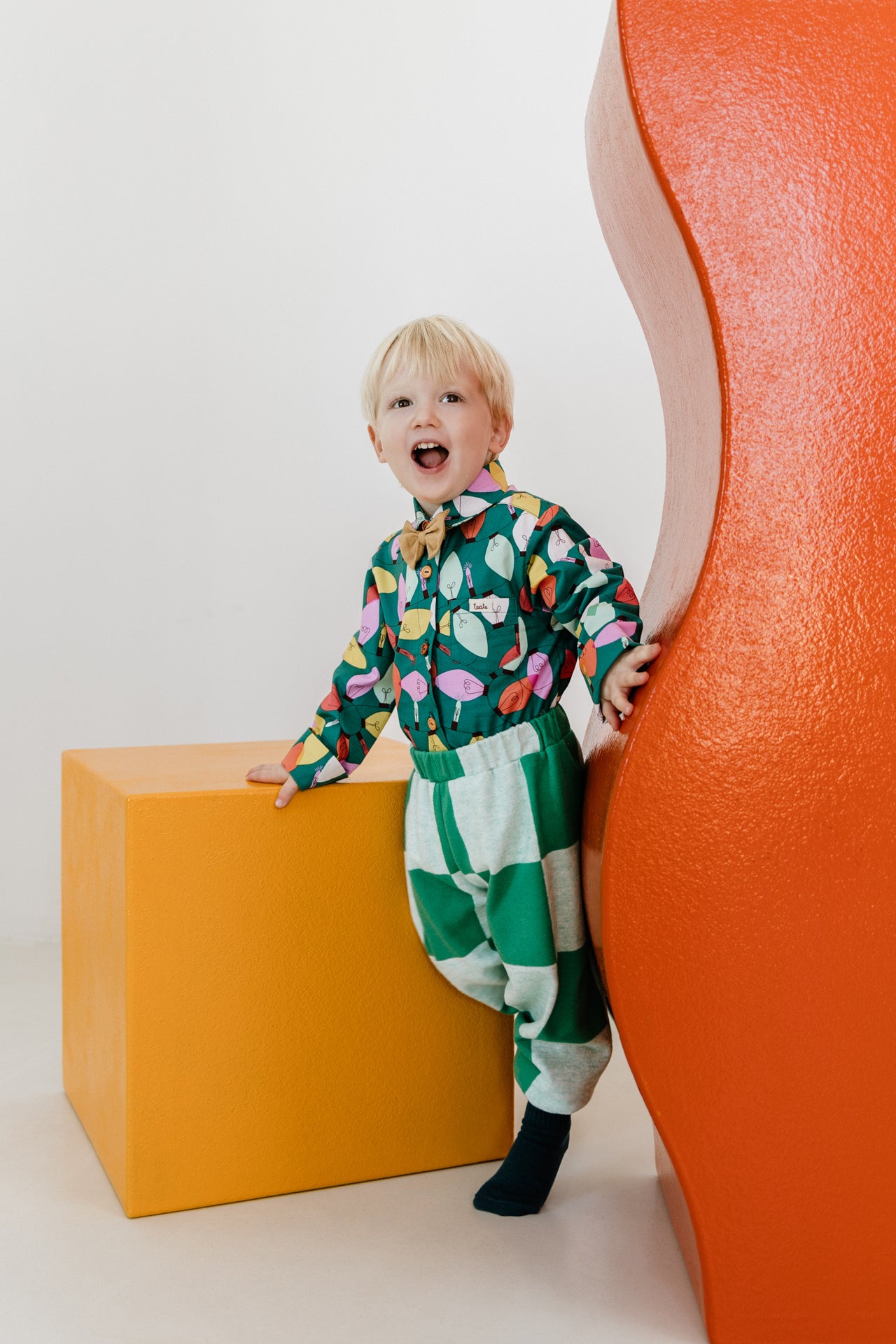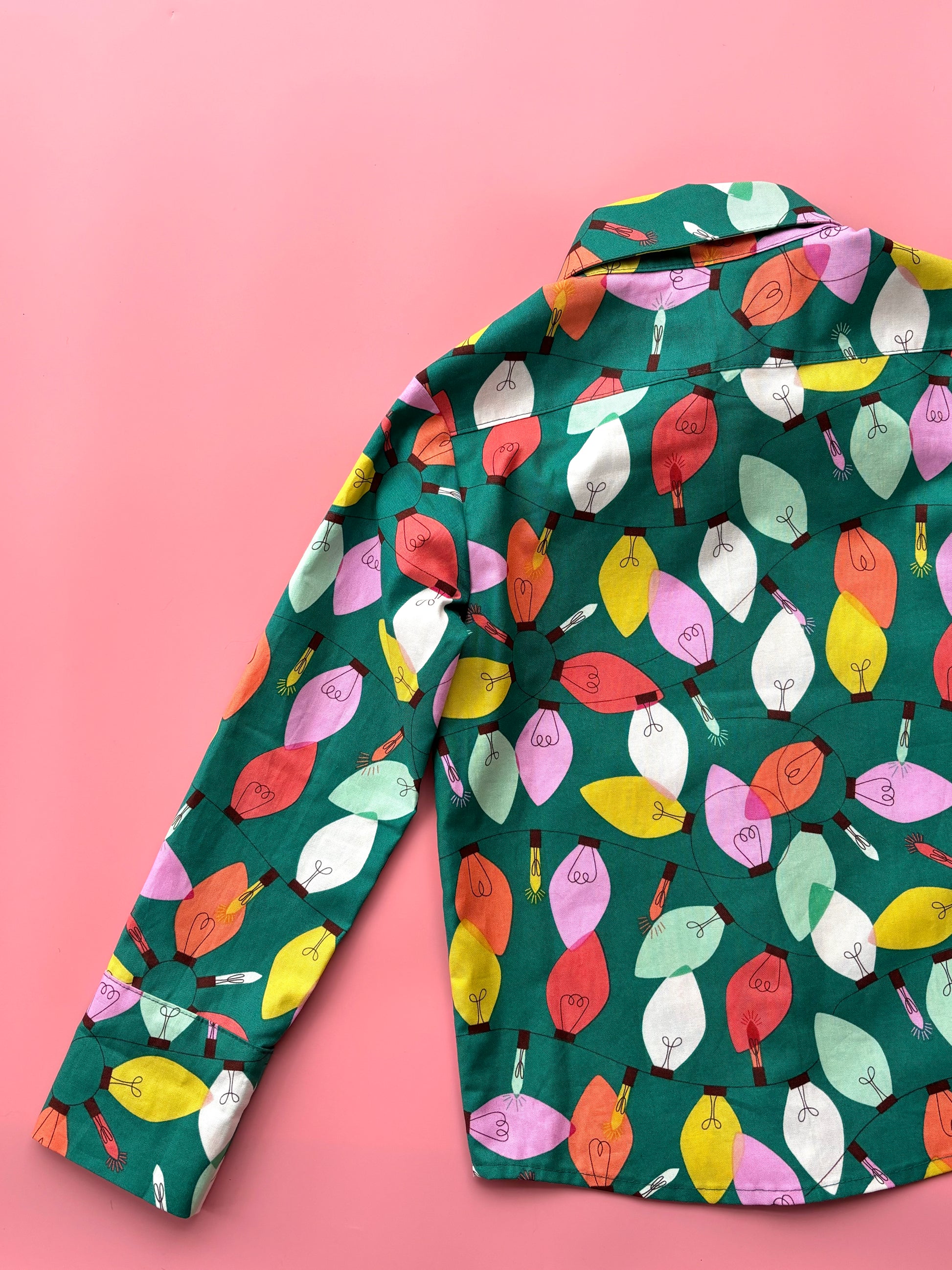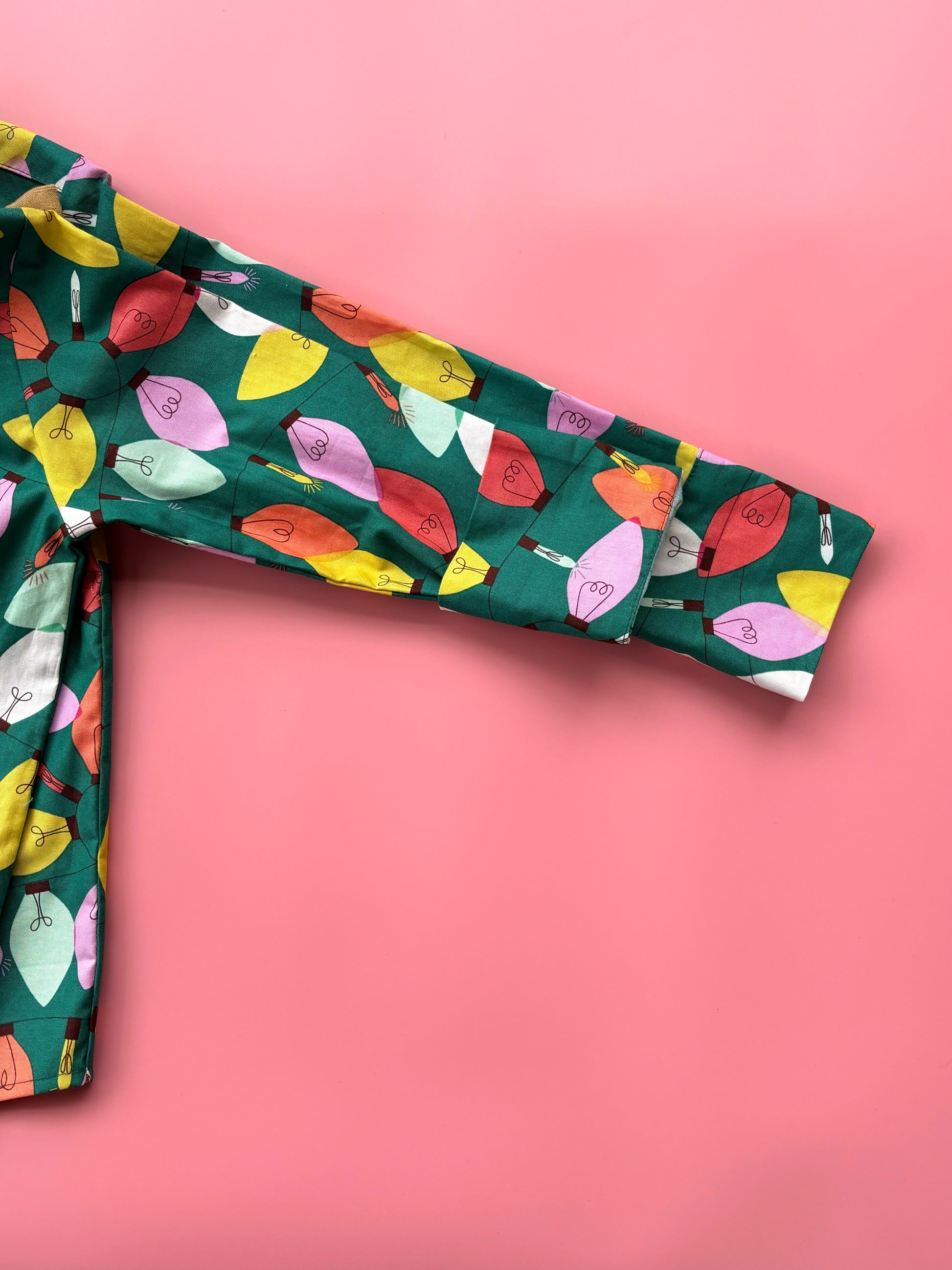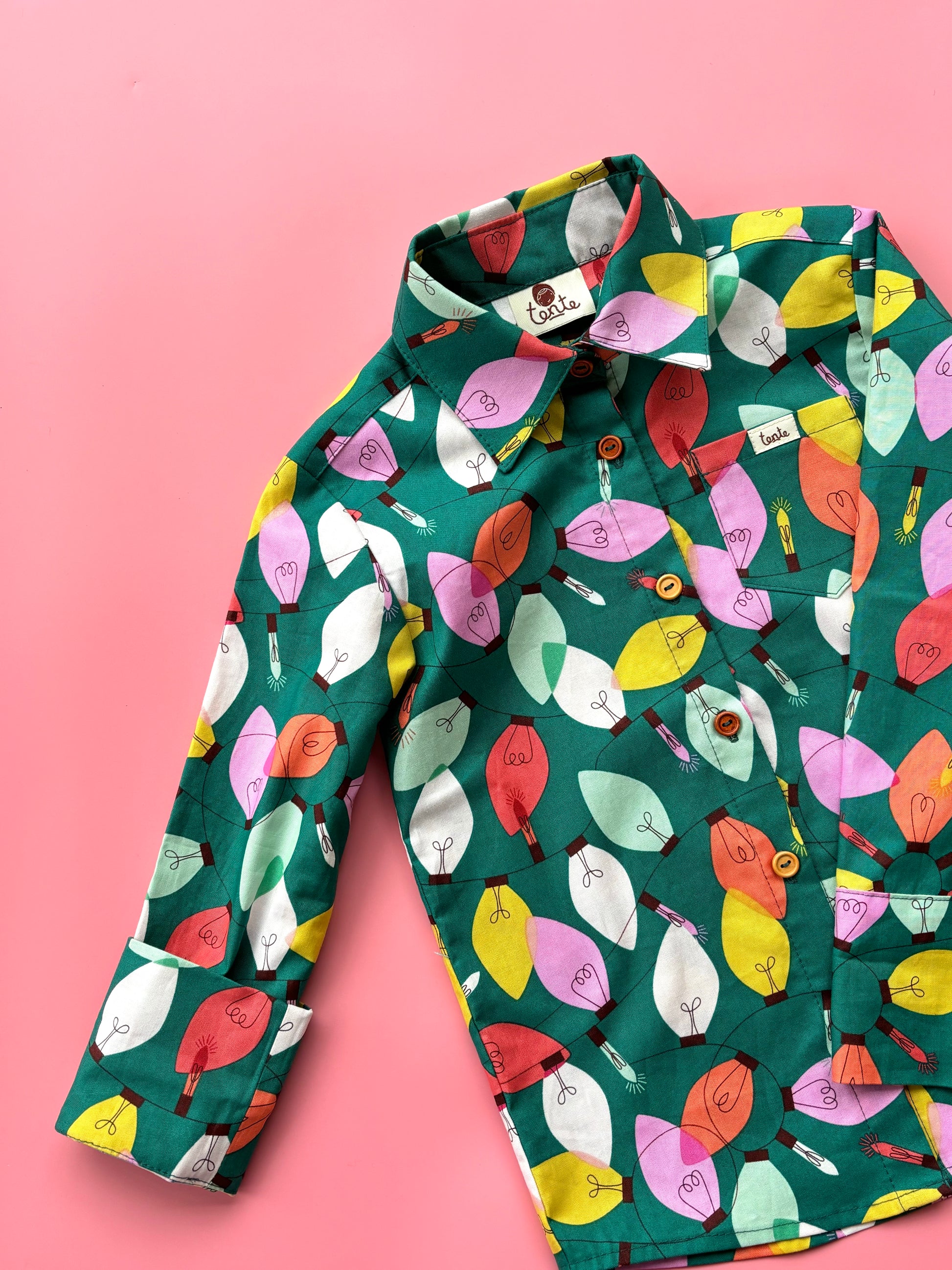 Ez a különleges, zöld alapon színes égősorral díszített ing az ünnepi kollekció vidám darabja. A játékos minta megragadja a karácsonyi hangulatot, miközben a természet ihlette zöld szín elegáns alapot ad. Az ing organikus pamutból készült, így kényelmes és bőrbarát viselet gyerekeknek. Egy igazán egyedi és kedves darab, amely minden gyermek arcára mosolyt csal az ünnepi időszakban.