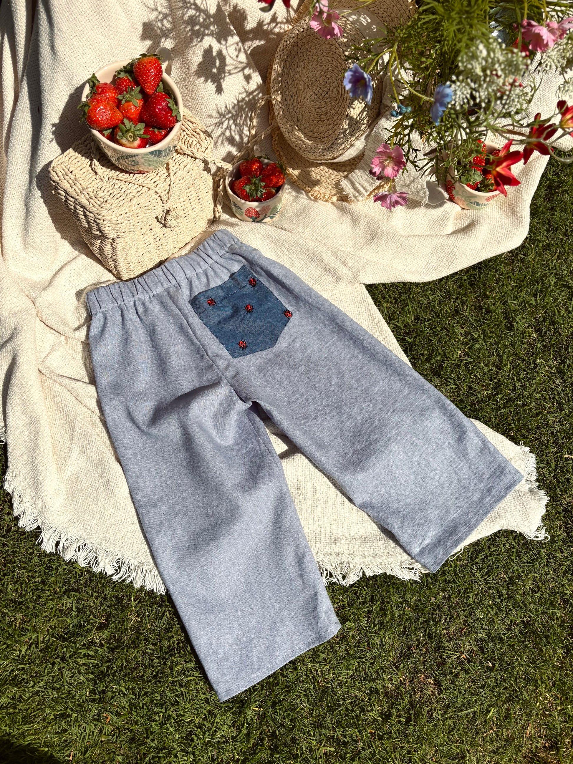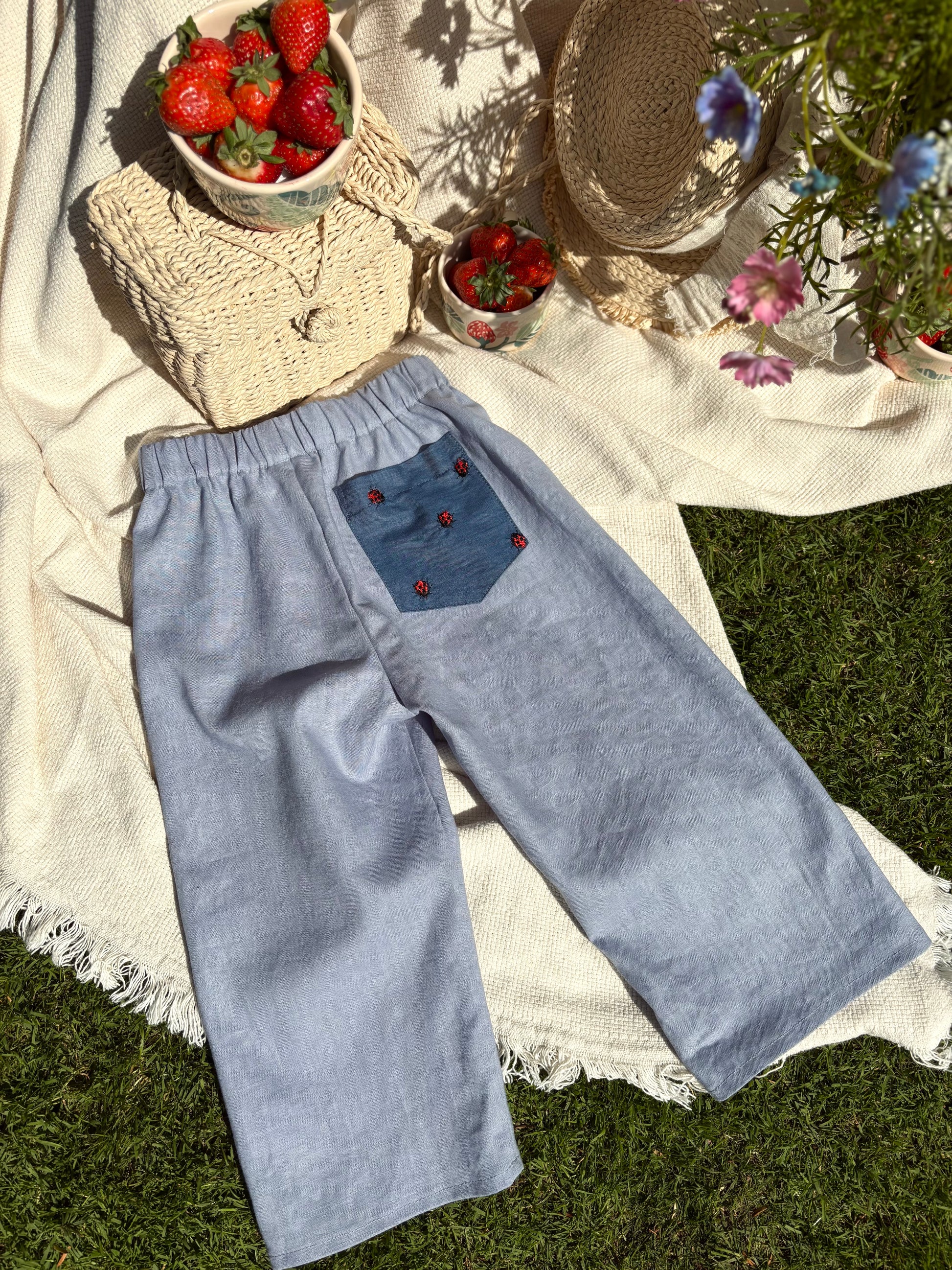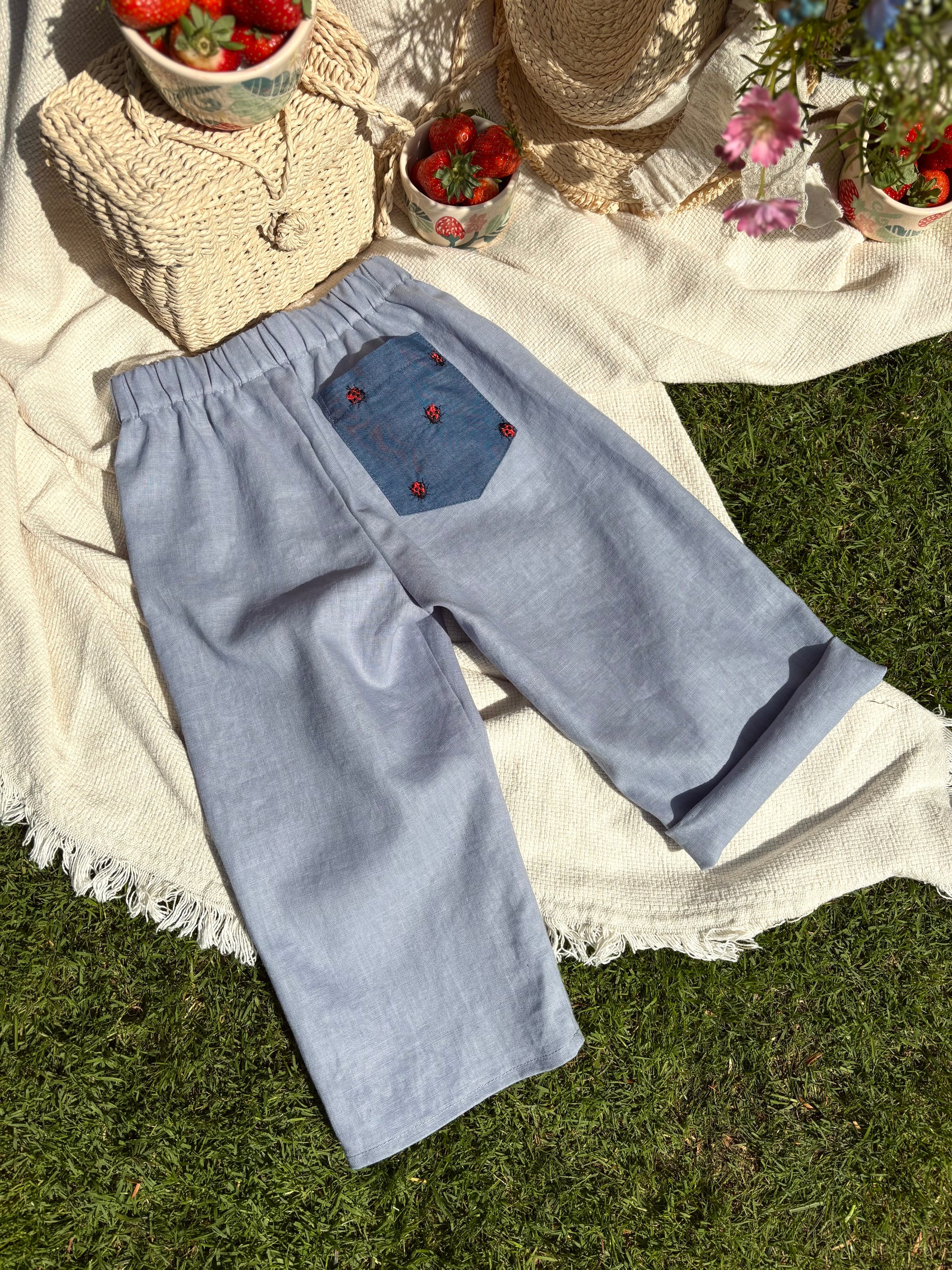 A mezőkön rohanó, világot felfedező gyerekek kedvence lehet. Természetes kék lenvászonból készült, könnyű és légáteresztő, így a legmelegebb napokon is kényelmes viselet. A gumis derékpánt biztosítja a szabad mozgást, míg az alja felhajtható, így a nadrág könnyedén igazítható a kívánt hosszúságra – hosszú vagy háromnegyedes változatban is tökéletes.