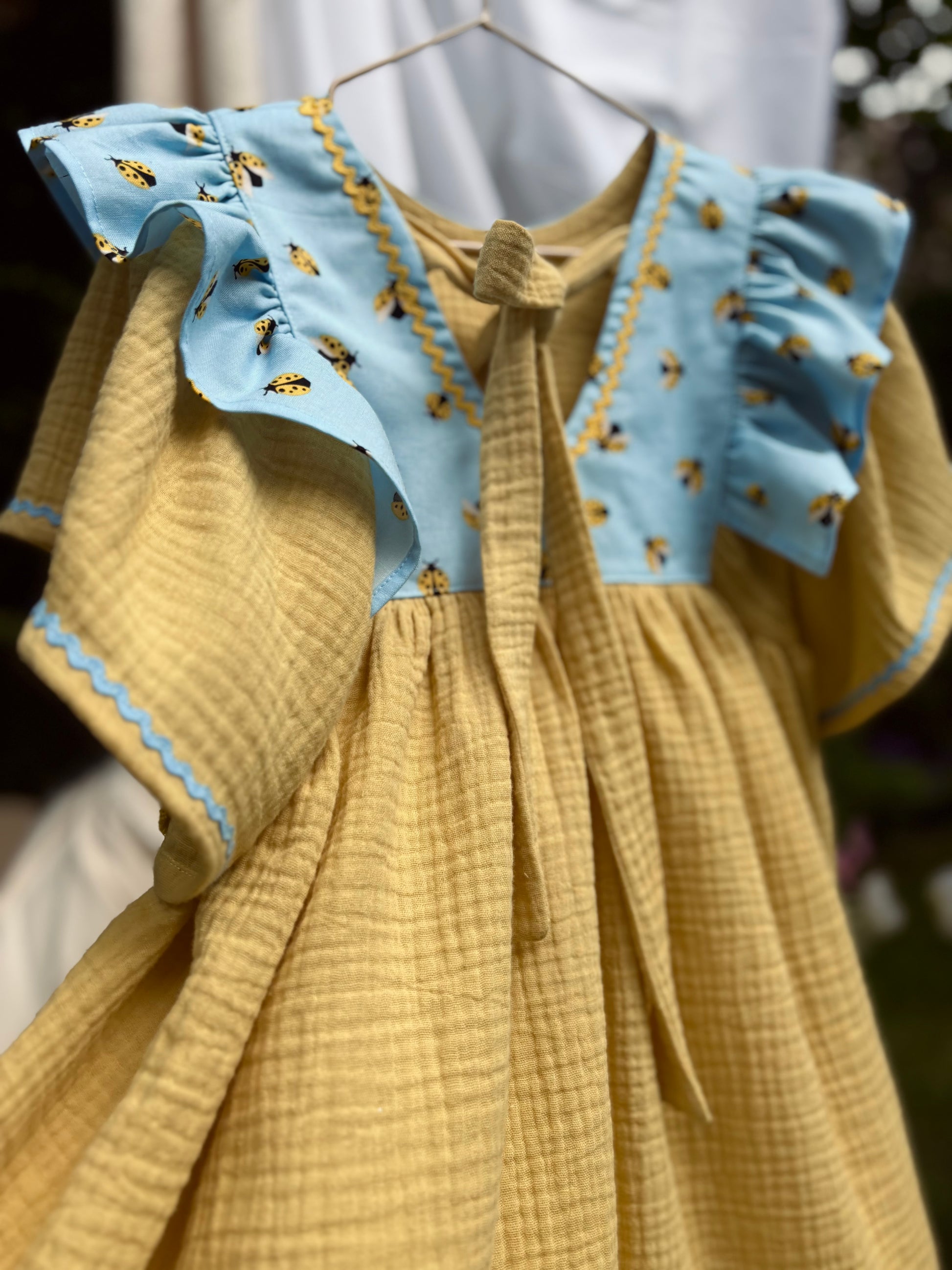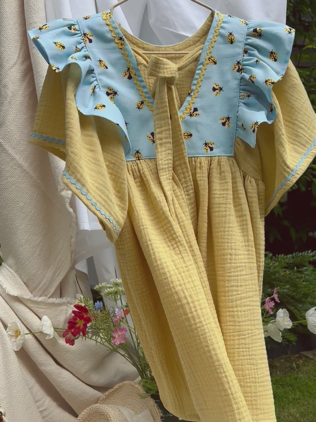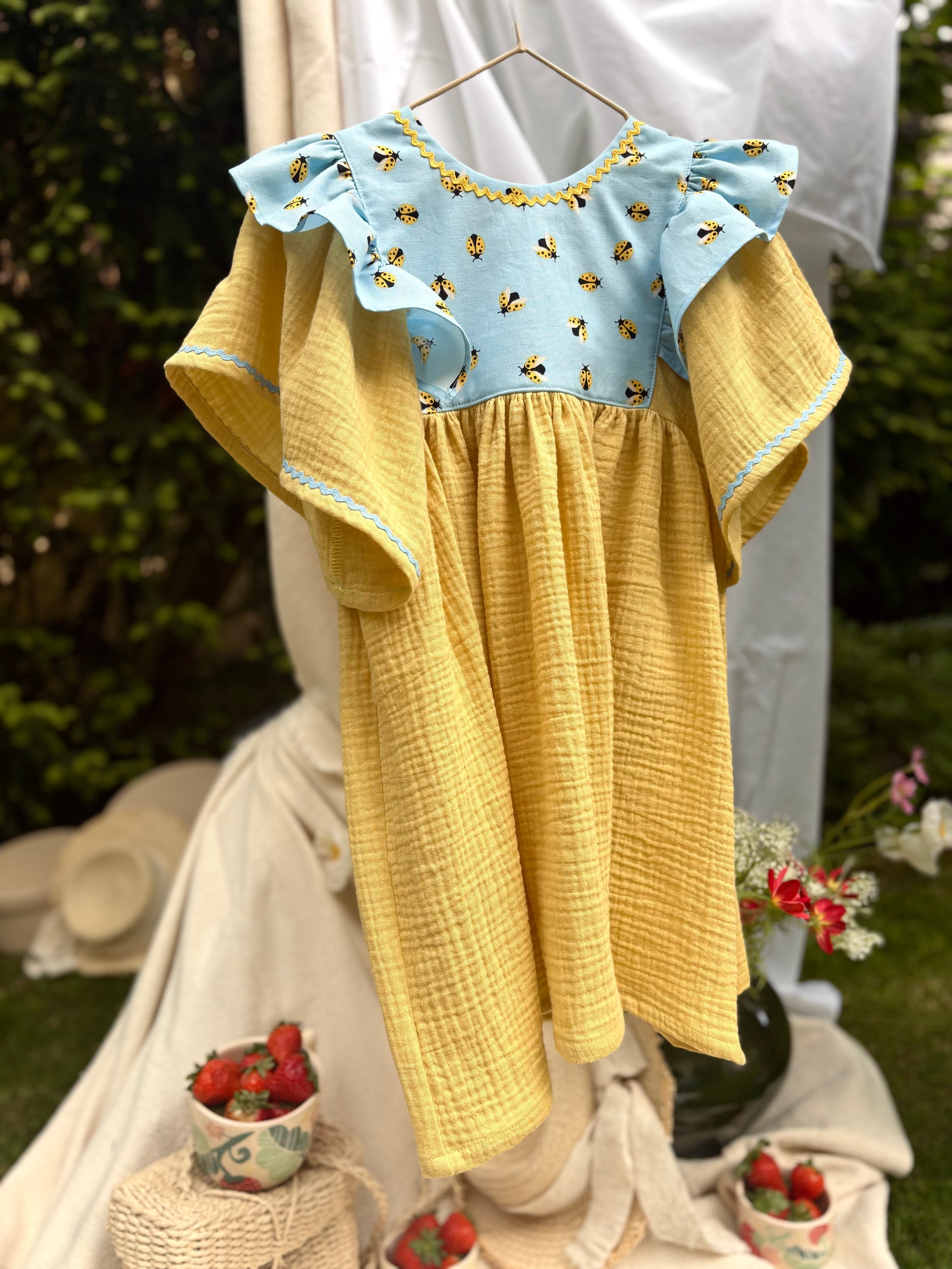Könnyed, sárga dupla géz anyagból készült, melyet játékos katica mintás pamut és finom csipke díszítés tesz igazán különlegessé. A pörgős szoknya és a különleges ujjmegoldás minden mozdulatot mesévé varázsol, míg a hátul masnira köthető részlet igazi bájt csempész a megjelenésbe.