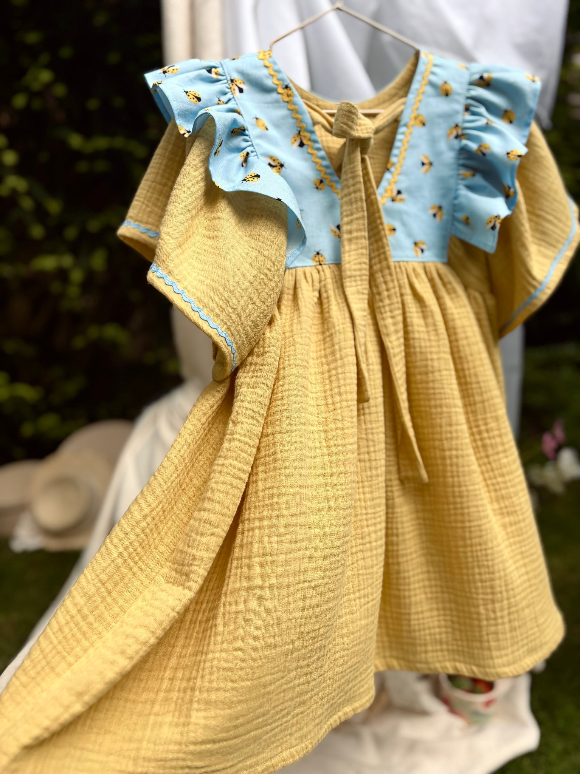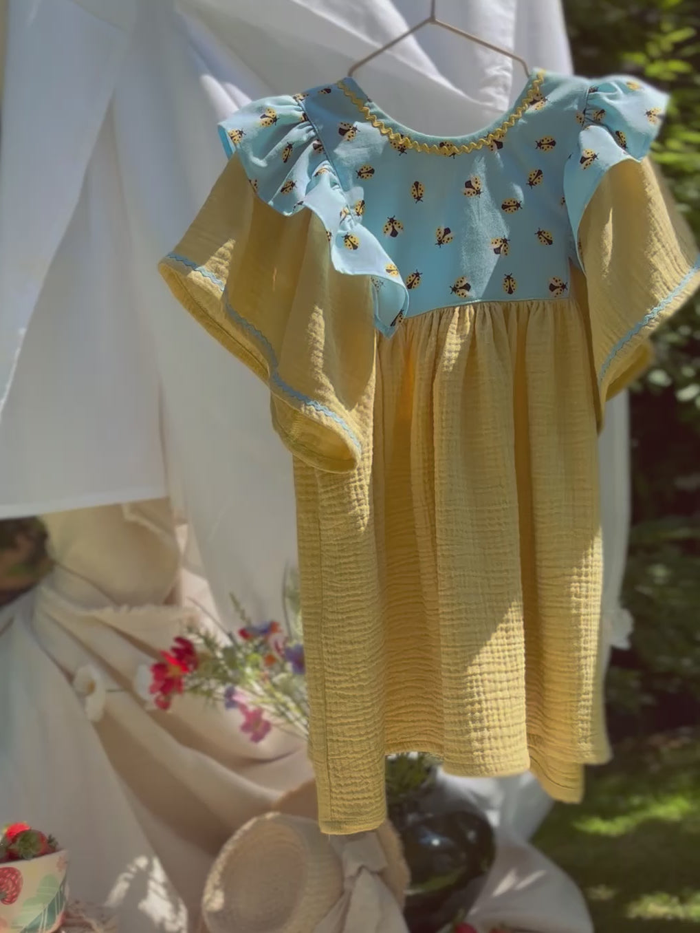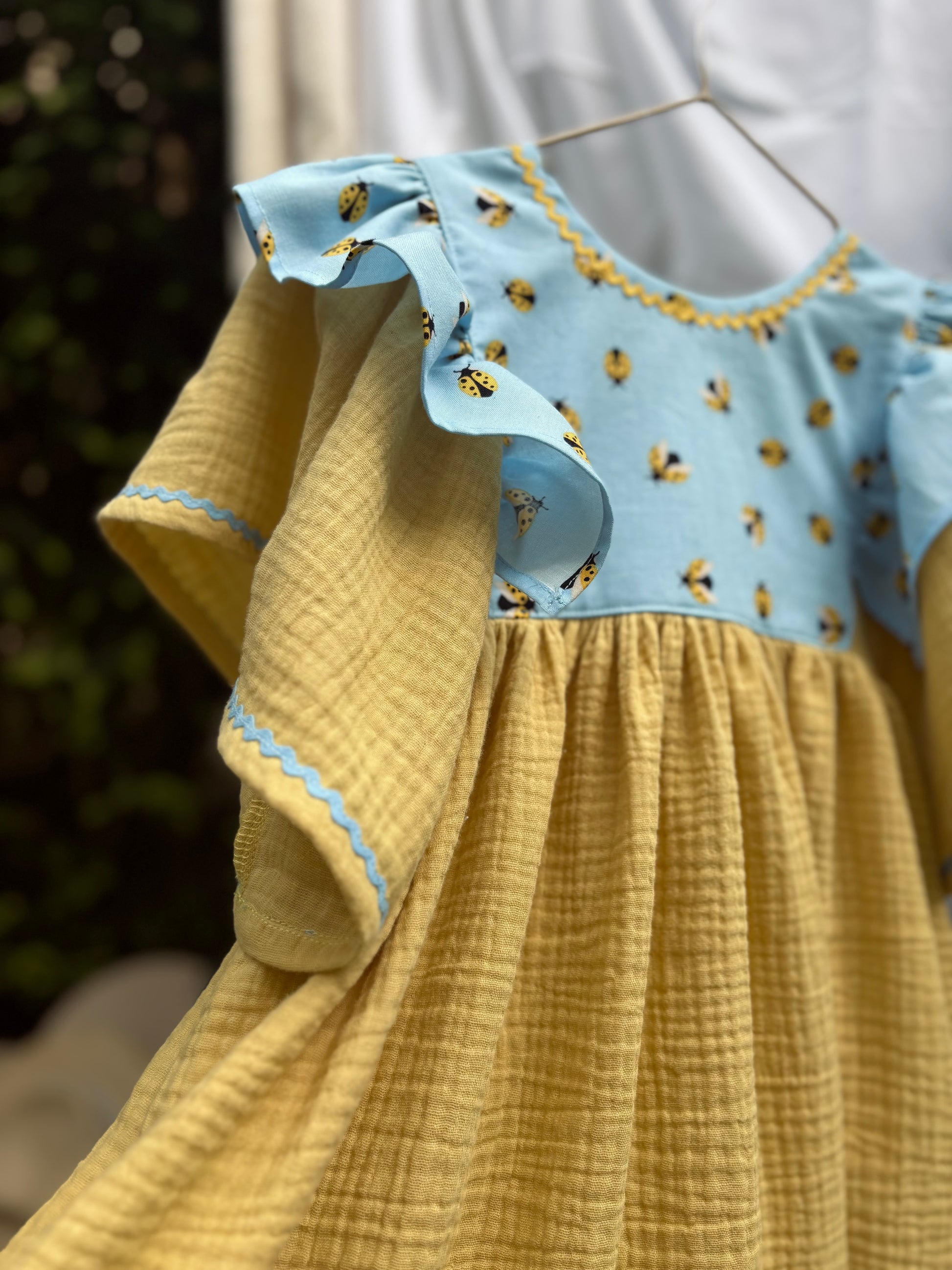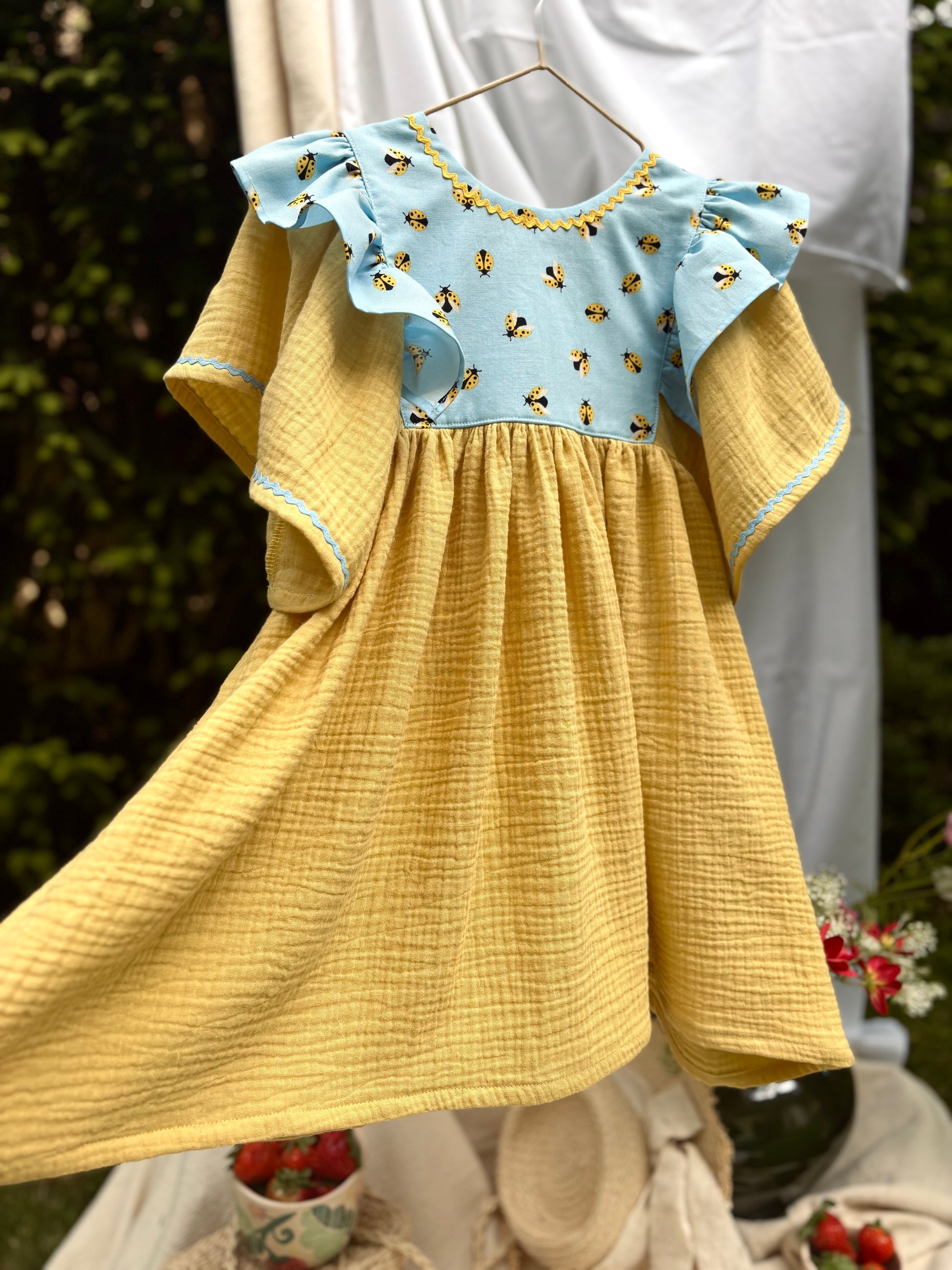 Könnyed, sárga dupla géz anyagból készült, melyet játékos katica mintás pamut és finom csipke díszítés tesz igazán különlegessé. A pörgős szoknya és a különleges ujjmegoldás minden mozdulatot mesévé varázsol, míg a hátul masnira köthető részlet igazi bájt csempész a megjelenésbe.