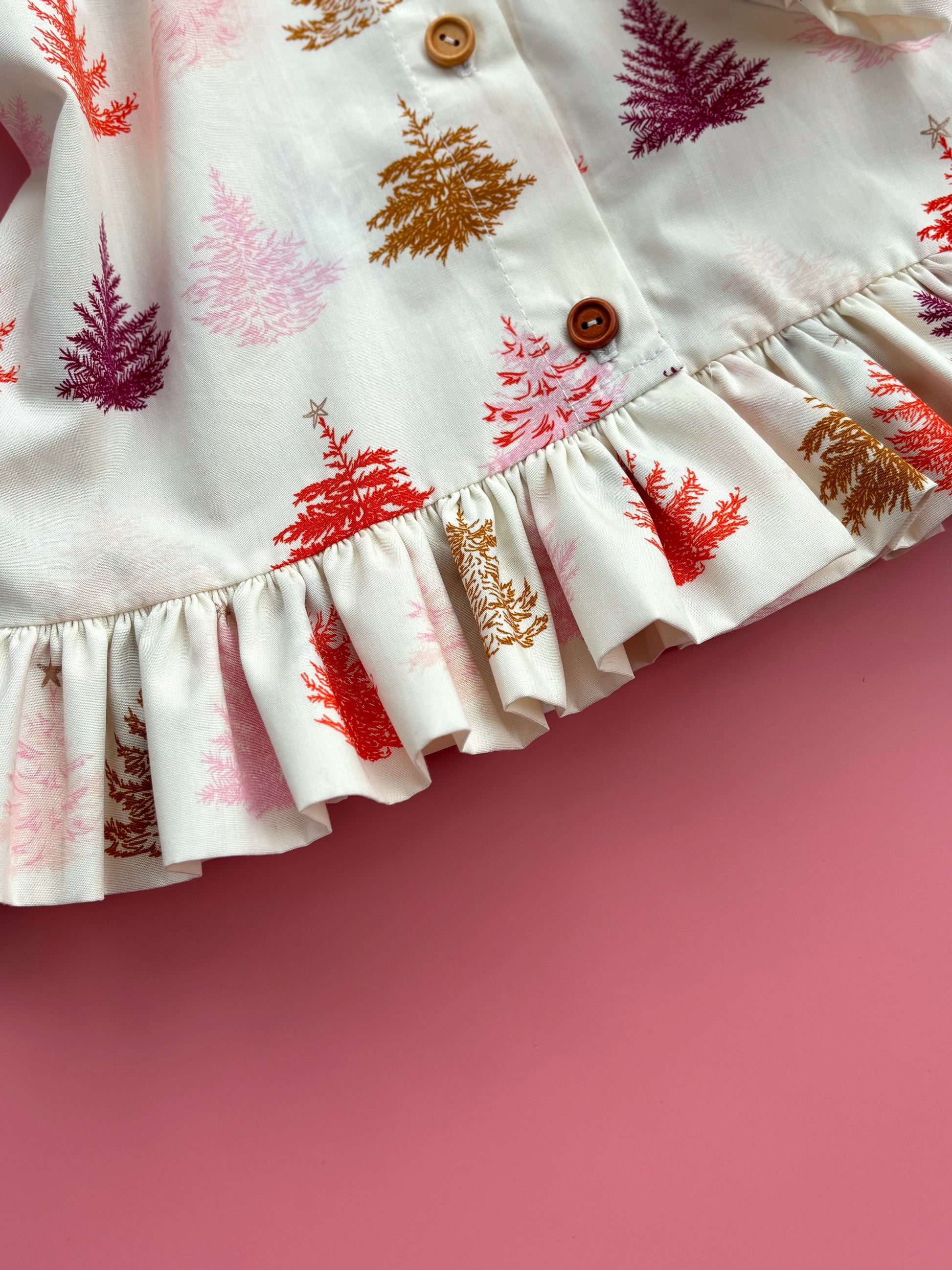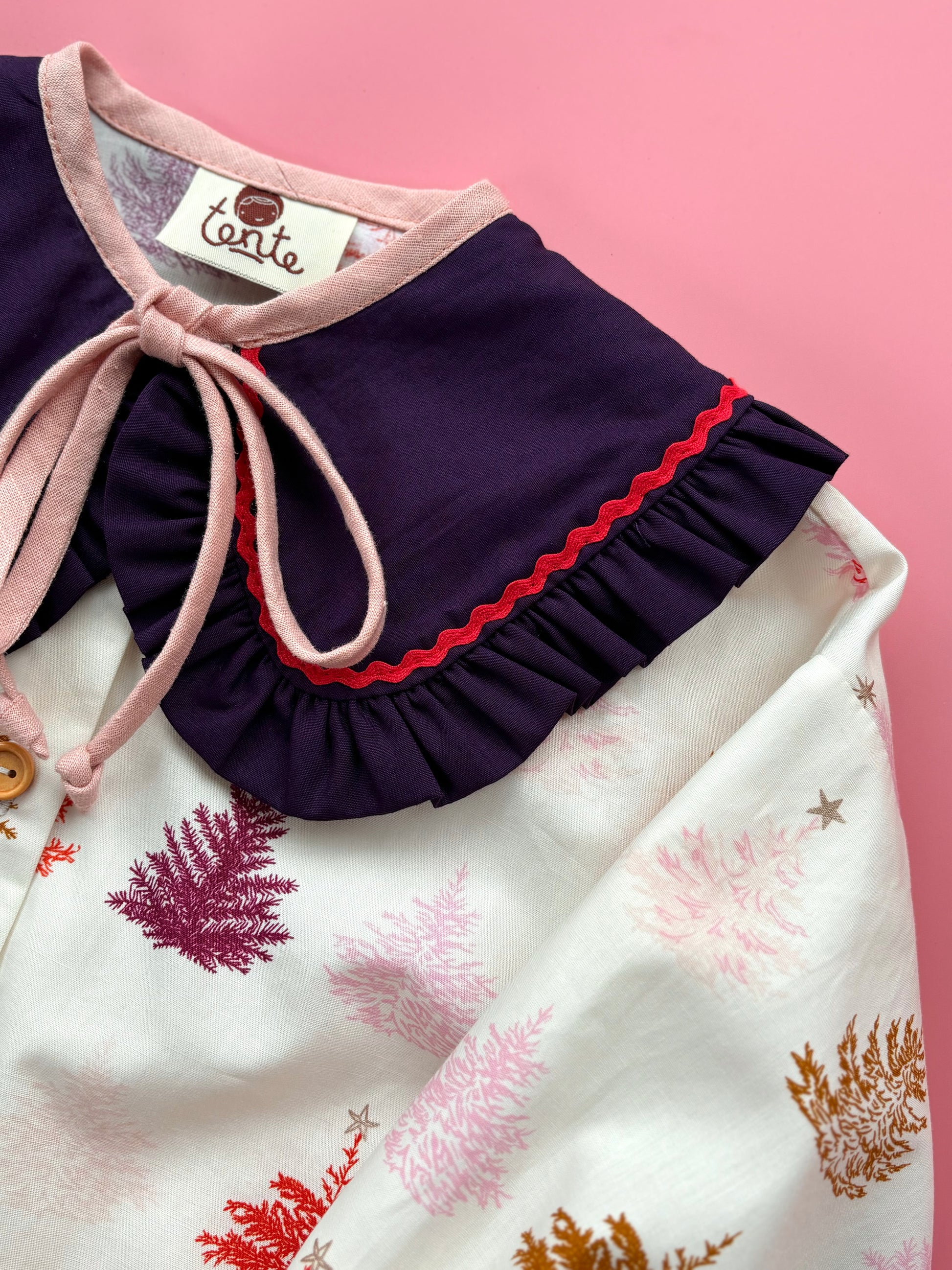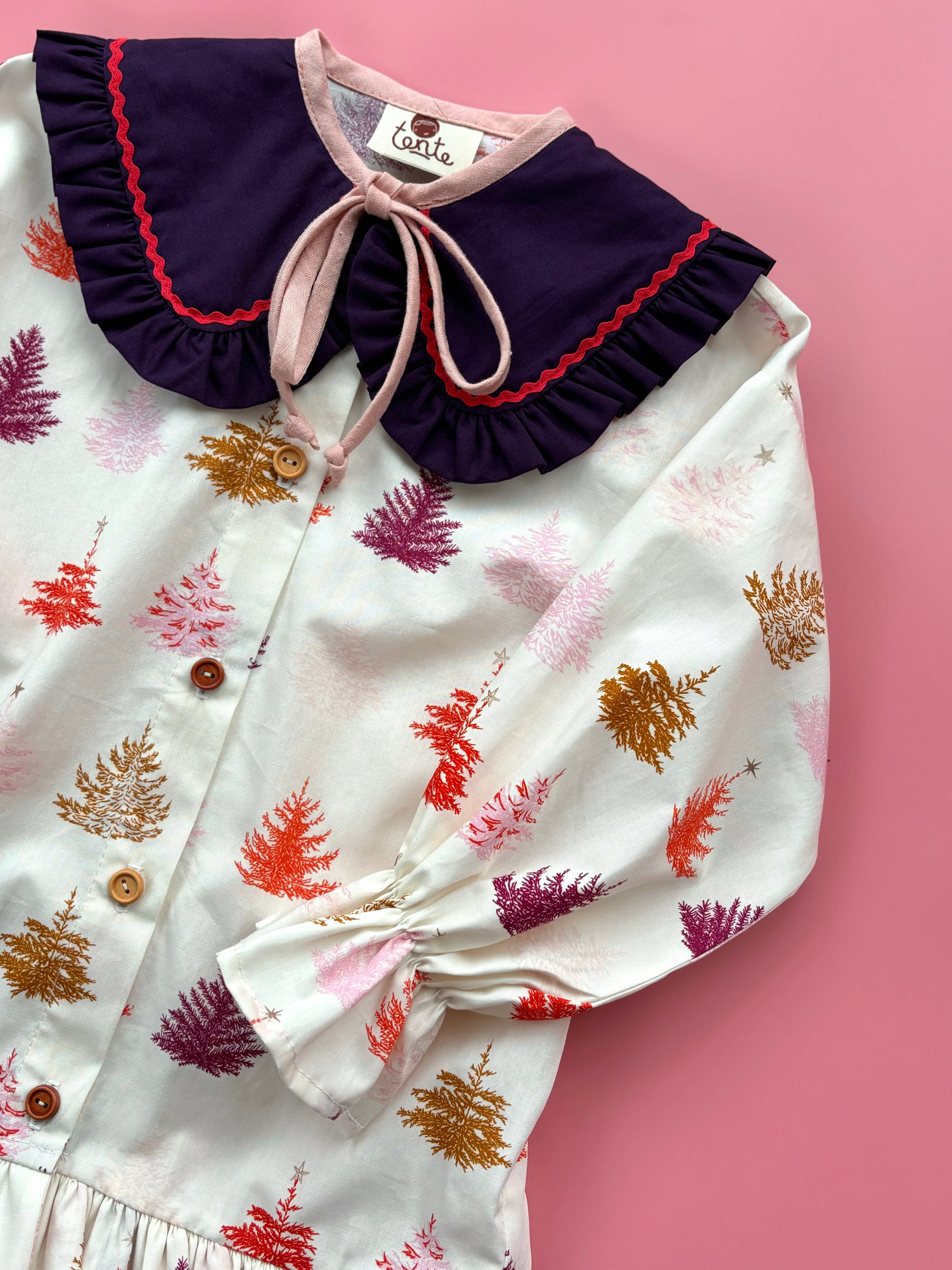 A Tente karácsonyi kapszula kollekciójának csipkével és fodorral díszített ruhácskái igazi ünnepi hangulatot teremtenek. A rózsaszín, lila és fehér árnyalatok lágy, elegáns megjelenést biztosítanak, míg a finom fenyőfás minta játékosan idézi a karácsony szellemét.