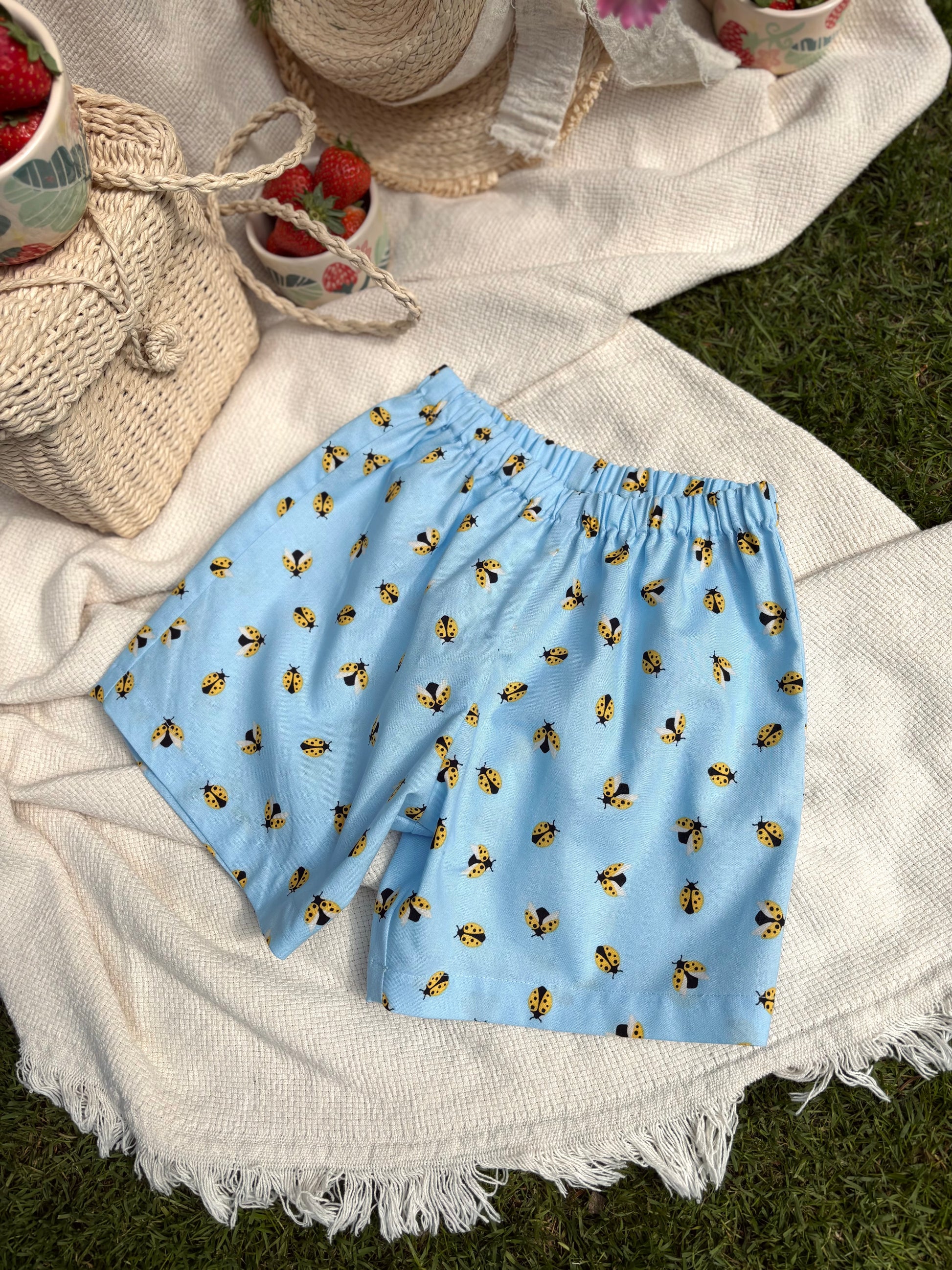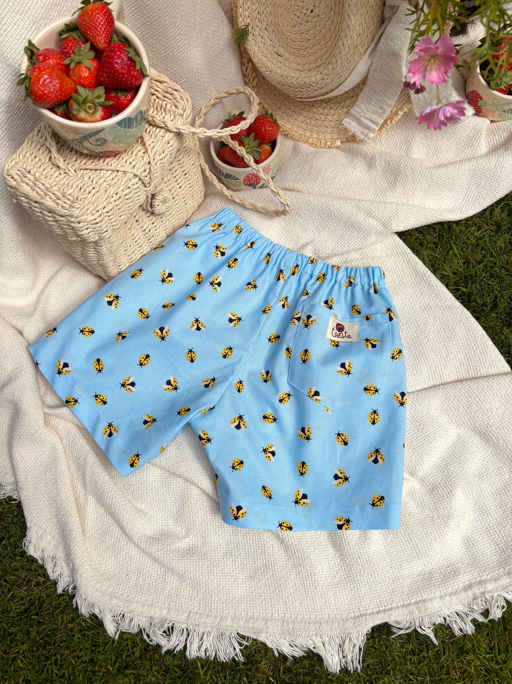 Könnyed, laza szabásával és gumis derekával szabad mozgást biztosít – legyen szó futásról, mászásról vagy piknik közbeni bukfencezésről. A sárga katica minták vidám hangulatot csempésznek minden napba.