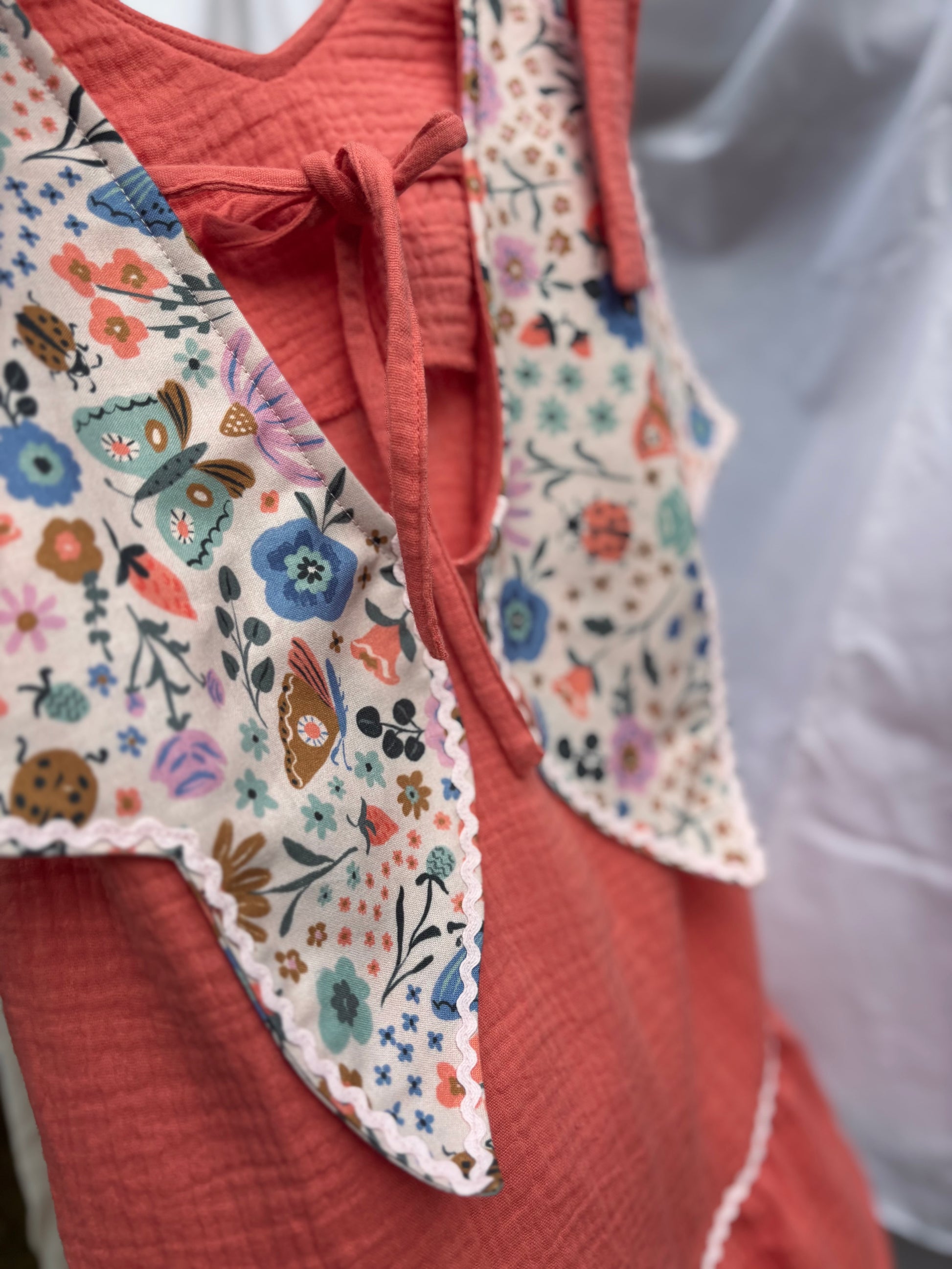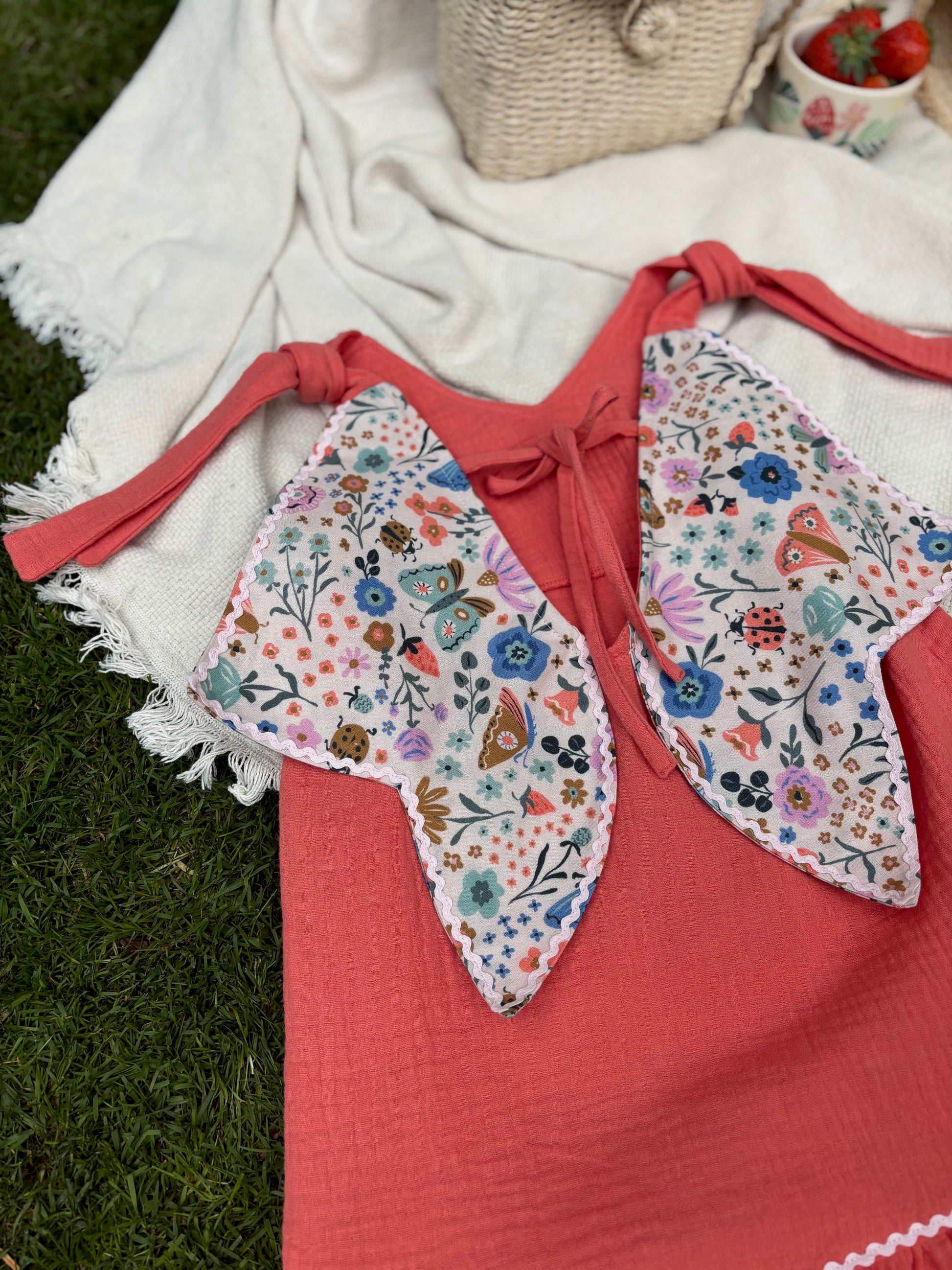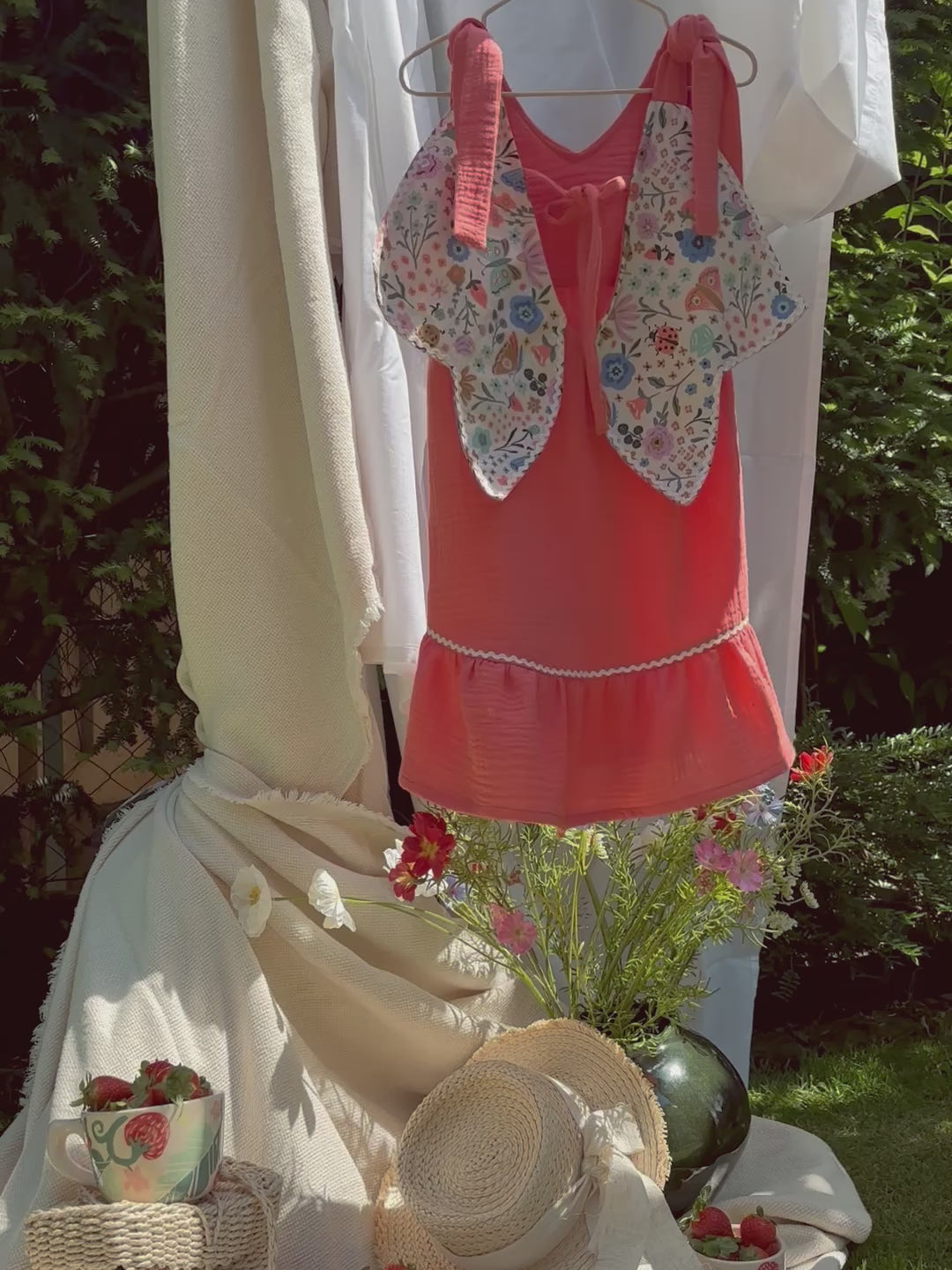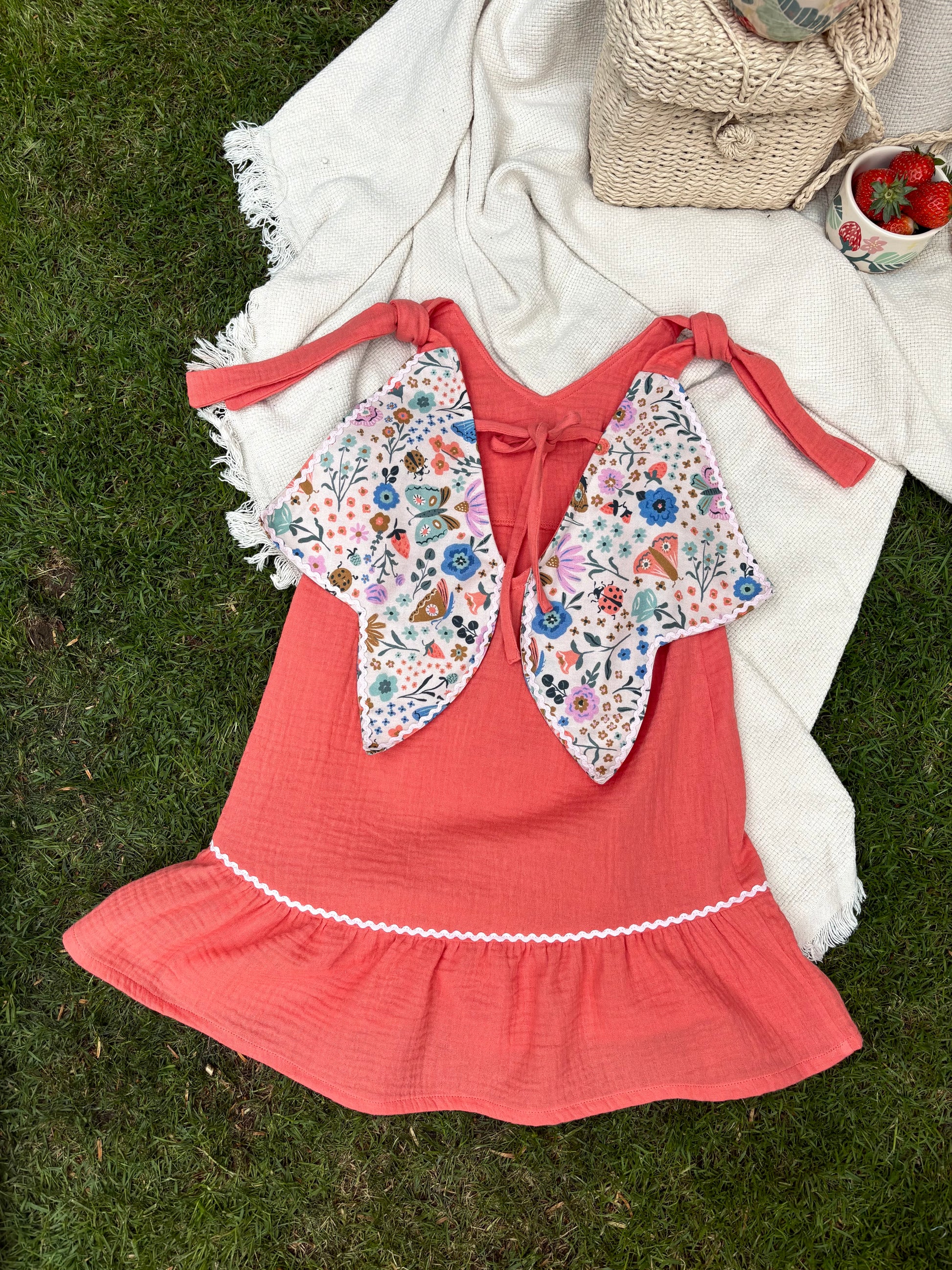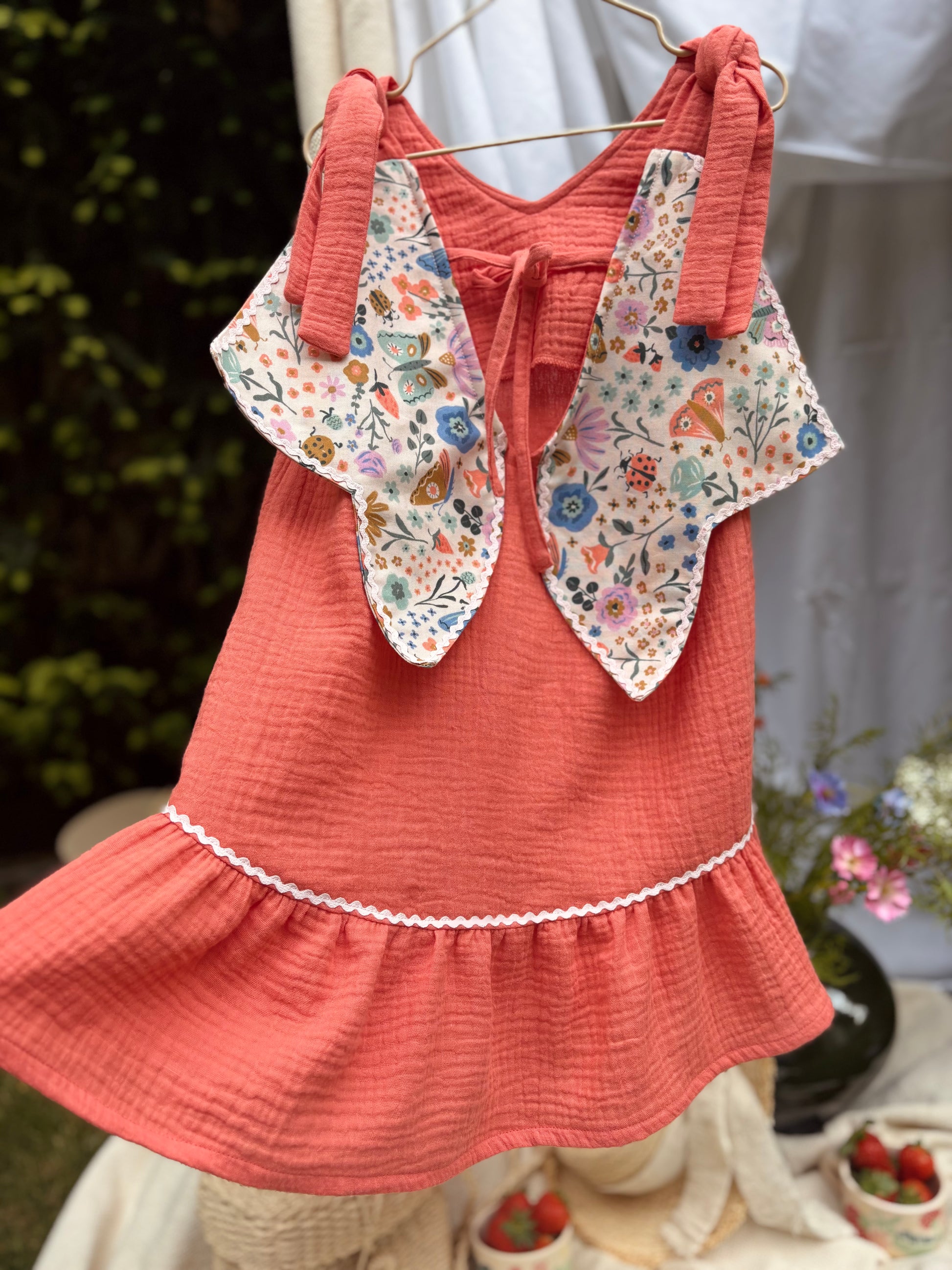 Vidám, lazacszínű dupla géz pamutból készült, hogy a legmelegebb napokon is könnyed viselet legyen. A fodros alja játékosan lebben minden lépésnél, míg a hátán található szárnyszerű kialakítás különleges varázst kölcsönöz – akár egy katicának, akár egy nyári tündérnek.