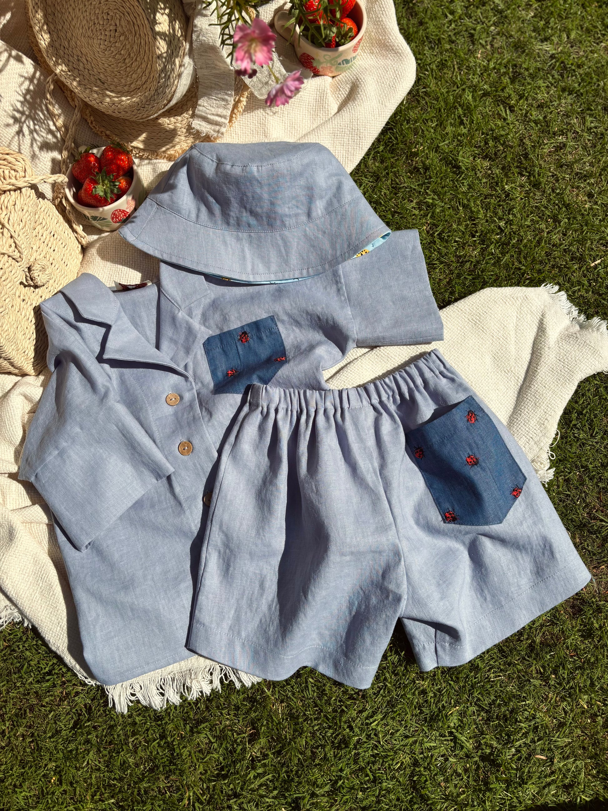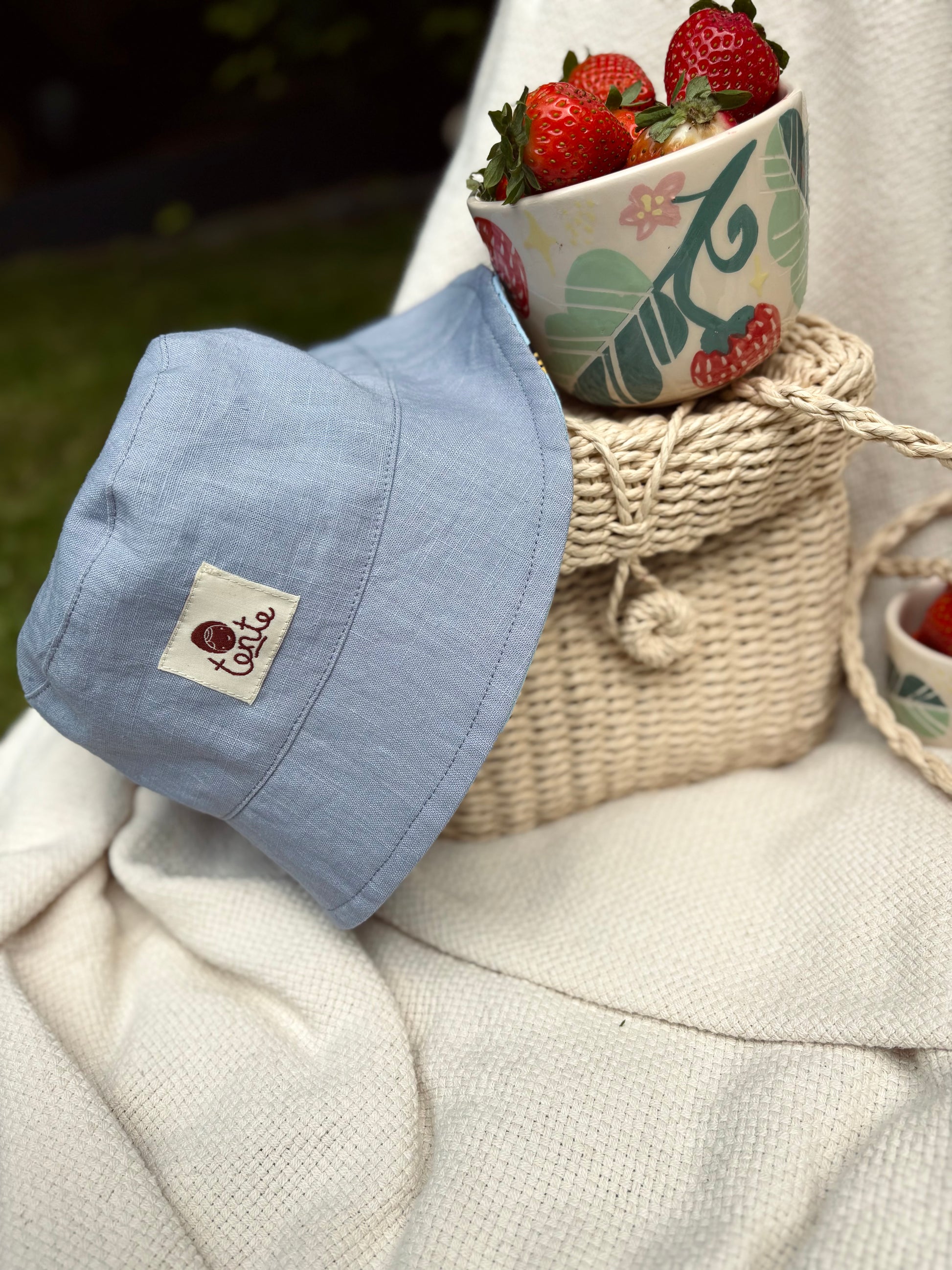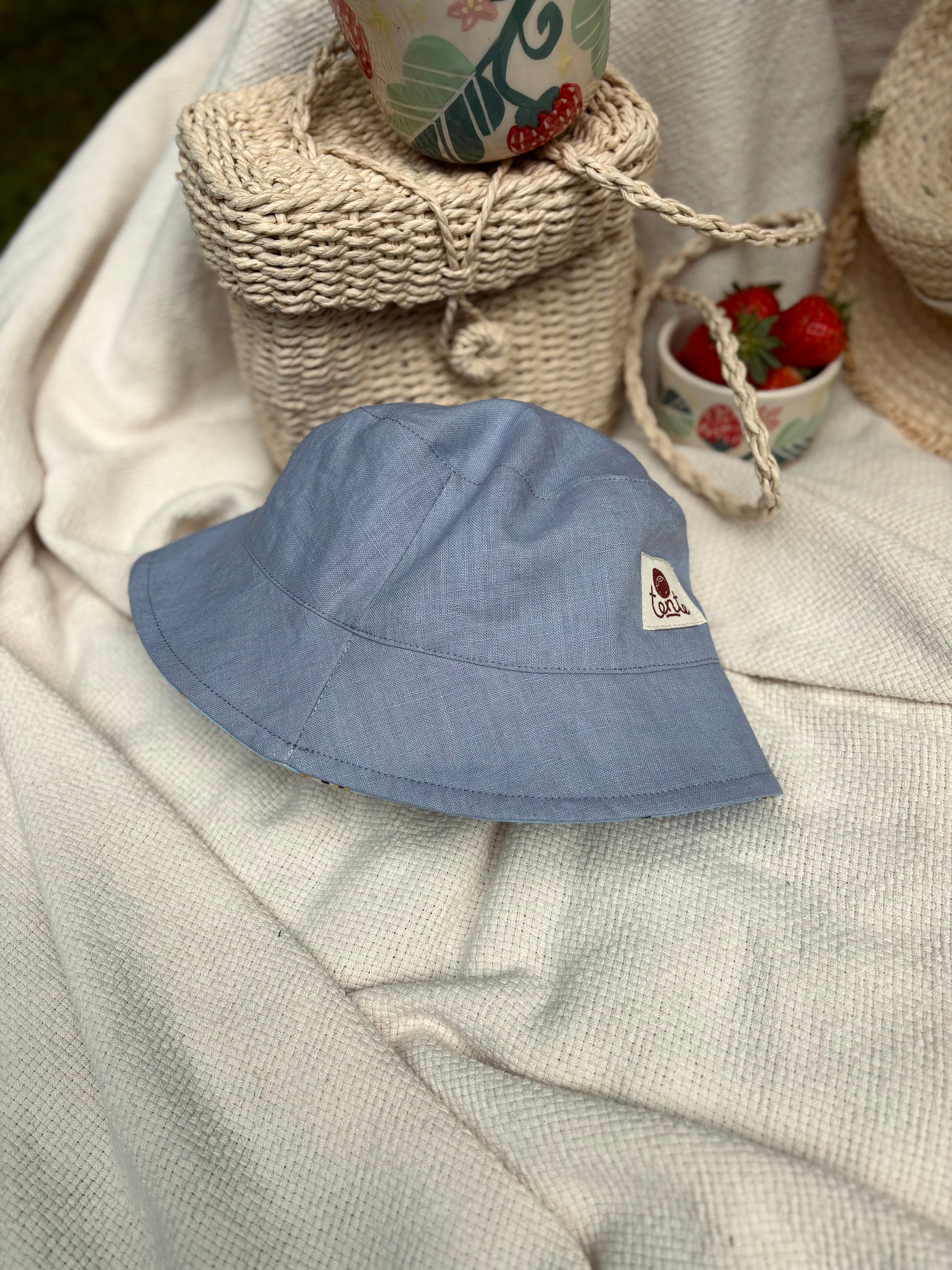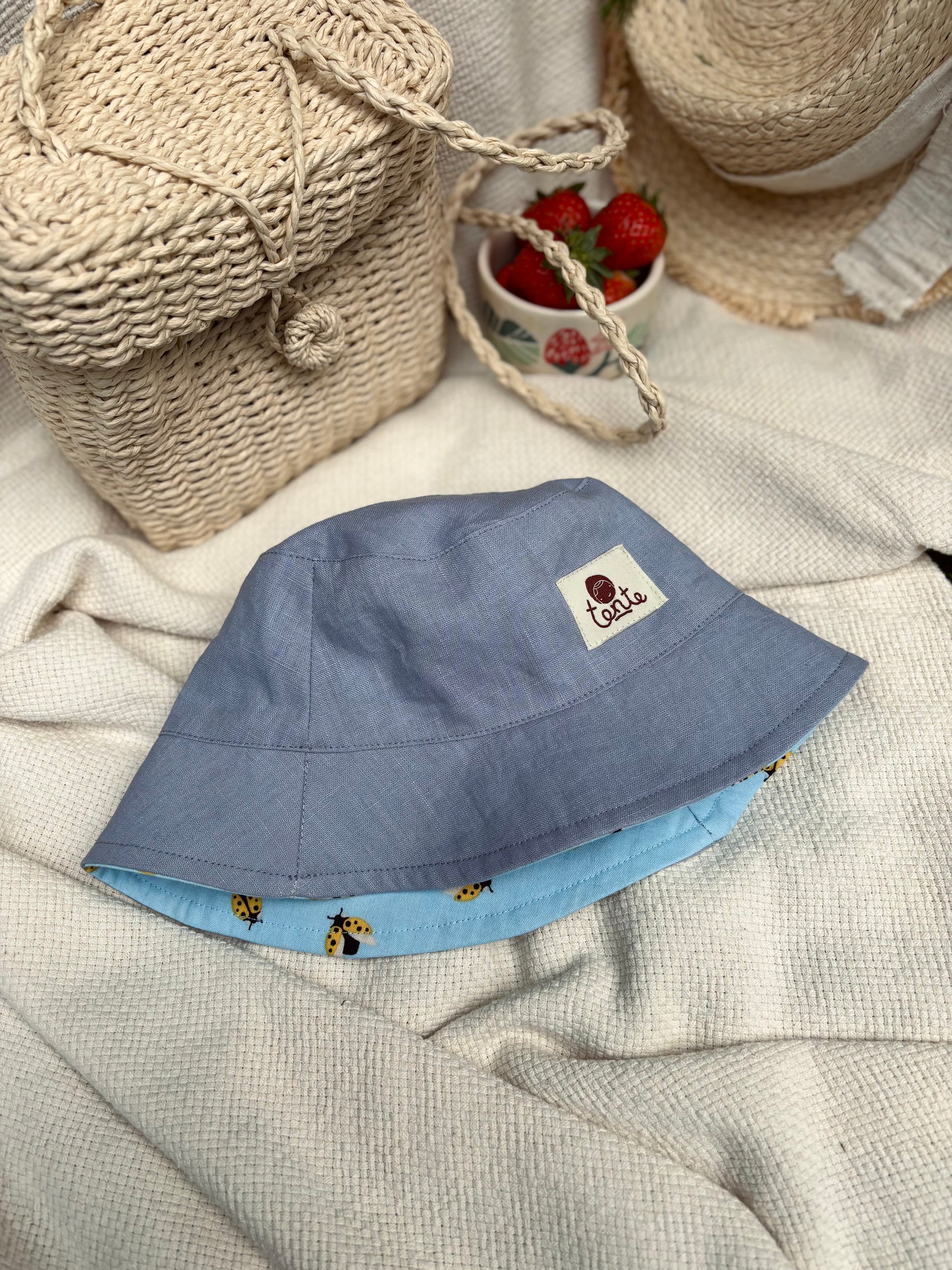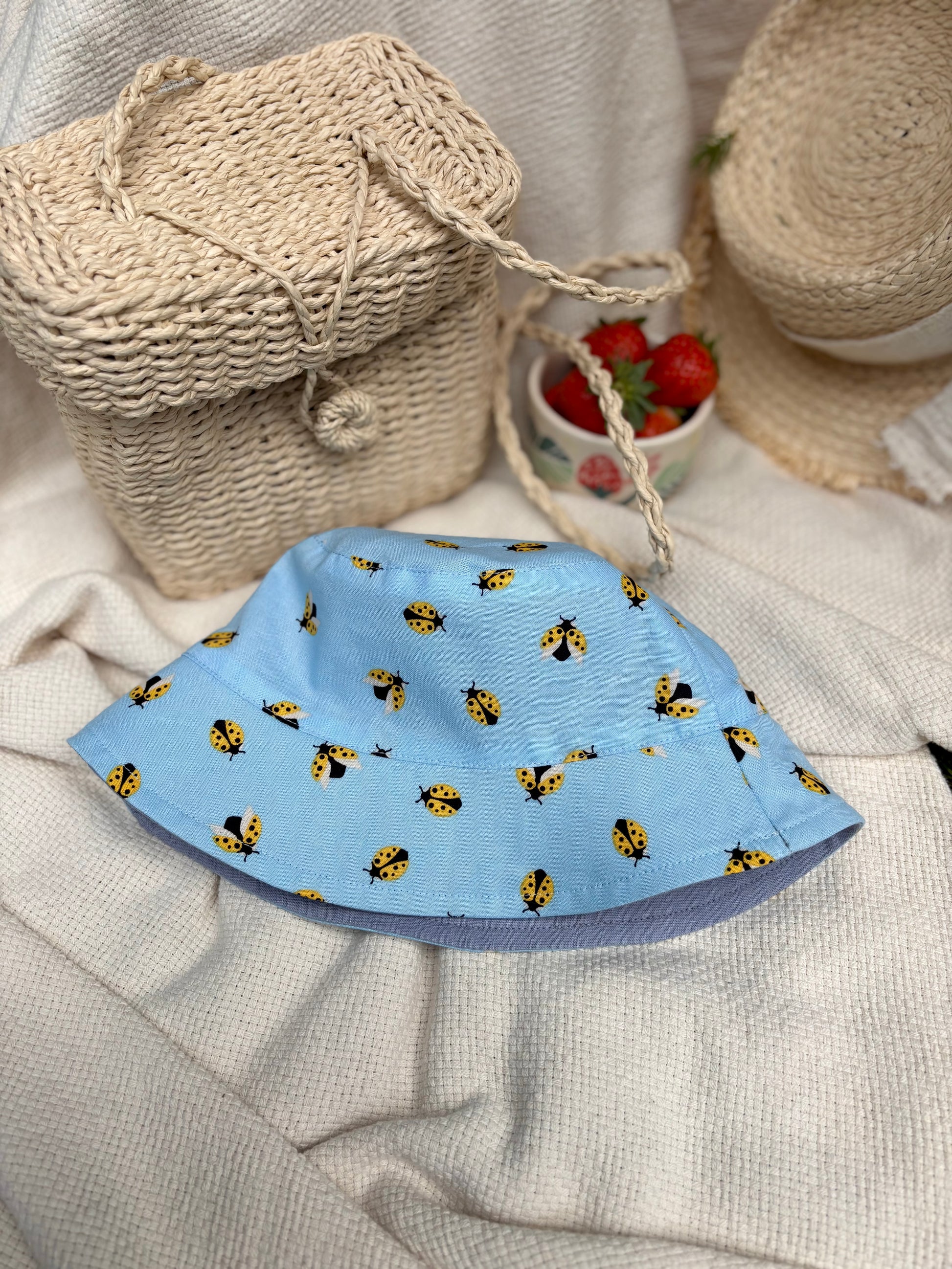 Stílus és játék egyetlen mozdulattal! A kalap egyik oldala letisztult - kék lenvászon, míg a másik oldala vidám, sárga katica mintás pamut. Könnyű, kényelmes viselet a legnaposabb nyári napokra, és minden kis kalandor ruhatárához tökéletesen illeszkedik.
