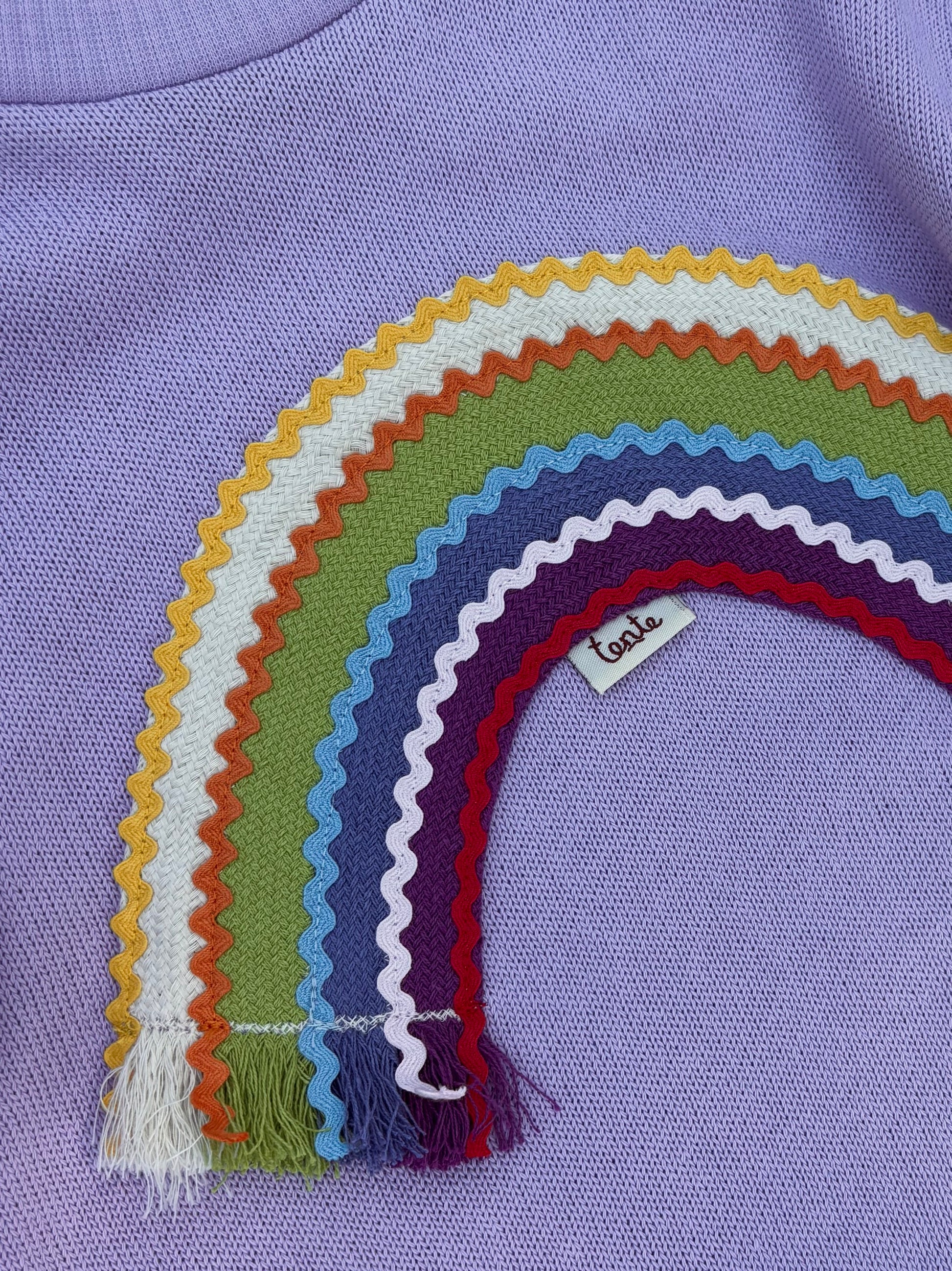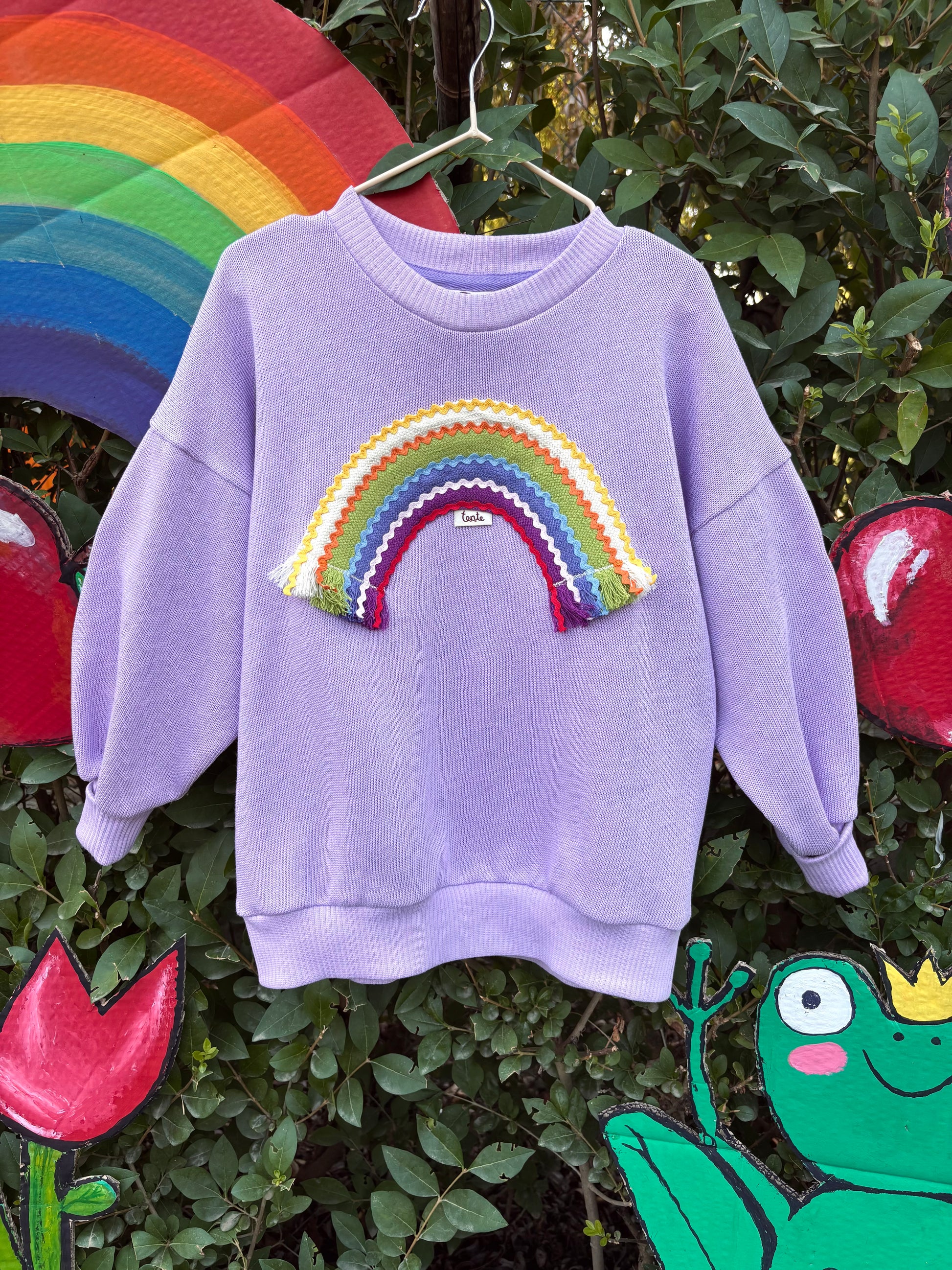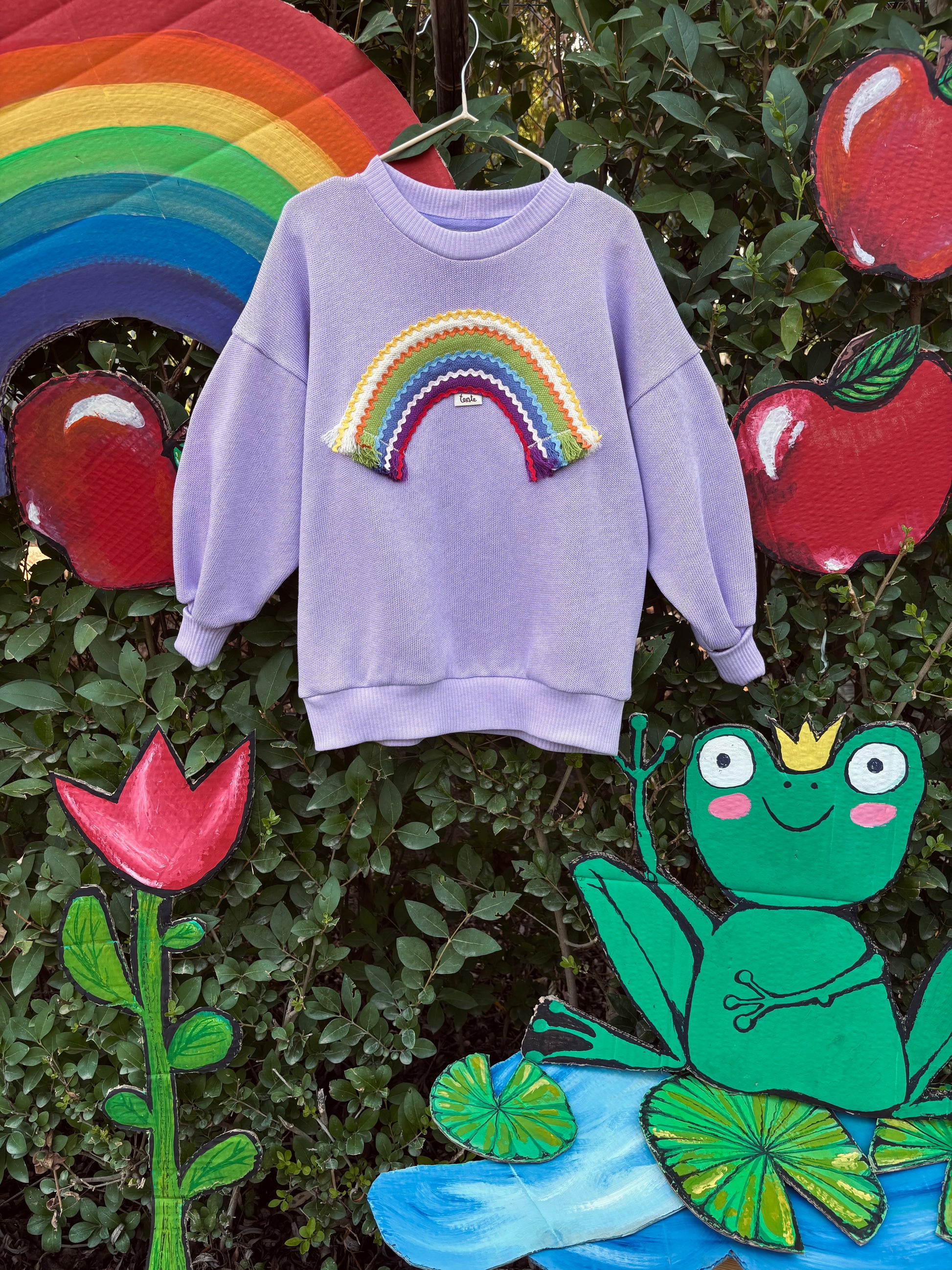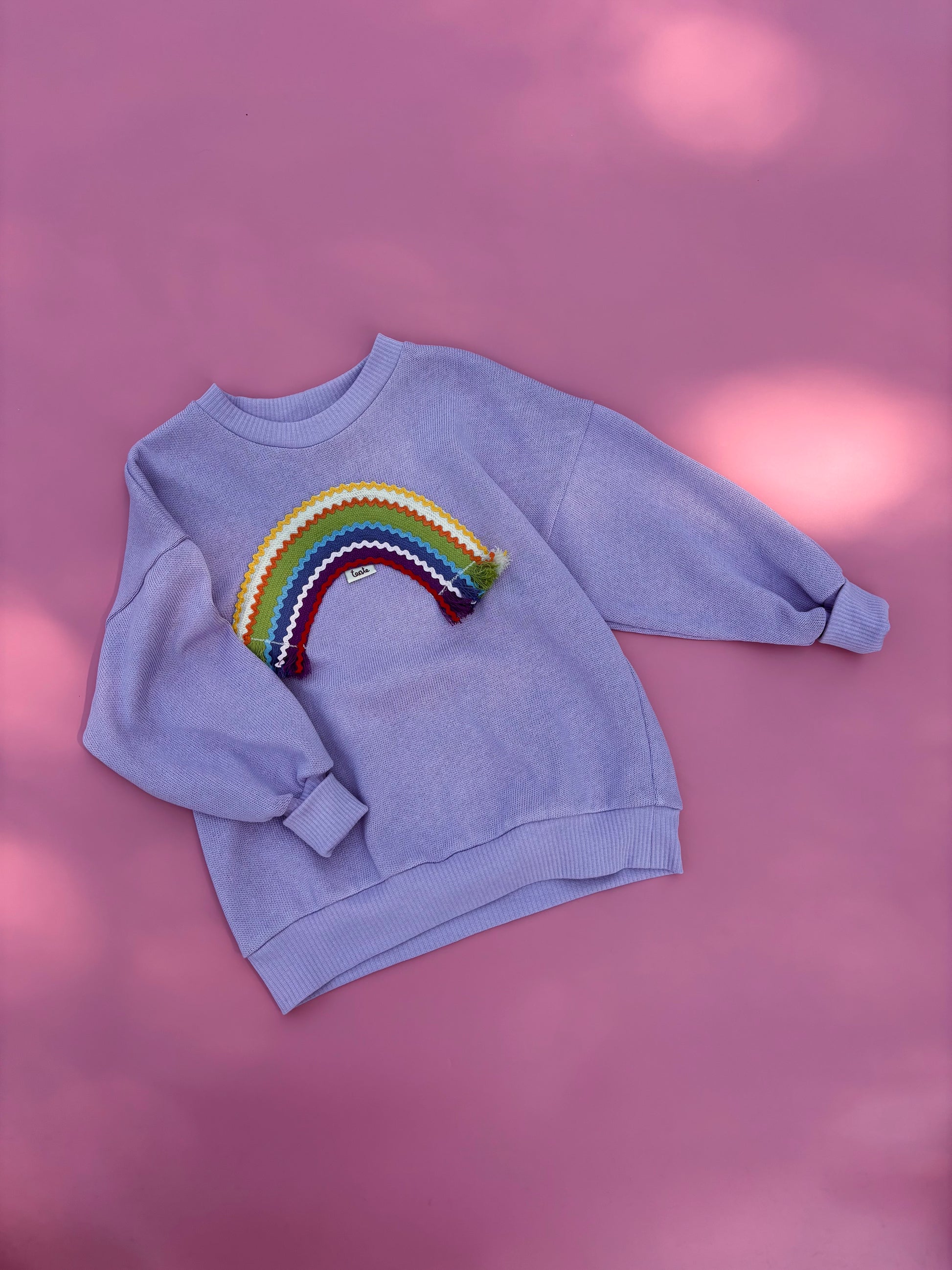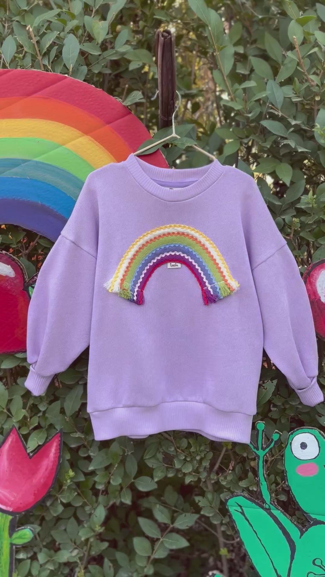 A pulóver elején a gyerekek kedvenc motívuma, egy színes, rávarrt szivárvány díszeleg, ami mosolyt csal mindenki arcára.