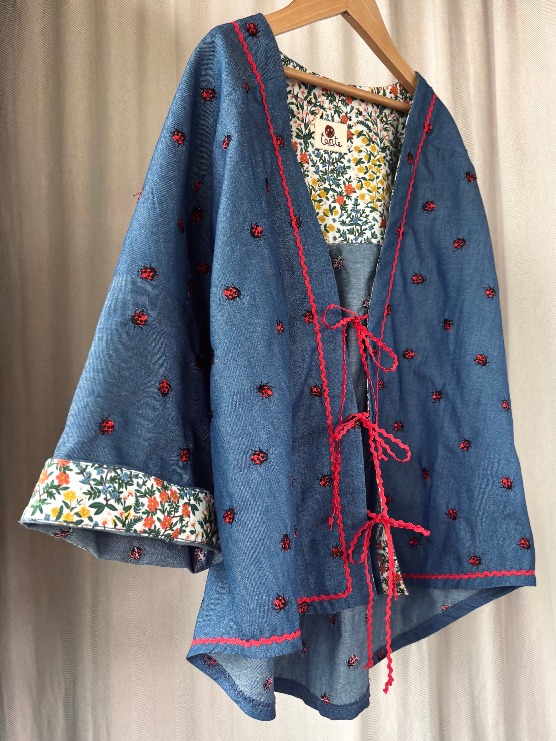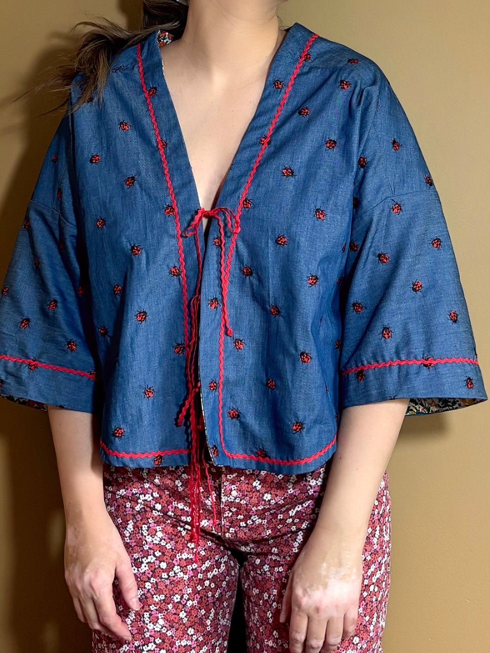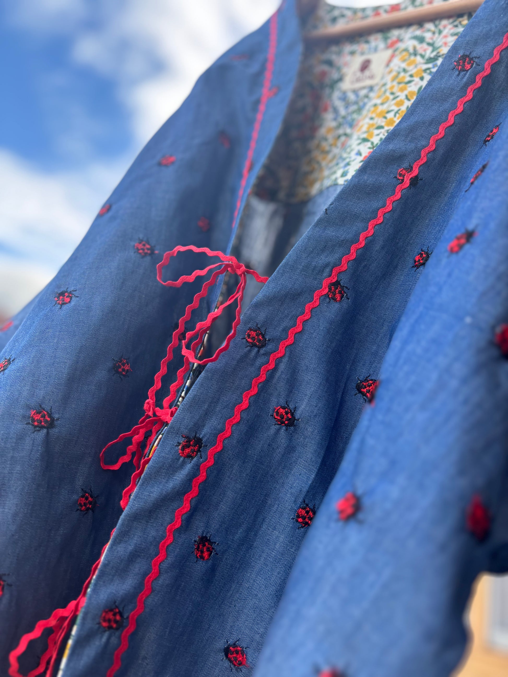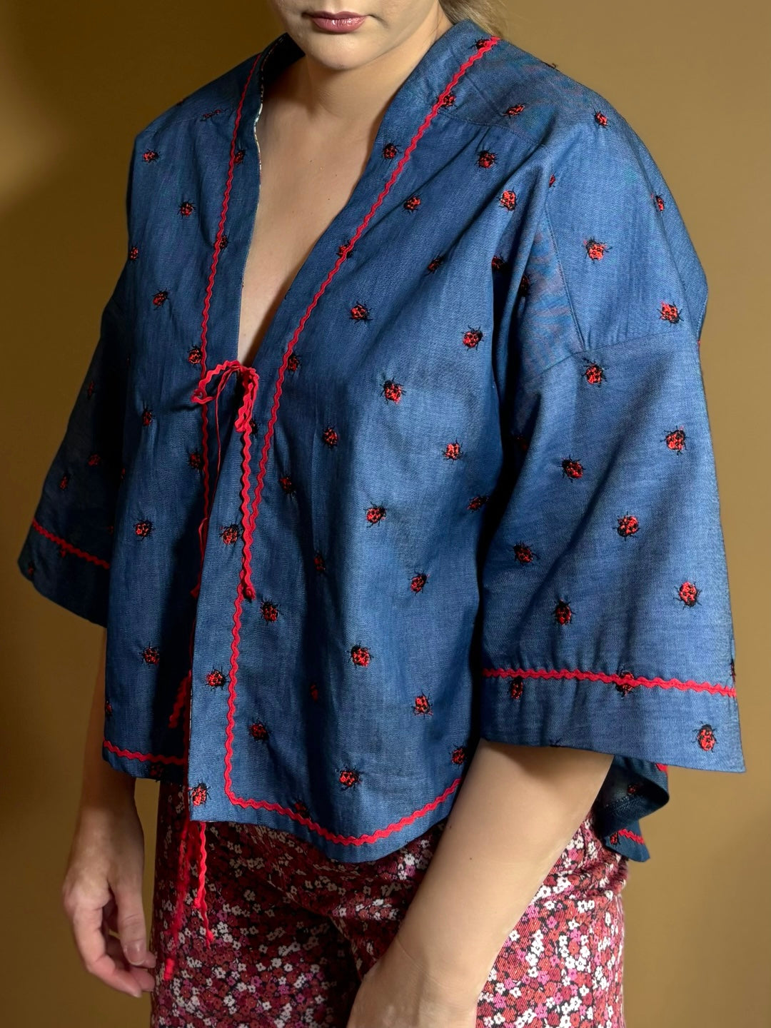 Ez a vékony, hímzett farmerdarab nemcsak kényelmes, de játékosan nőies is – mezei virágos részletekkel, piros csipkeszegéllyel és elöl megköthető, kedves masnival készült.