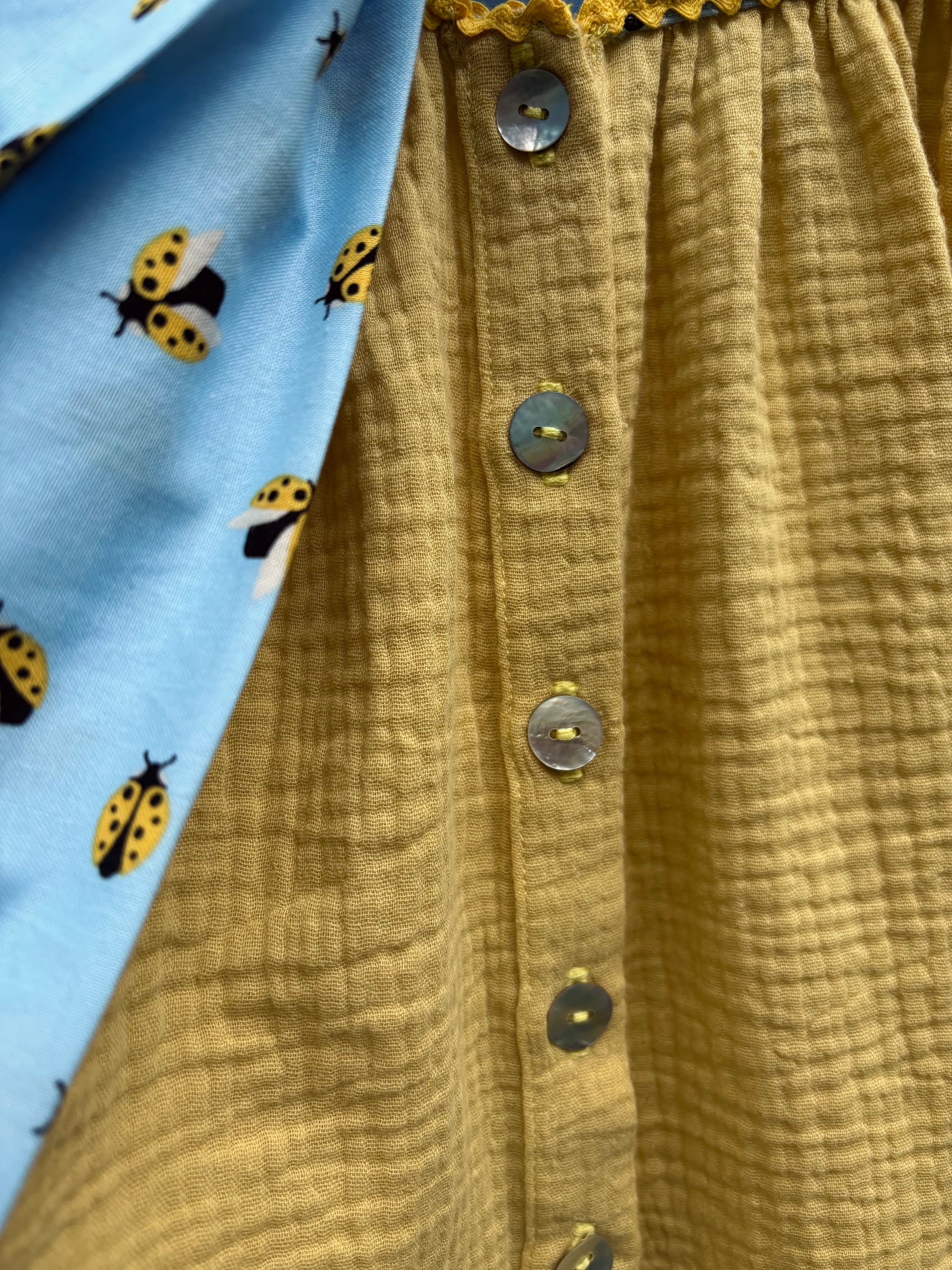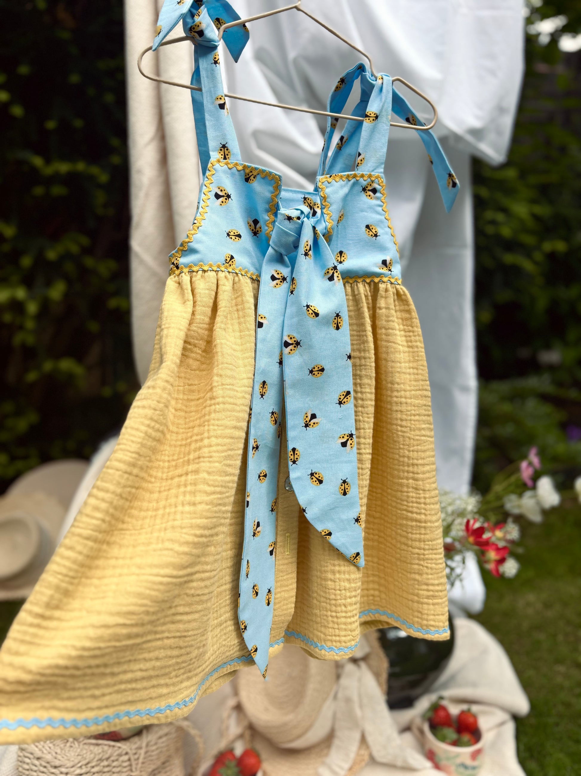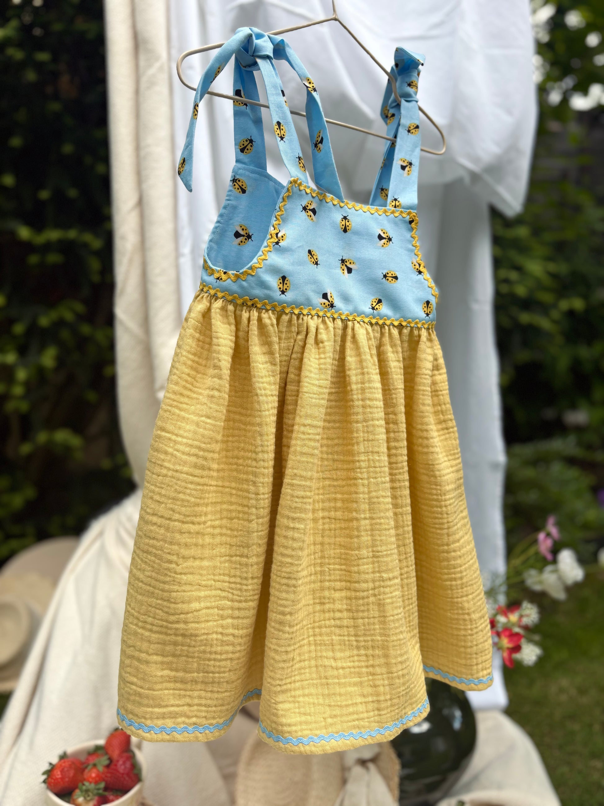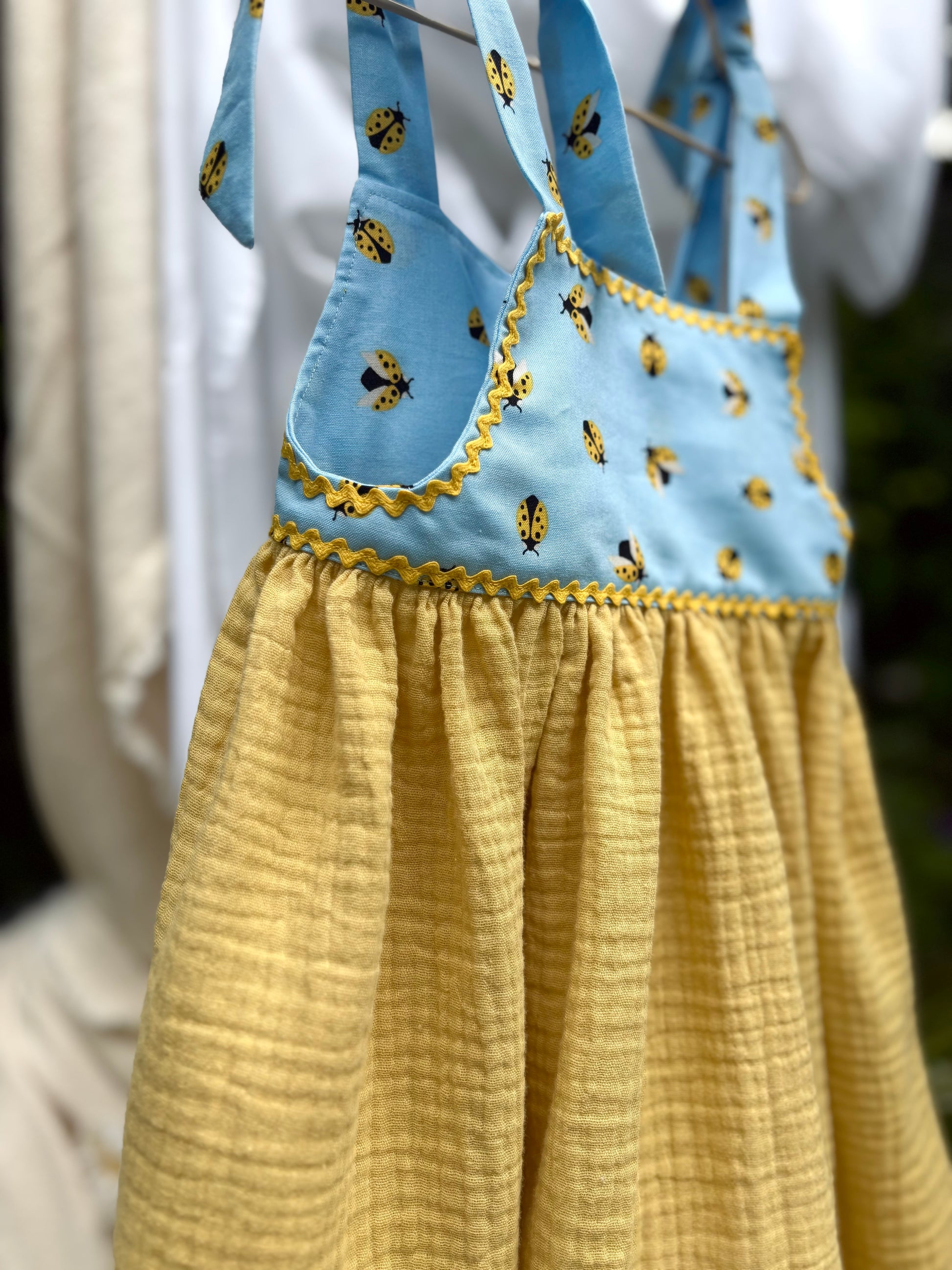 Egy lenge nyári álomruha. Szoknyarésze lágy esésű sárga színű dupla géz pamutból készült. A felsőrészt katica mintás pamutvászonból varrtuk.
