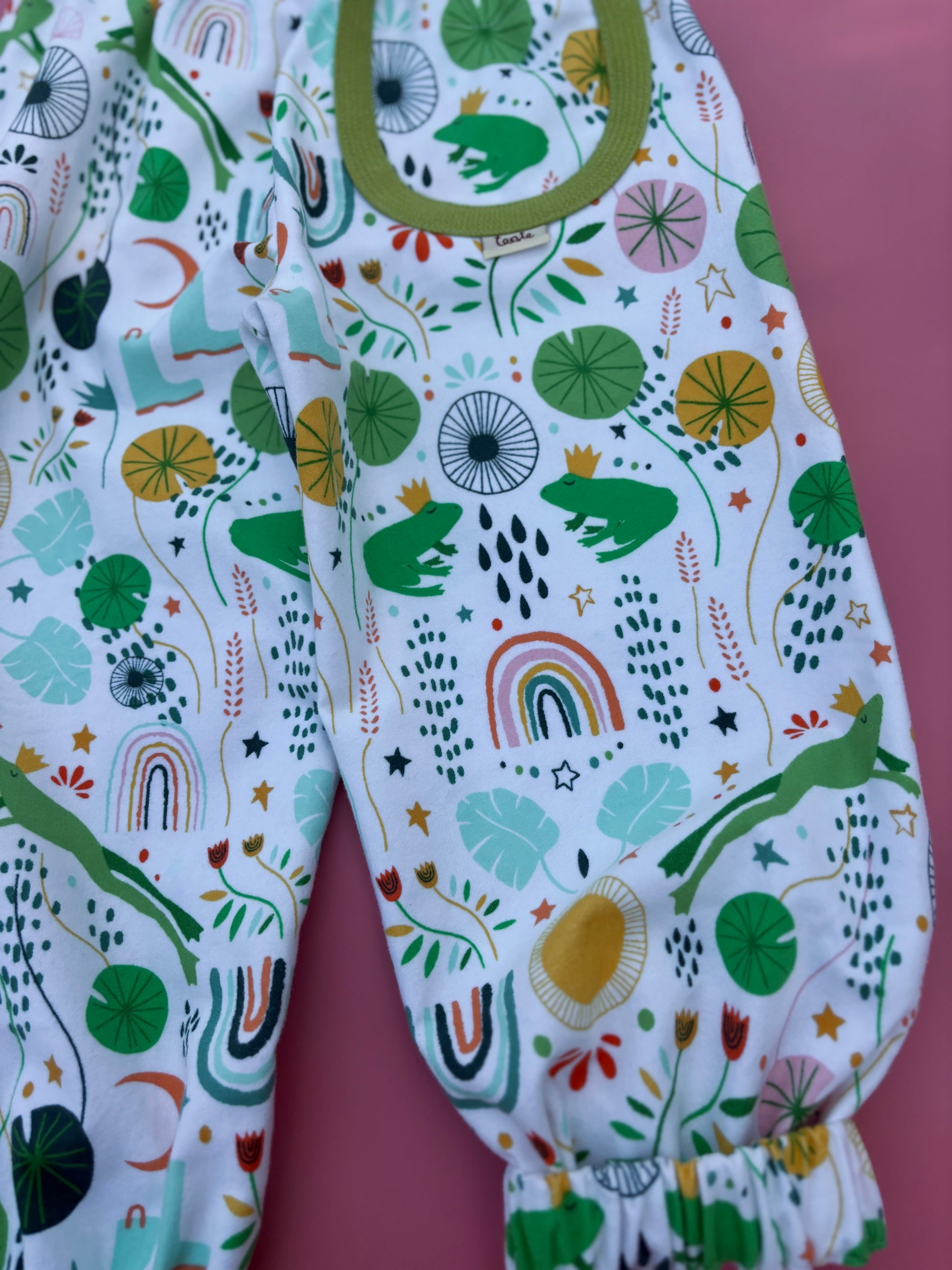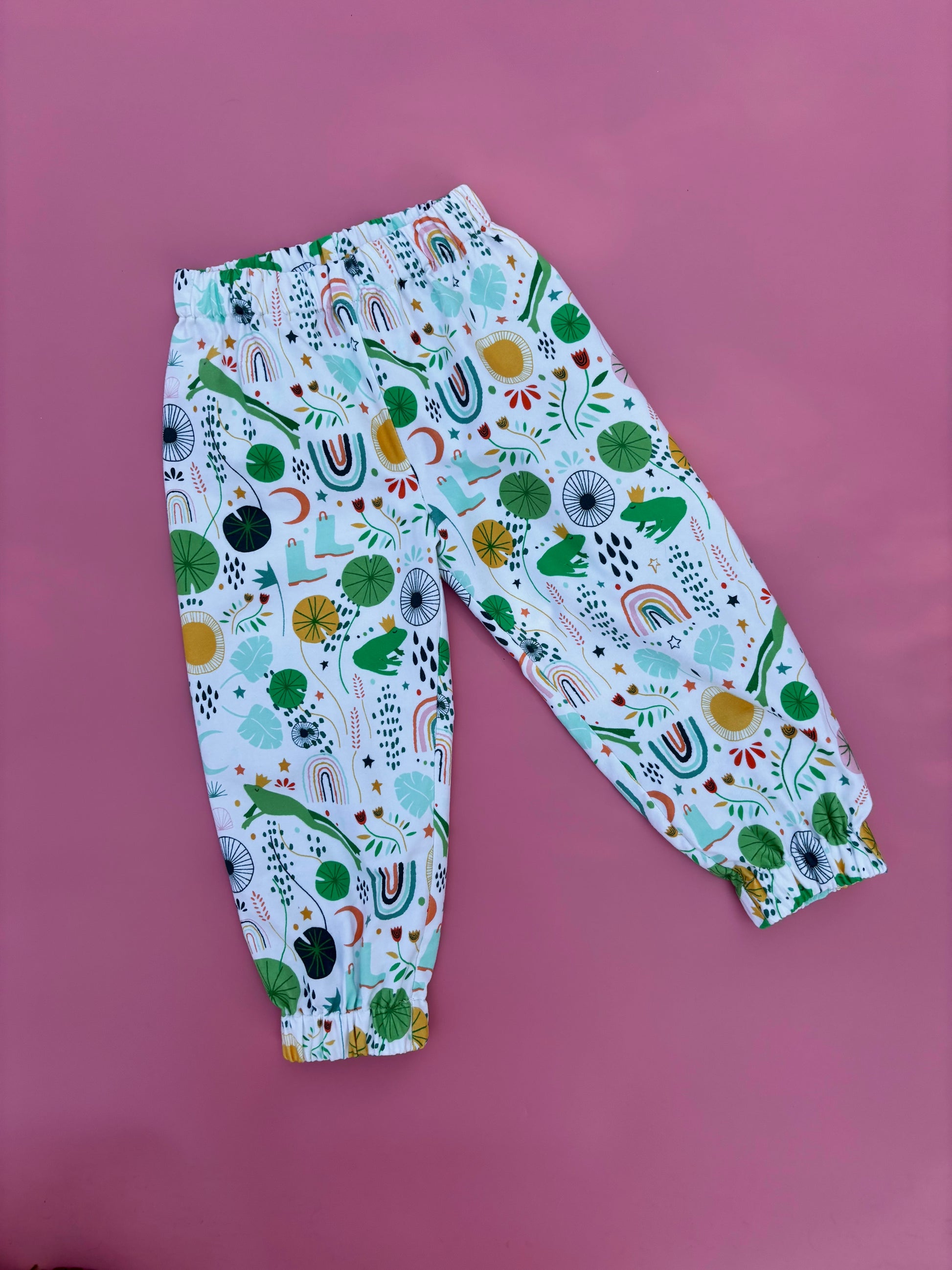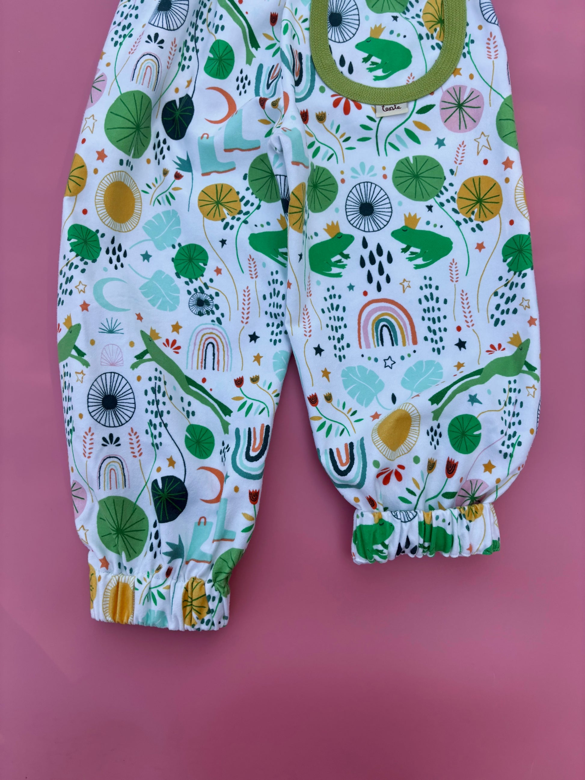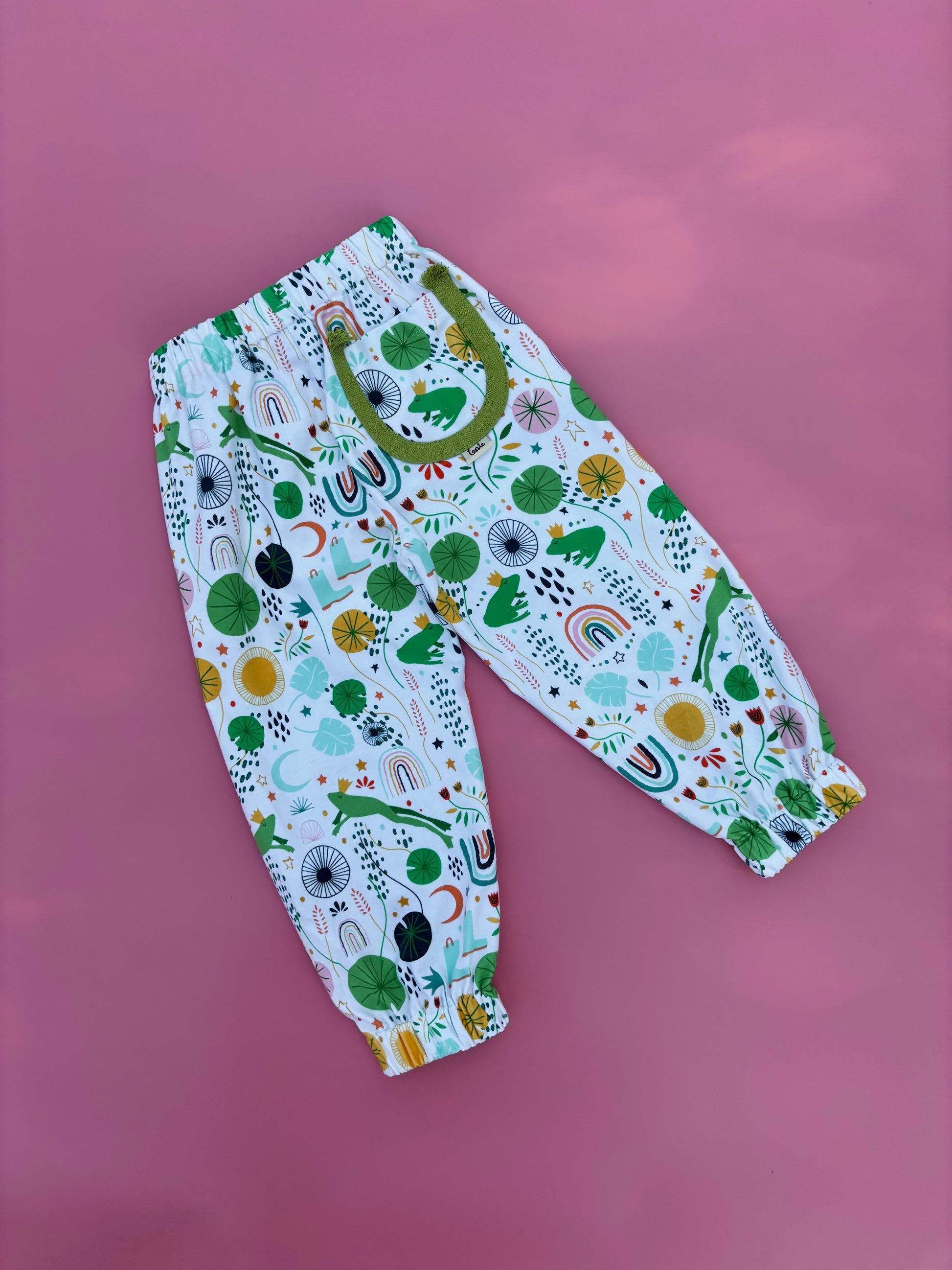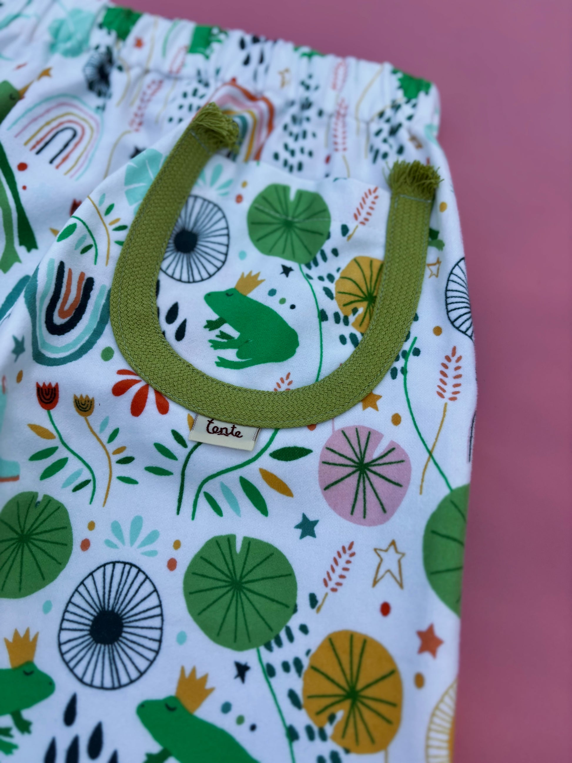 Praktikus és játékos békakirályfi mintás nadrág. Gumírozott derék- és lábszárrésszel készült, így kényelmes minden mozdulathoz. Fel- és lehajtható alja kb. 5 cm-ig igazodik a növekedéshez. Hátán egy pamut pánttal szegett zseb, ami praktikus és játékos részlet. Unisex darab, tökéletes mindennapi viseletre, játékhoz vagy óvodába.