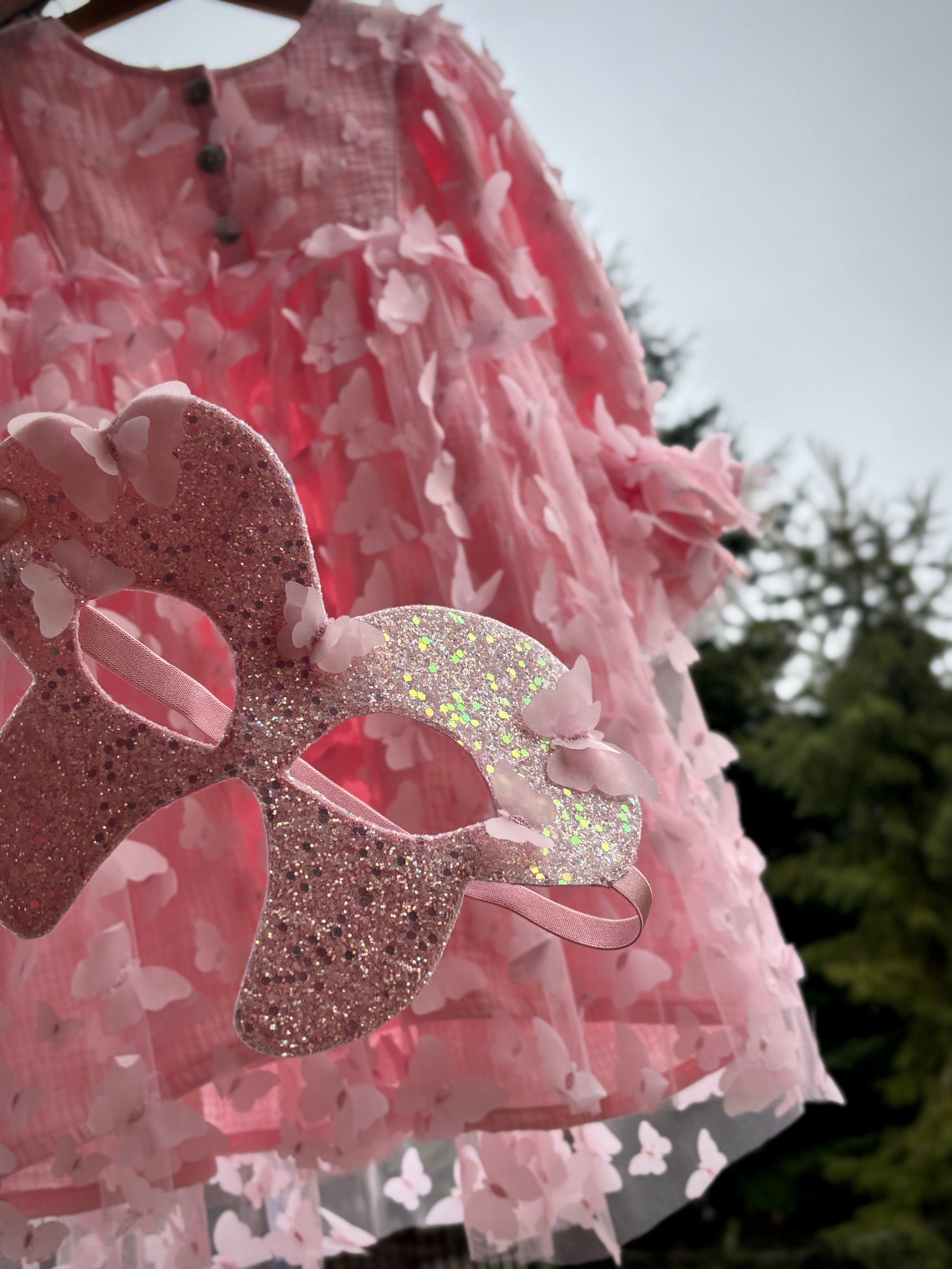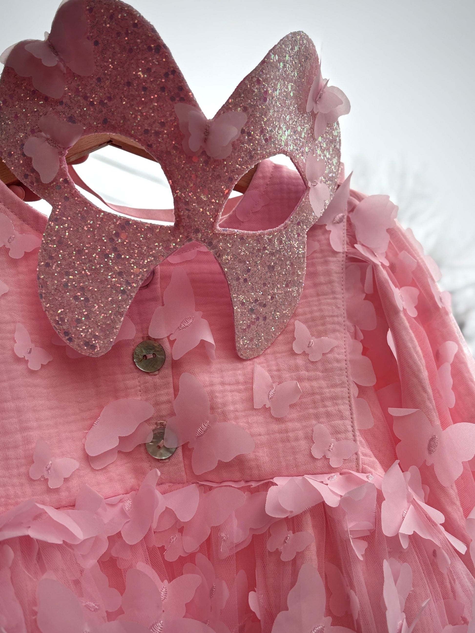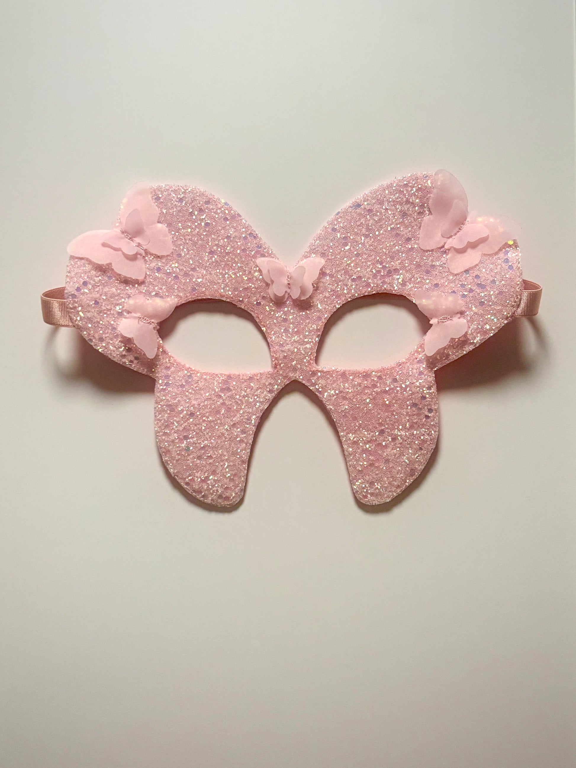 A pillangó formájú maszkot csillogó rózsaszín felület és 3D-s pillangó díszítés teszi igazán varázslatossá. Az egyméretes kialakítás és a rugalmas gumipánt gondoskodik arról, hogy a maszk kényelmesen illeszkedjen, és játék közben se mozduljon el a fejecskékről.