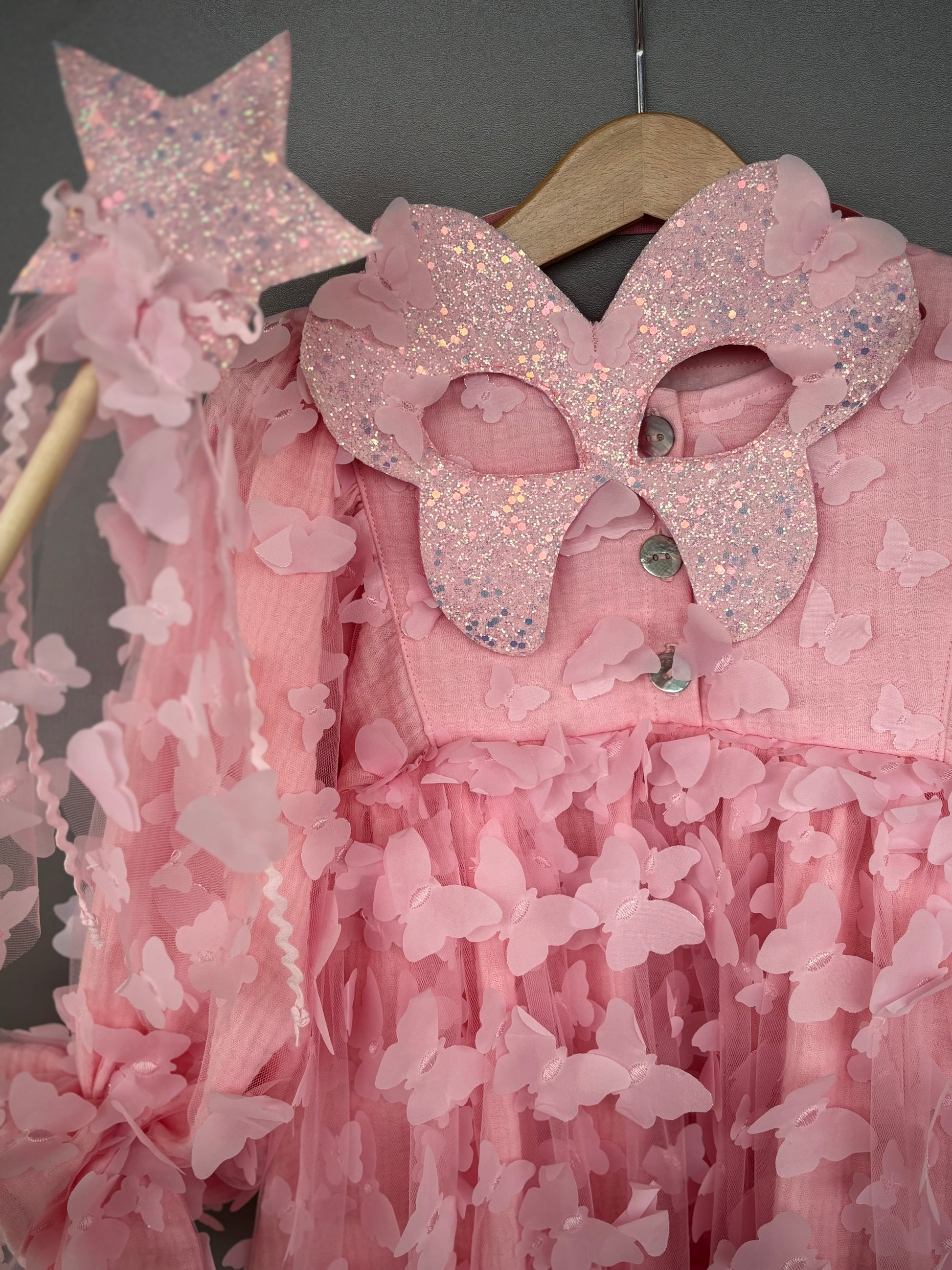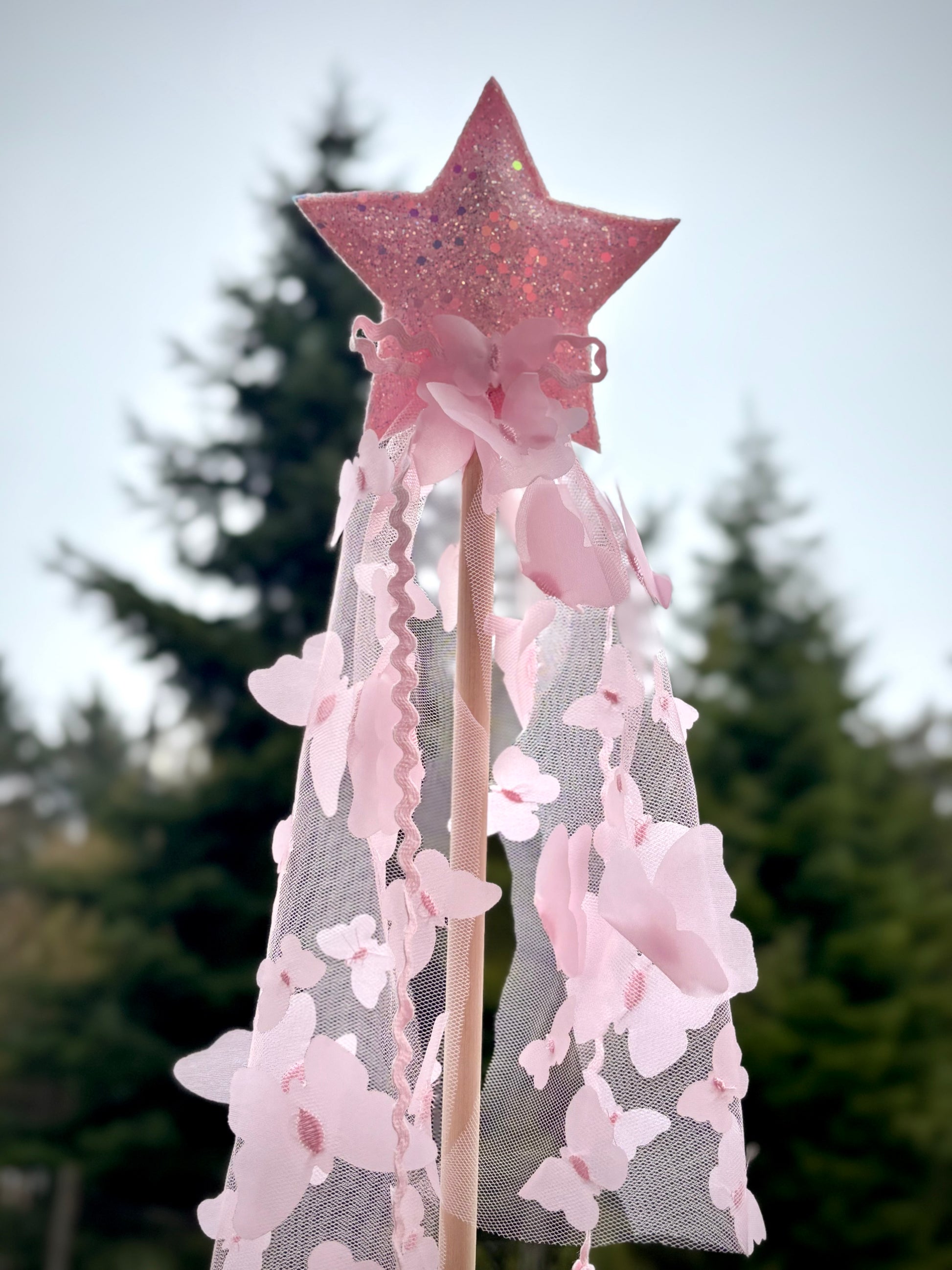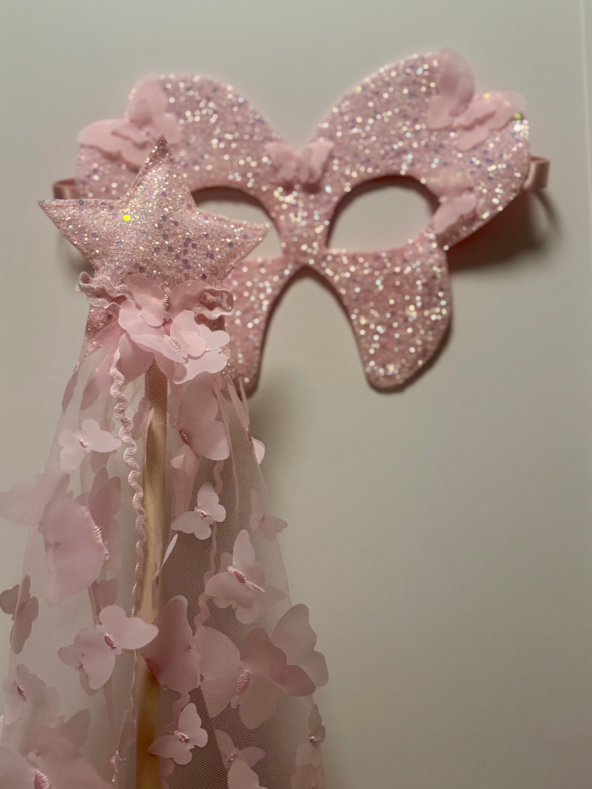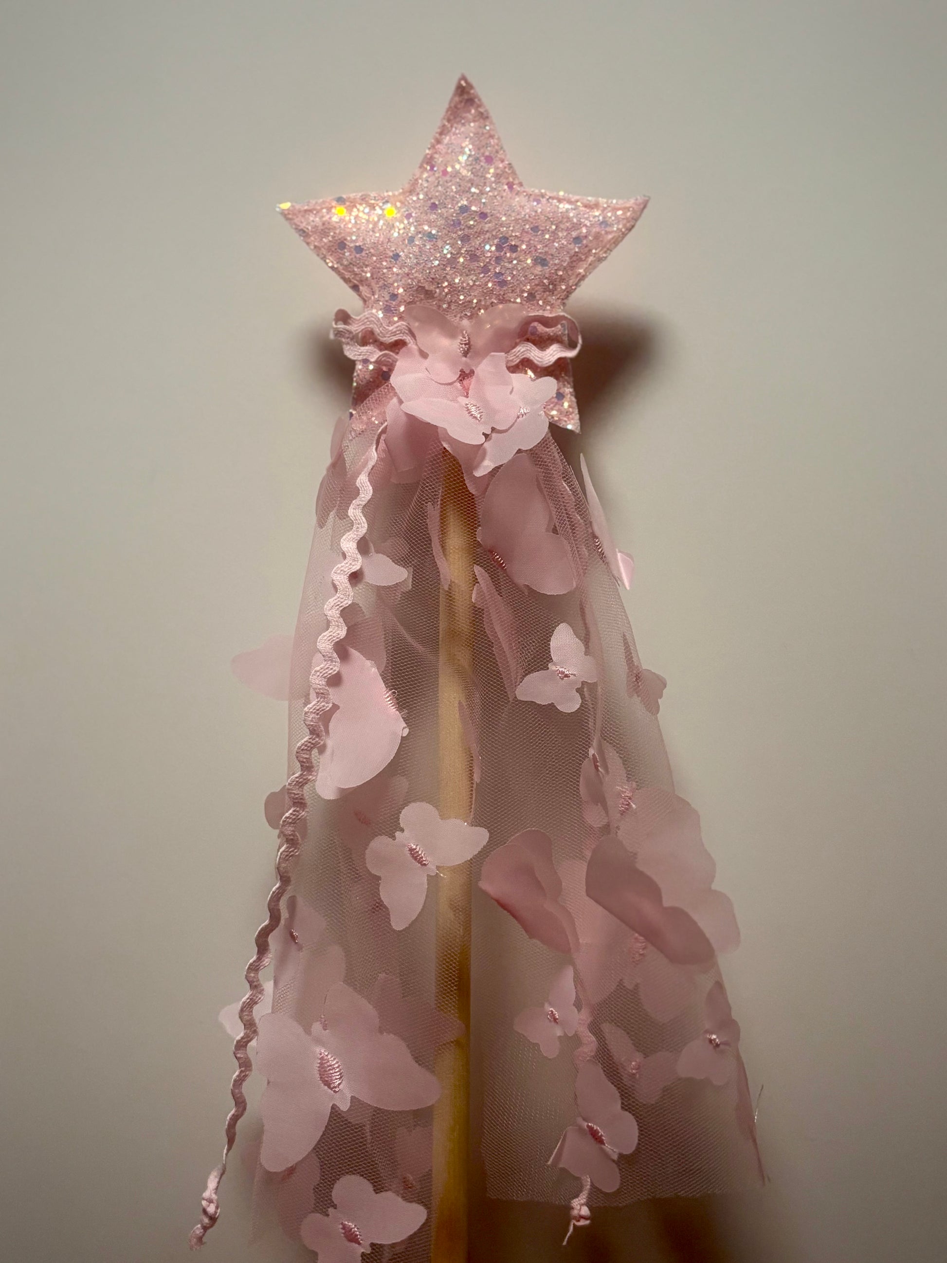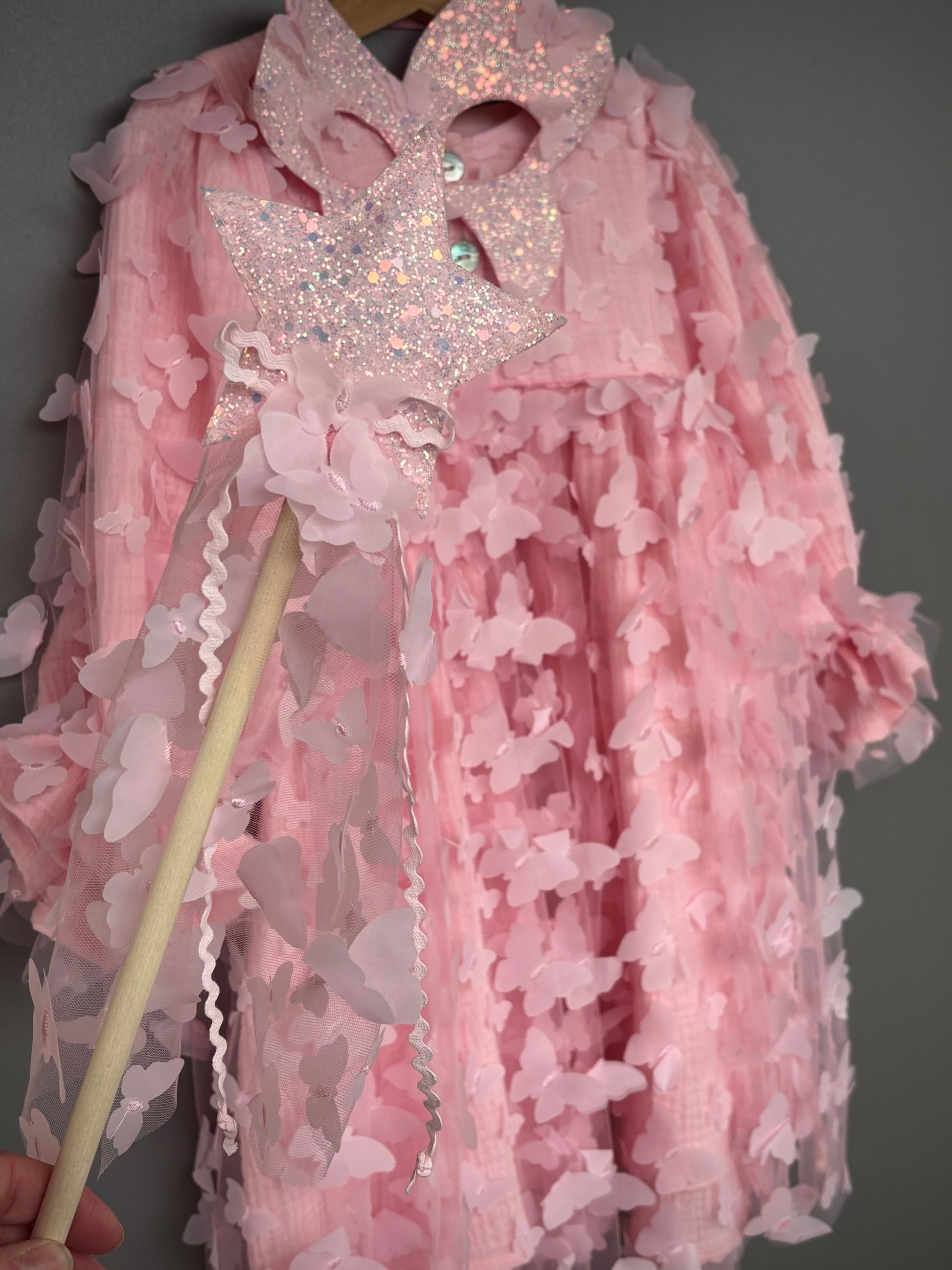 A varázspálca tökéletes kiegészítője a pillangós hercegnő ruhának, hogy a varázslat valóban teljes legyen. A pálca csillogó rózsaszín textilből és finom, pillangós tüllből készült, amely minden mozdulatnál mesésen lebben. A fa nyél természetes tapintású, könnyen megfogható, így a kisebb hercegnők számára is kényelmes viselet játék közben. Ideális választás farsangra, jelmezes játékhoz, de a mindennapi szerepjátékok elengedhetetlen kelléke is lehet.
