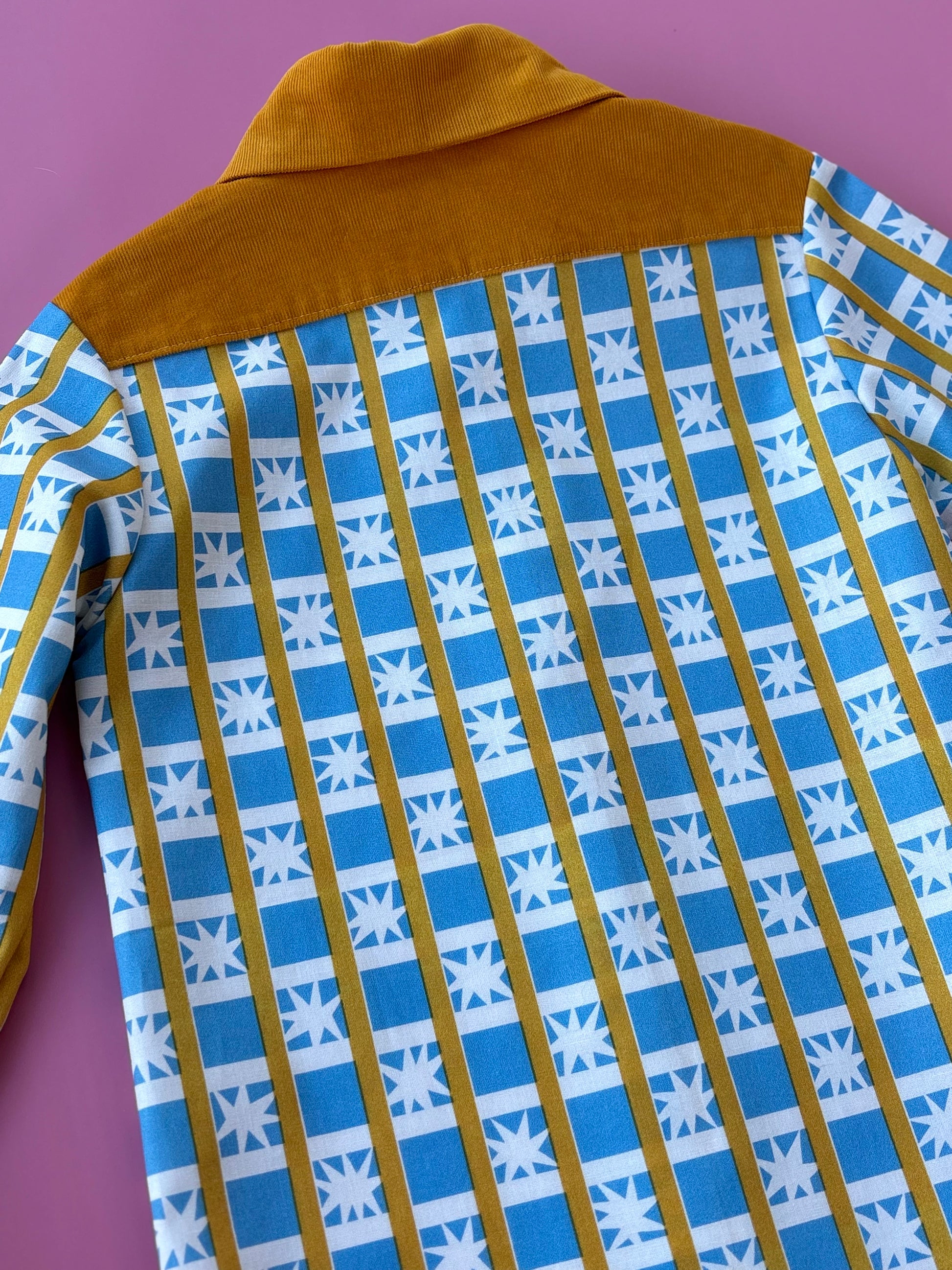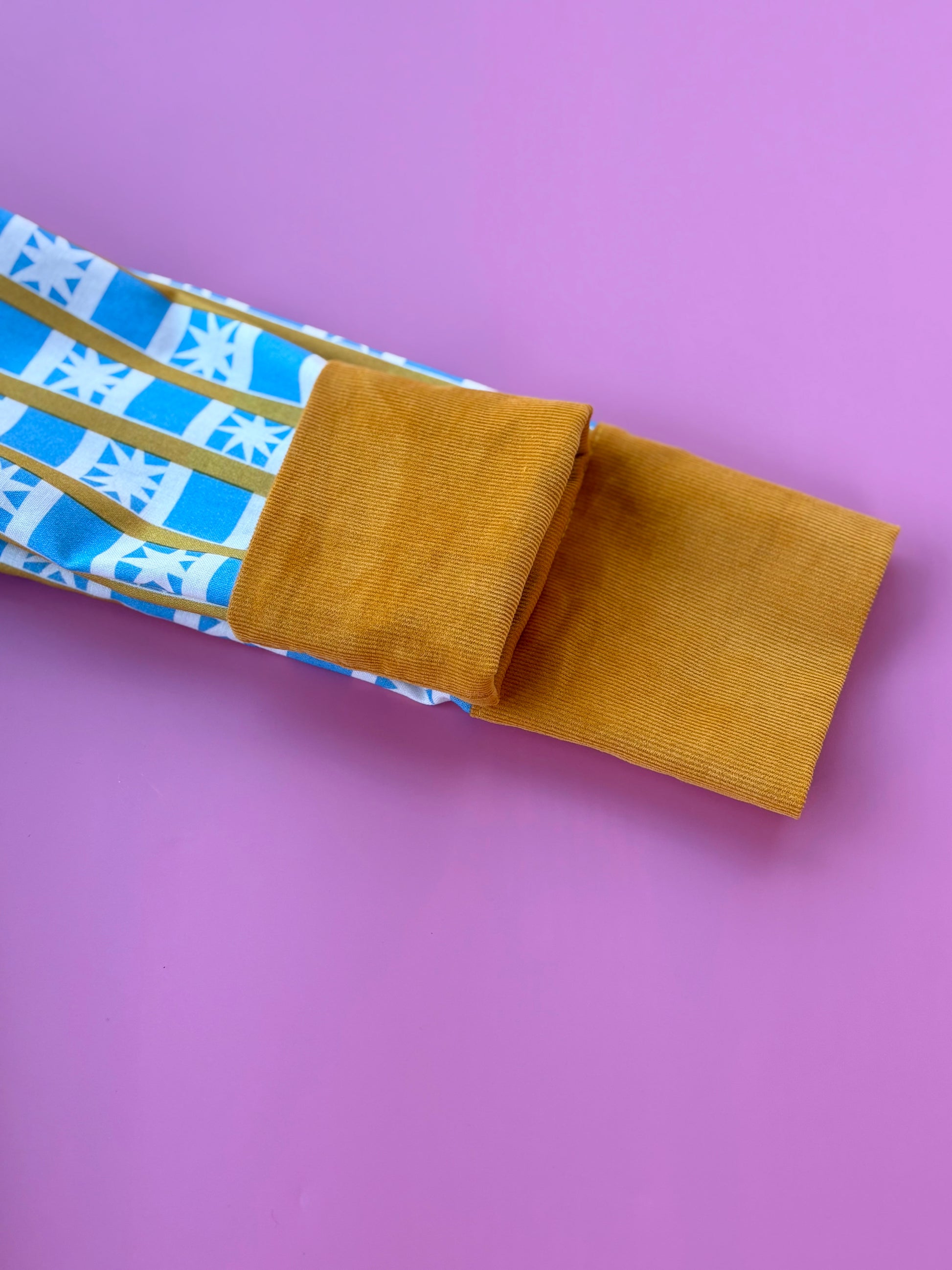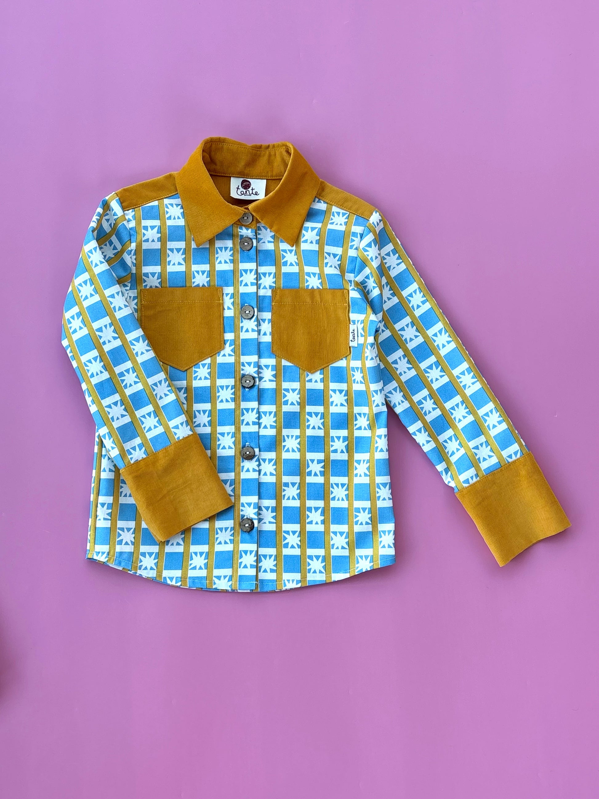 A kék–sárga színvilág és a csillag minta látványos, karakteres megjelenést ad az ingnek, miközben a puha pamut anyag kényelmes viseletet biztosít egész nap. A kókusz gombos záródás természetes részlet, az állítható ujjhossz pedig praktikus megoldás, hogy az ing hosszabb ideig hordható legyen.