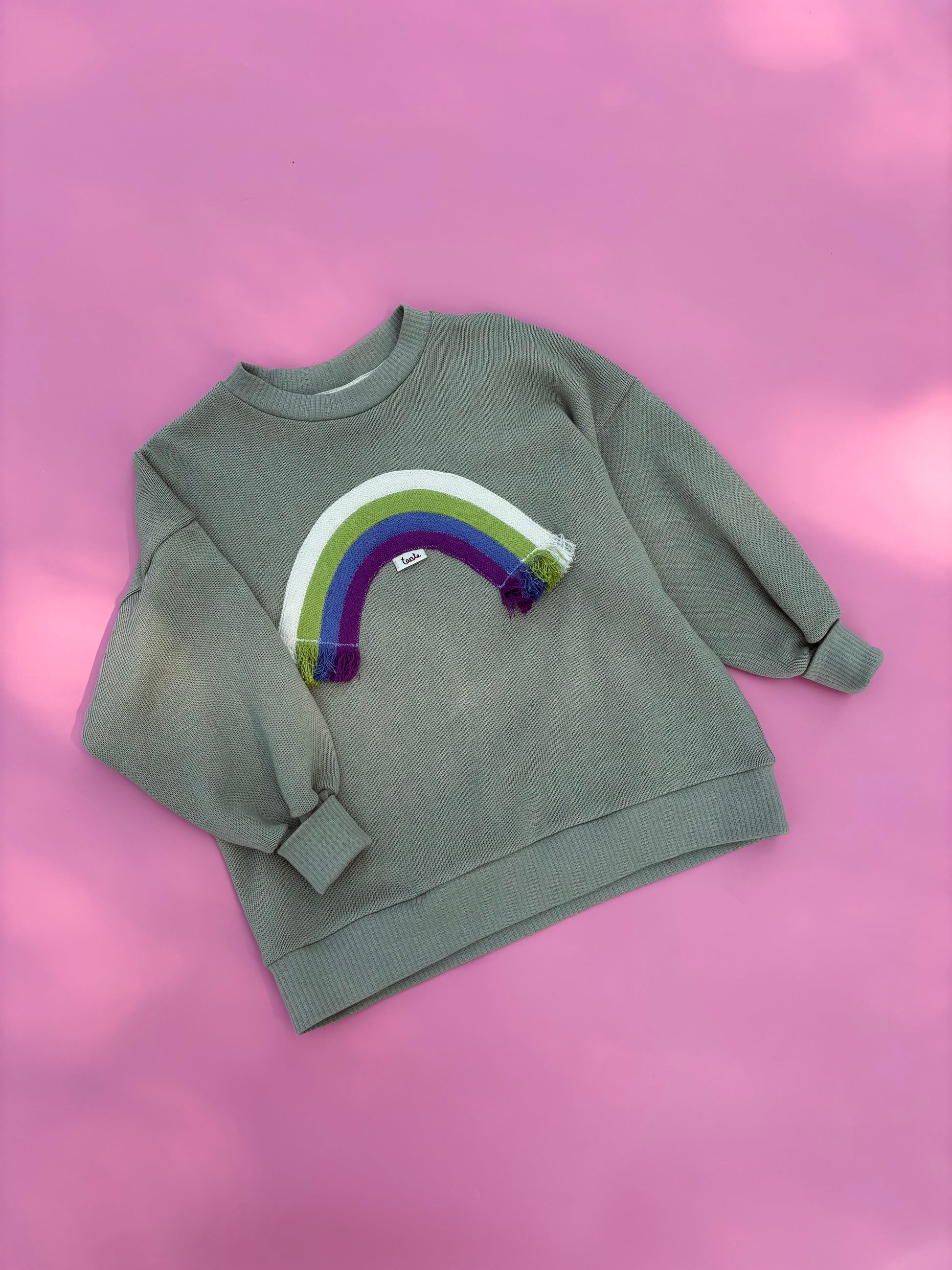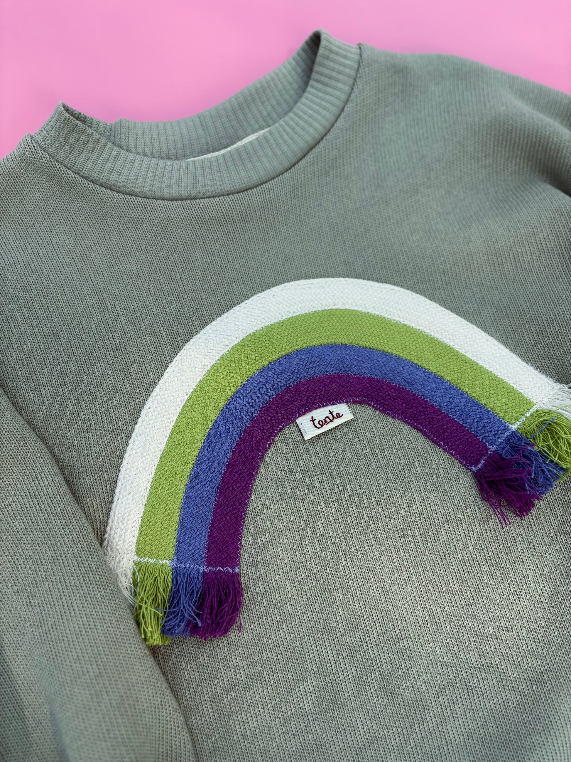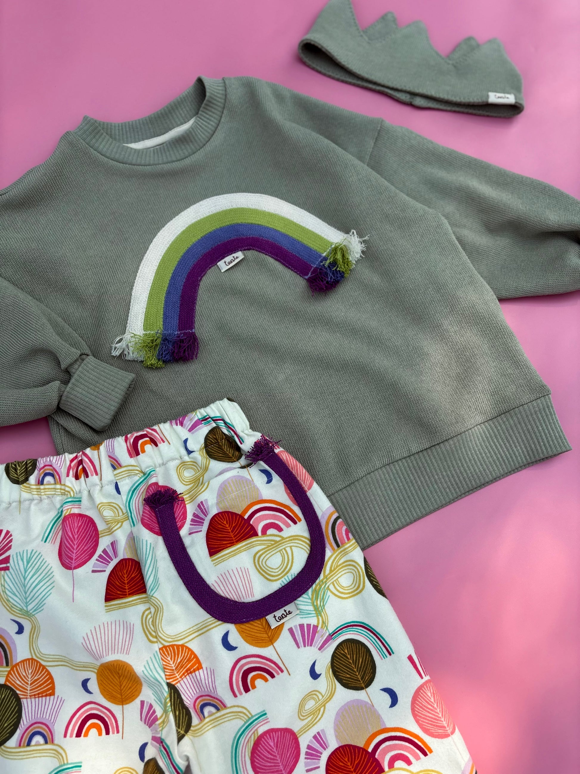 A pulóver elején a gyerekek kedvenc motívuma, egy színes, rávarrt szivárvány díszeleg, ami mosolyt csal mindenki arcára.