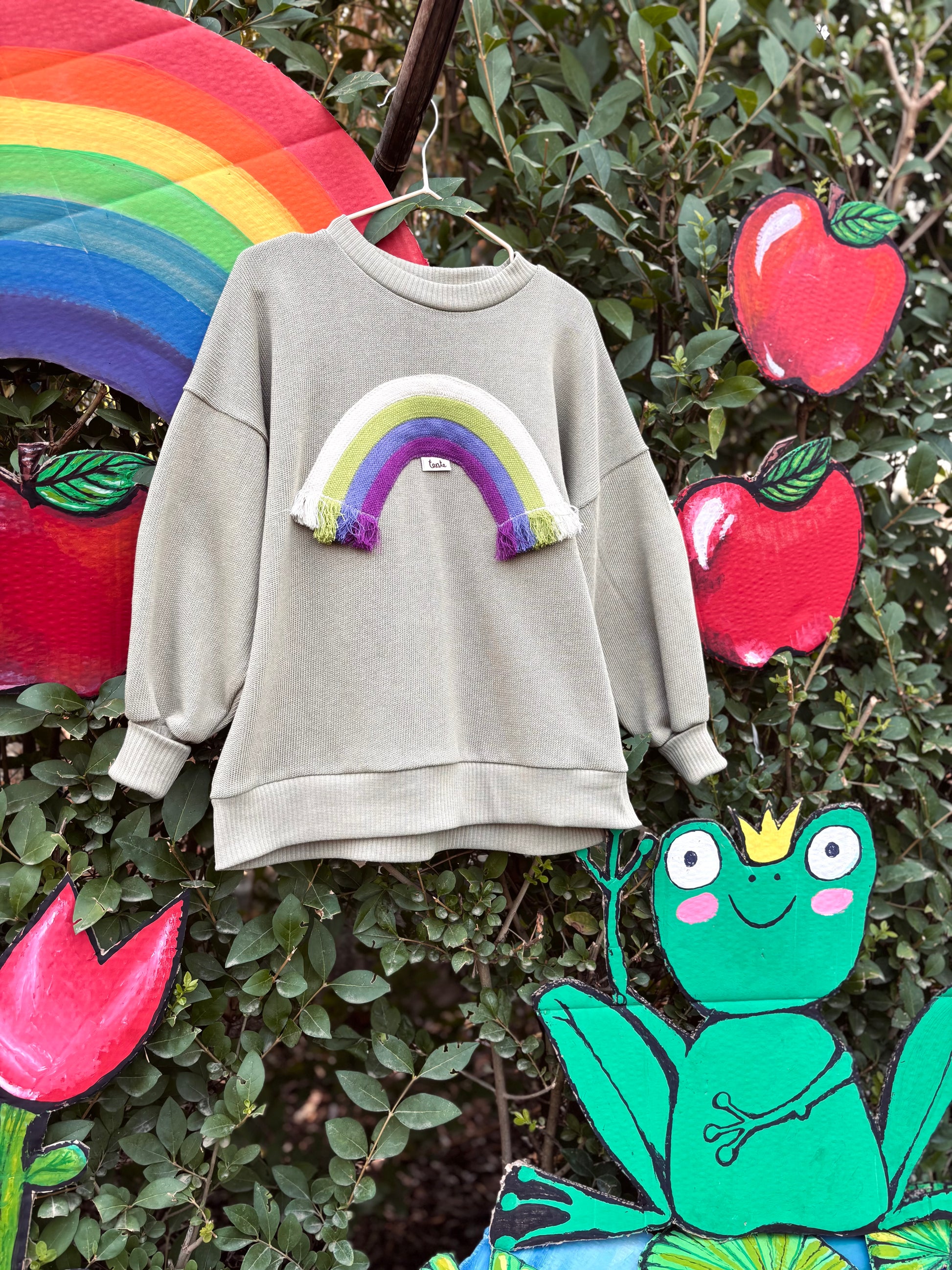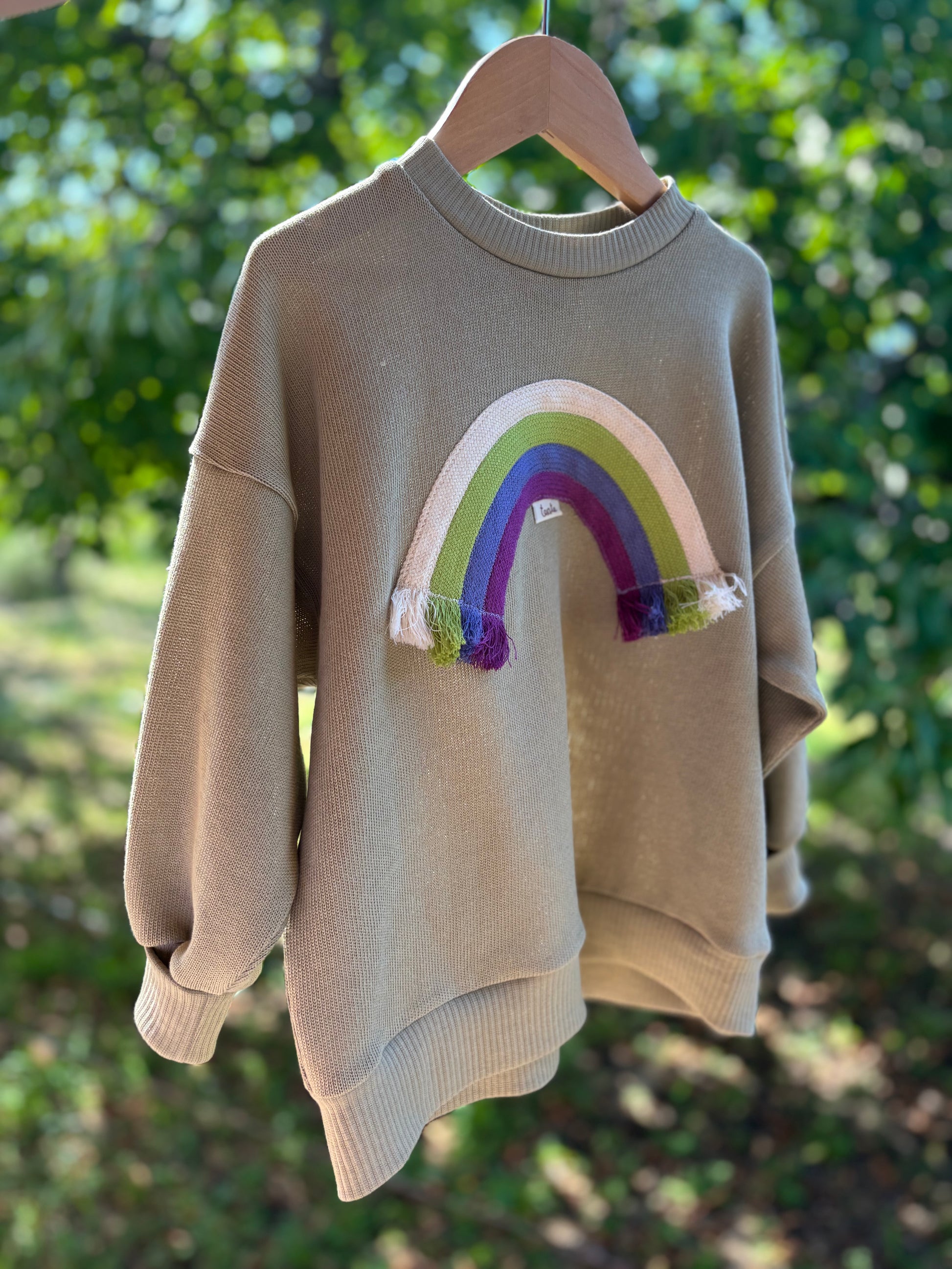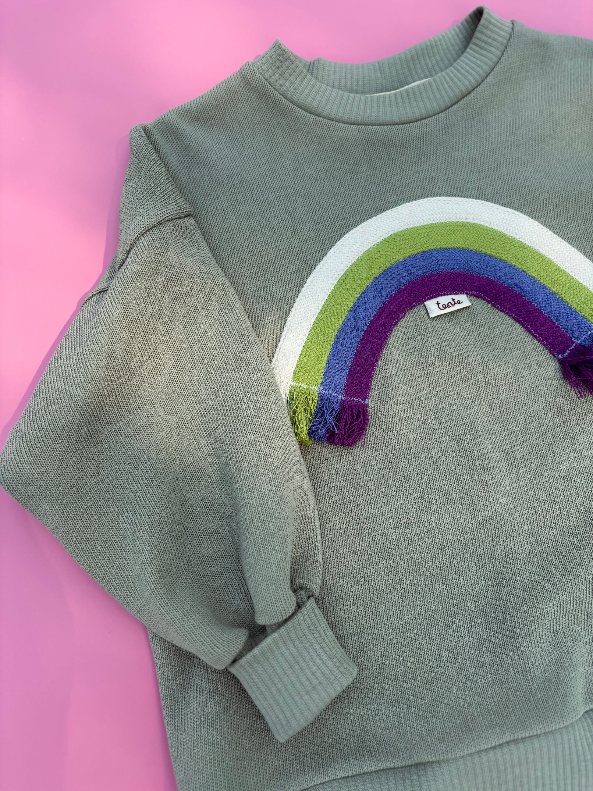 A pulóver elején a gyerekek kedvenc motívuma, egy színes, rávarrt szivárvány díszeleg, ami mosolyt csal mindenki arcára.